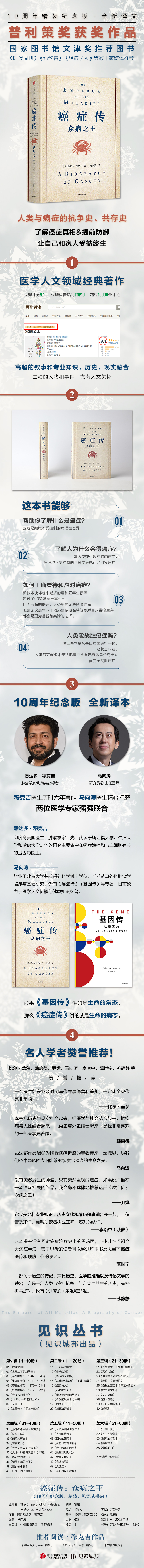 第一章 “血液化脓” 003 第二章 黑暗深渊 014 第三章 凤凰涅槃 027 第四章 神秘瘟疫 033 第五章 体液学说 043 第六章 走下神坛 048 第七章 “遥表同情” 052 第八章 根治主义 058 第九章 隐形射线 072 第十章 化学魔弹 079 第十一章 巴里事件 089 第十二章 慈行善举 094 第十三章 吉米之屋 103 第二部分 缺乏耐心的战争 107 第十四章 癌症协会 109 第十五章 “新生力量” 119 第十六章 “屠宰场” 132 第十七章 初步胜利 140 第十八章 小鼠医生 145 第十九章 VAMP 方案 149 第二十章 霍奇金病 158 第二十一章 整体治疗 171 第二十二章 本末倒置 181 第二十三章 “登月计划” 191 第三部分 “如果我没有好转,你会把我赶走吗?” 203 第二十四章 “我们信仰上帝,其他(必须)源自数据” 205 第二十五章 盲目乐观 215 第二十六章 知己知彼 224 第二十七章 辅助化疗 233 第二十八章 癌症统计 243 第四部分 预防就是治疗 253 第二十九章 “黑色棺材” 255 第三十章 皇帝的新装 261 第三十一章 “夜贼” 269 第三十二章 “警告声明” 278 第三十三章 危险因素 297 第三十四章 “天罗地网” 308 第三十五章 STAMP 328 第三十六章 地图与降落伞 345 第五部分 基因蓝图,自我扭曲 359 第三十七章 “共同病因” 361 第三十八章 “癌症病毒” 375 第三十九章 “猎杀 sarc” 384 第四十章 突变假说 392 第四十一章 风险预测 399 第四十二章 癌症标志 414 第六部分 渐进发展,颠覆改变 423 第四十三章 “努力绝非徒劳无功” 425 第四十四章 旧病新药 436 第四十五章 万缕之城 444 第四十六章 同情用药 457 第四十七章 乘胜追击 465 第四十八章 红桃皇后 477 第四十九章 山外有山 484 阿托莎之战 497 致 谢 509 悉达多·穆克吉访谈录 513 术语参考释义 527 推jian阅读 531 图片来源 537 注释 539 译者注记 599- 中信出版社