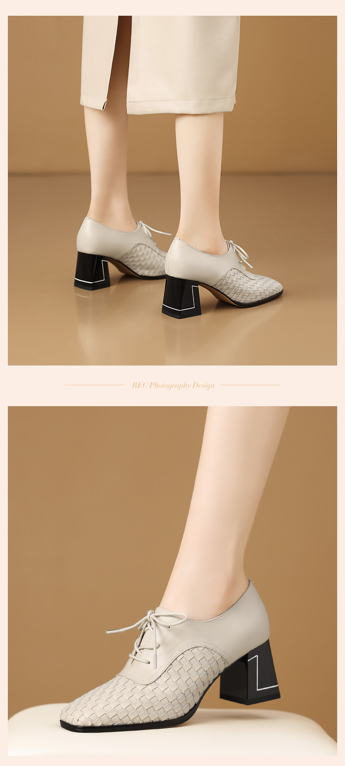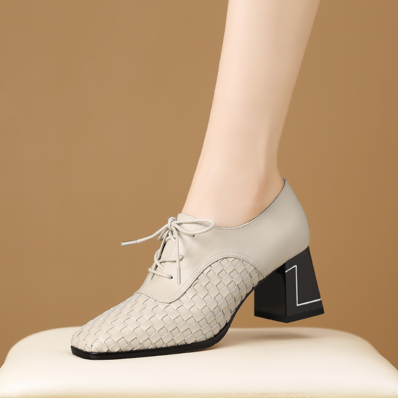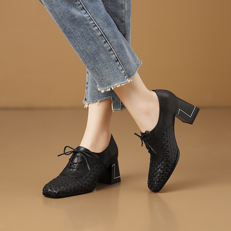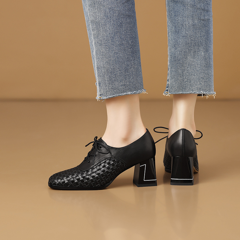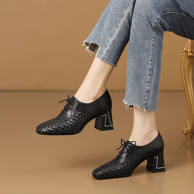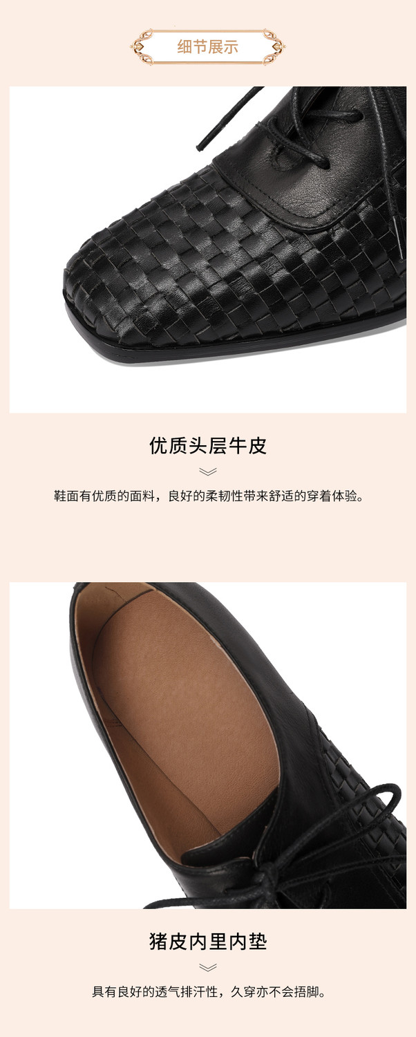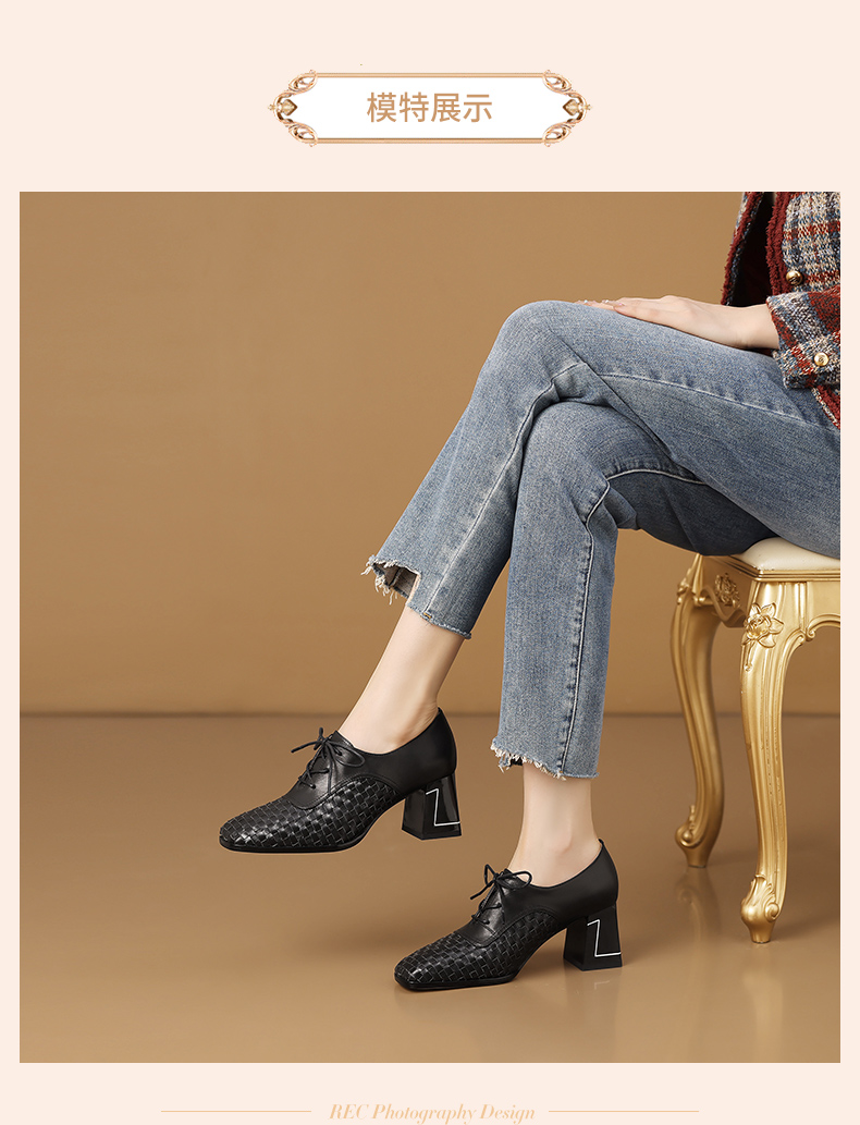 【预售5天】法式复古真皮编织系带小皮鞋女春秋新款粗跟方头深口单鞋高跟女鞋HY&H3721
