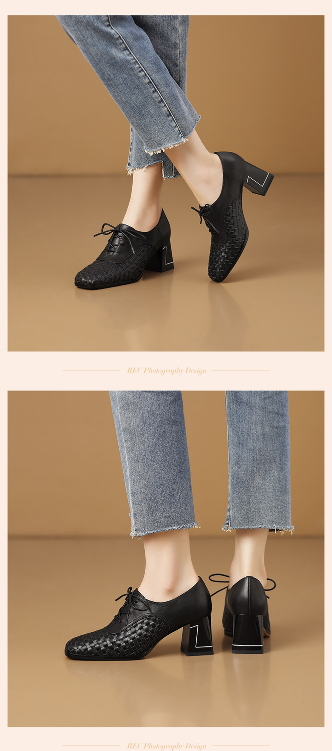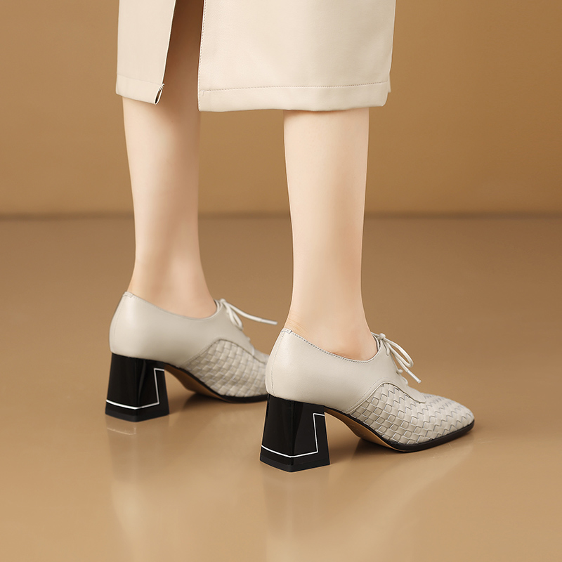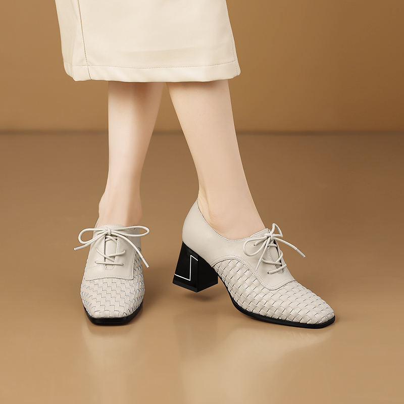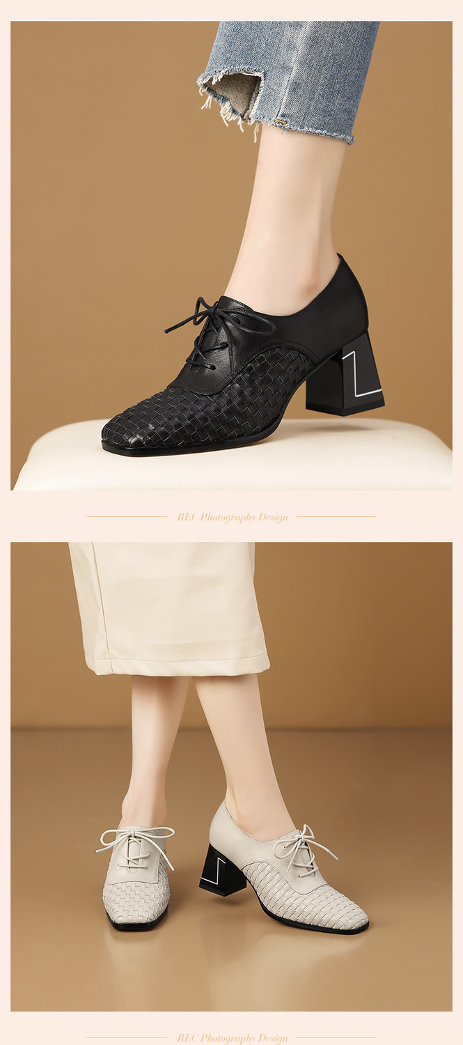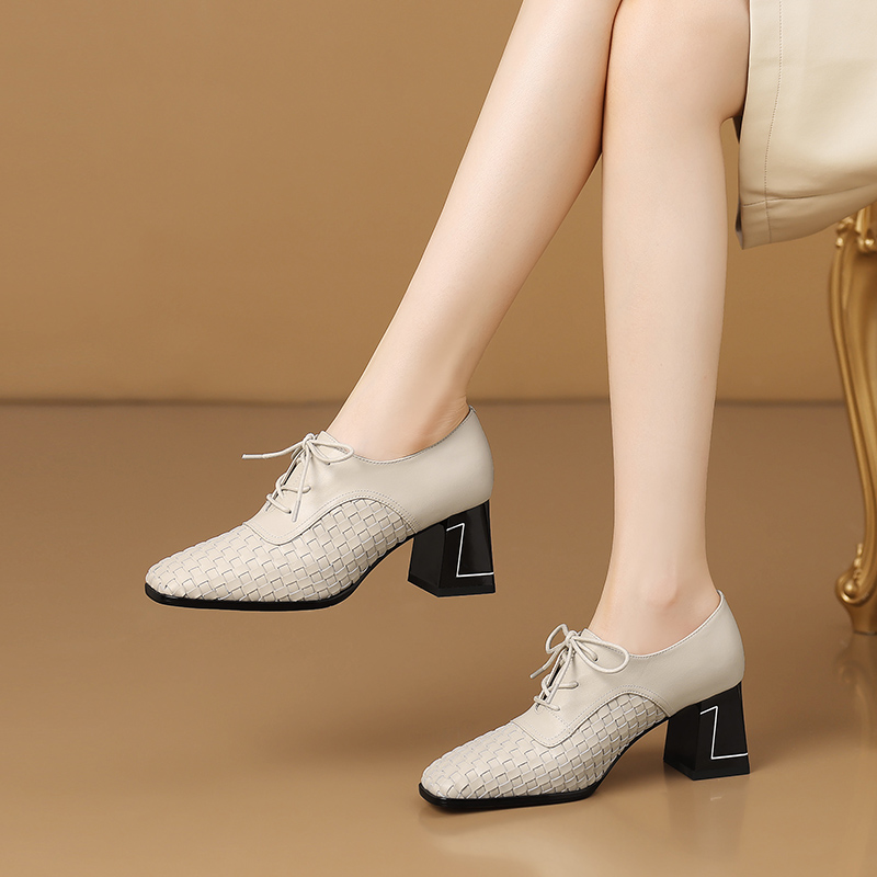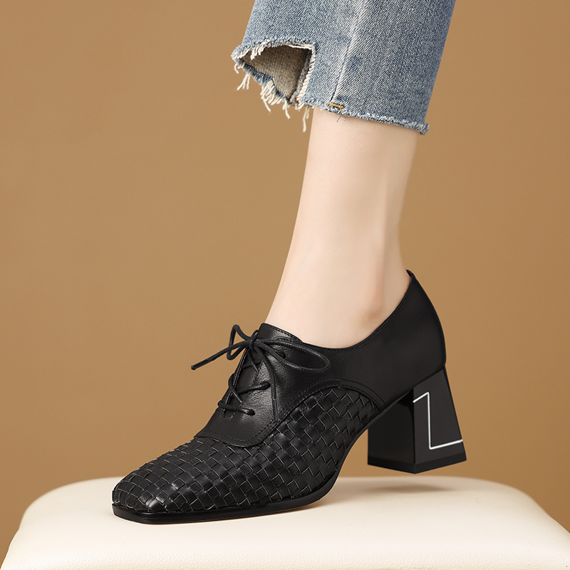 【预售5天】法式复古真皮编织系带小皮鞋女春秋新款粗跟方头深口单鞋高跟女鞋HY&H3721