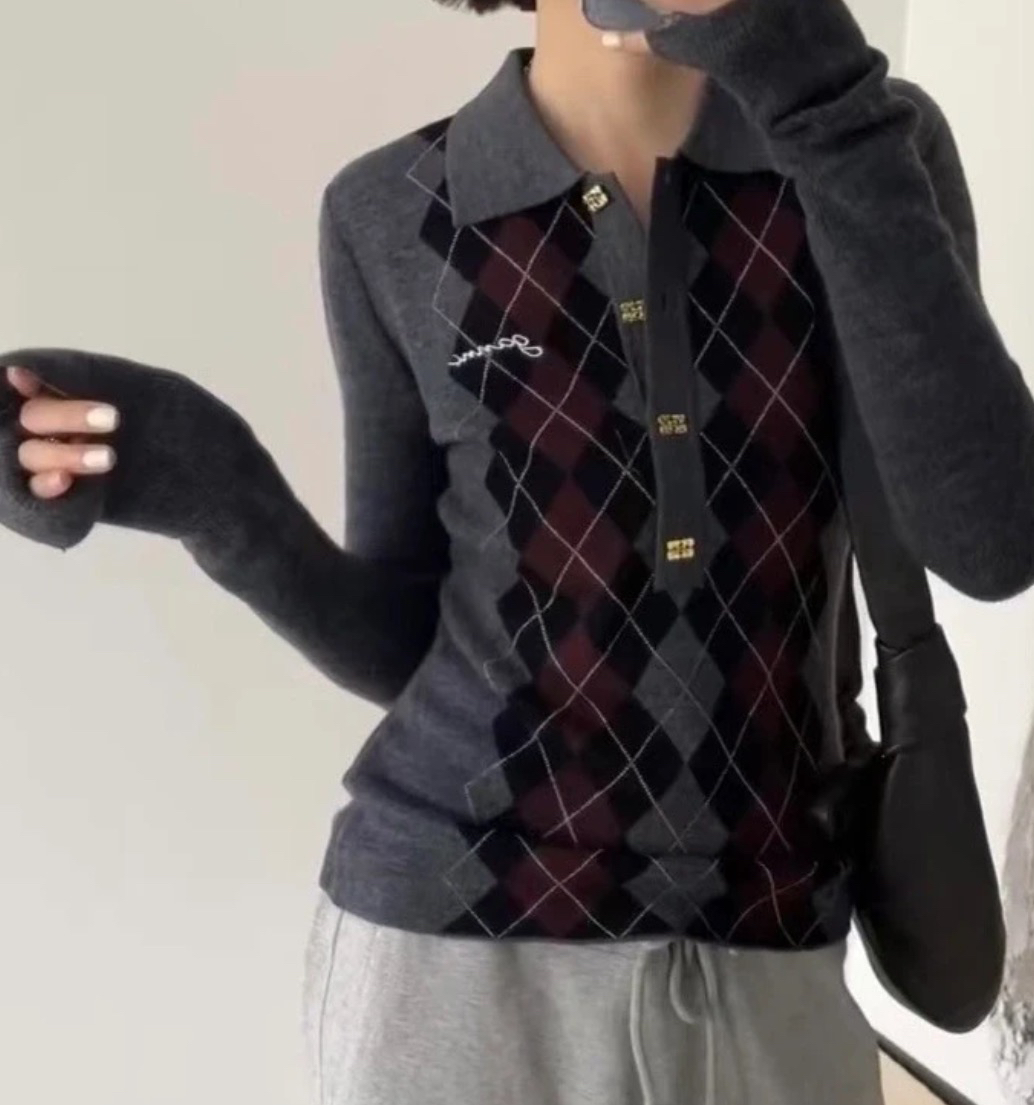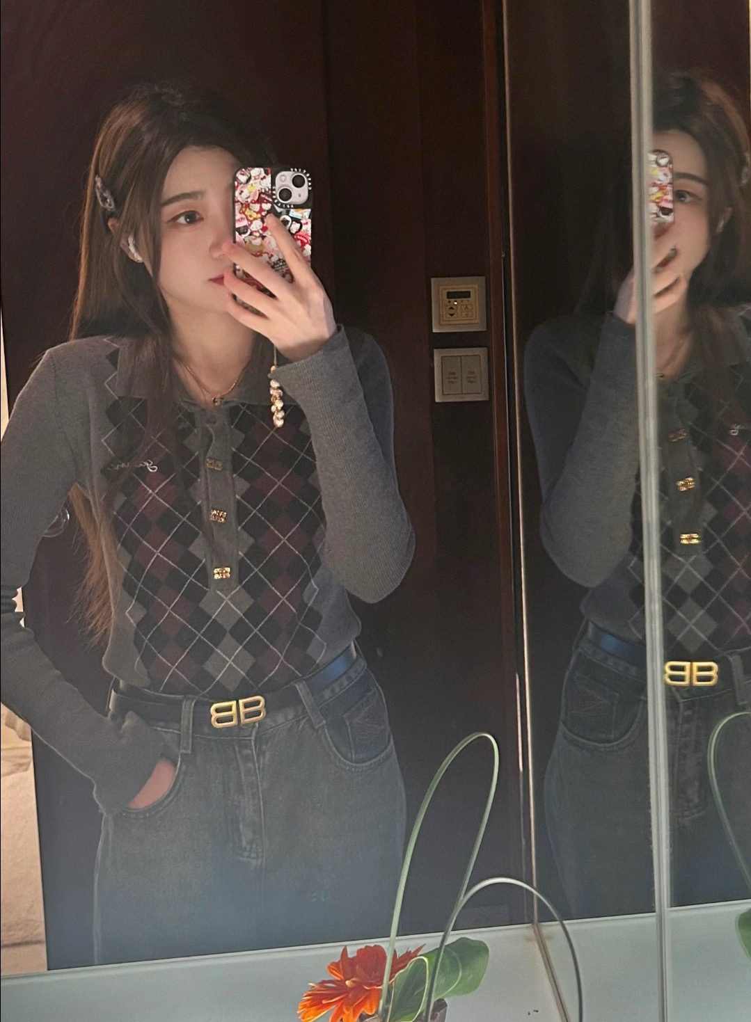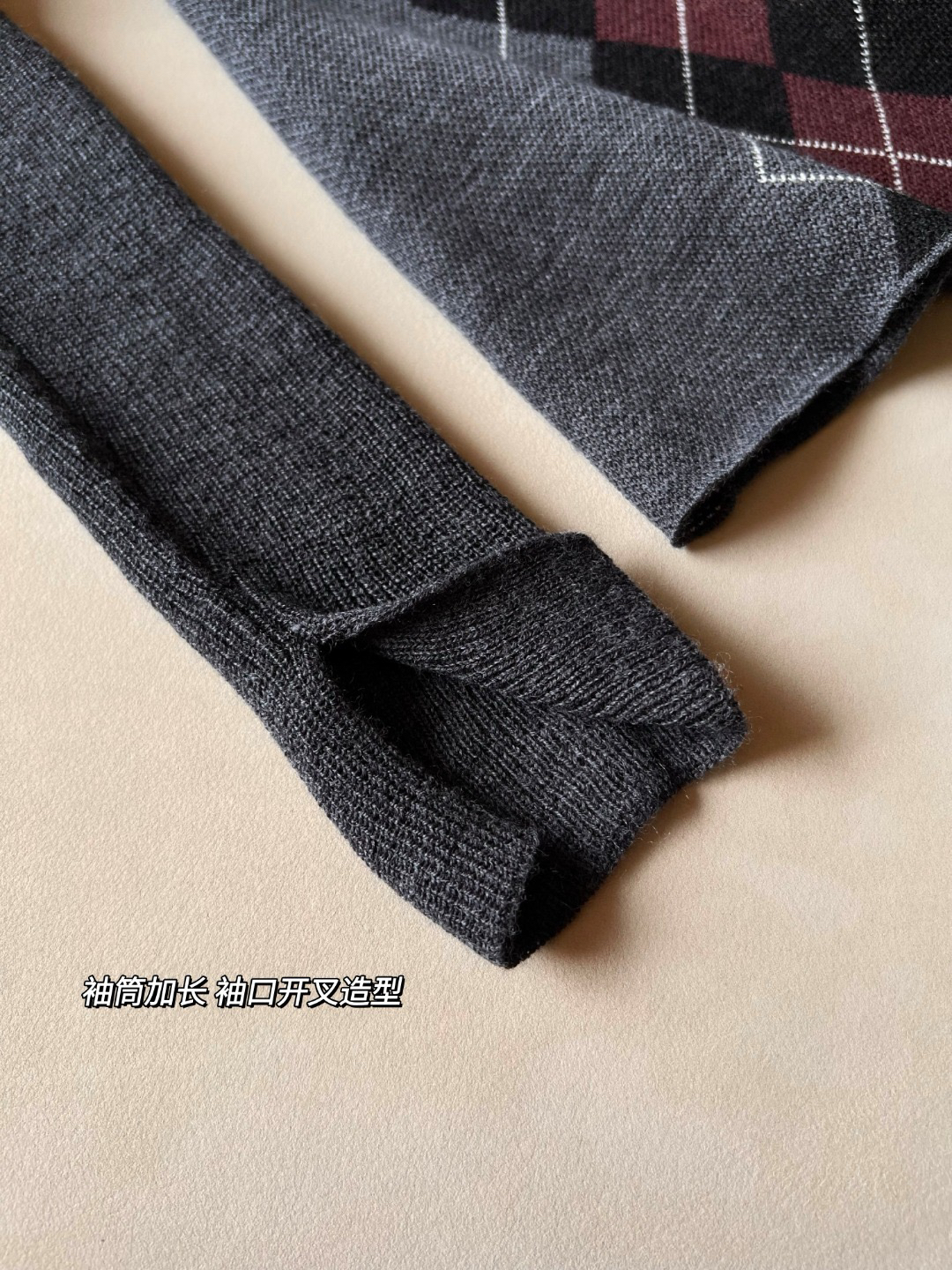 超级好看的霜灰色 搭配暗红菱格的高级配色 很学院风的一件