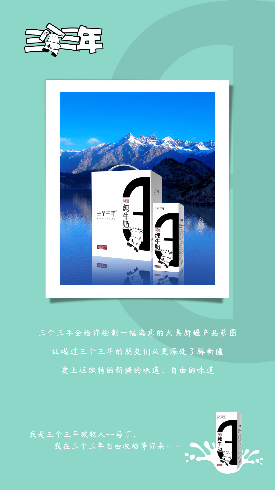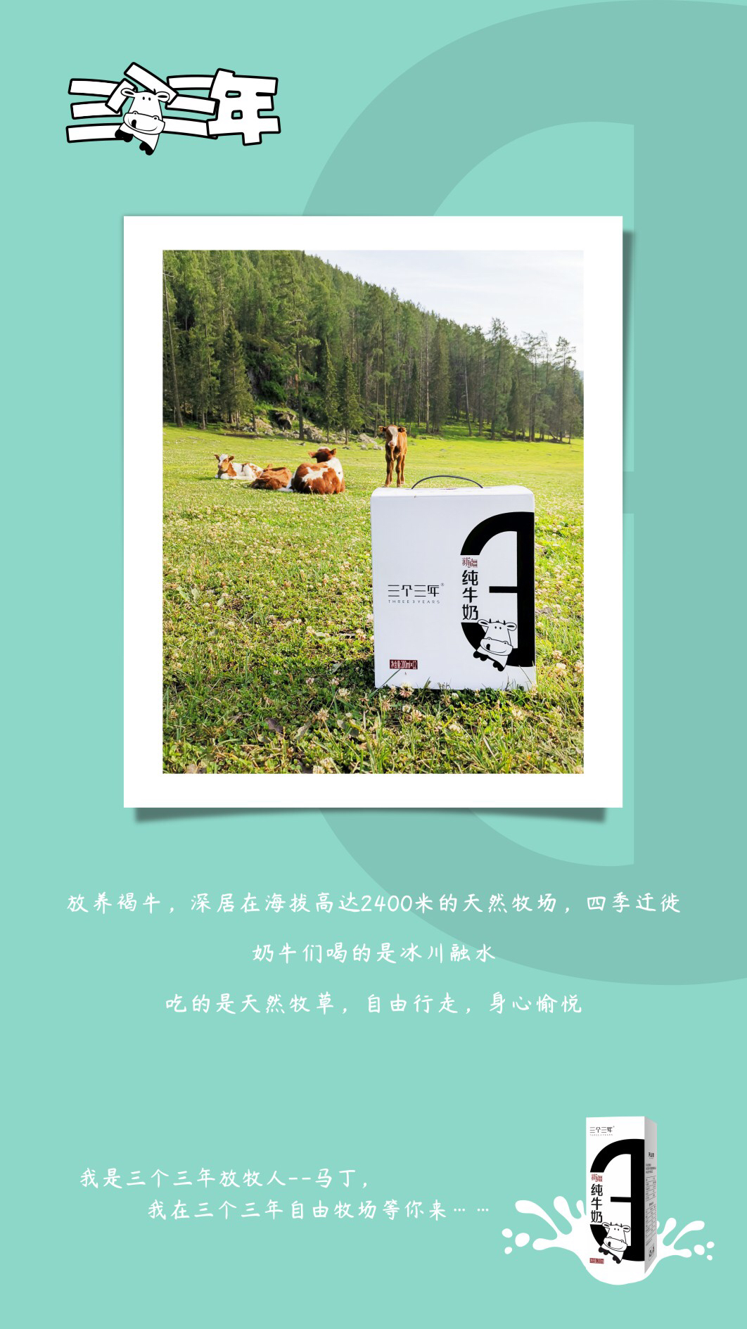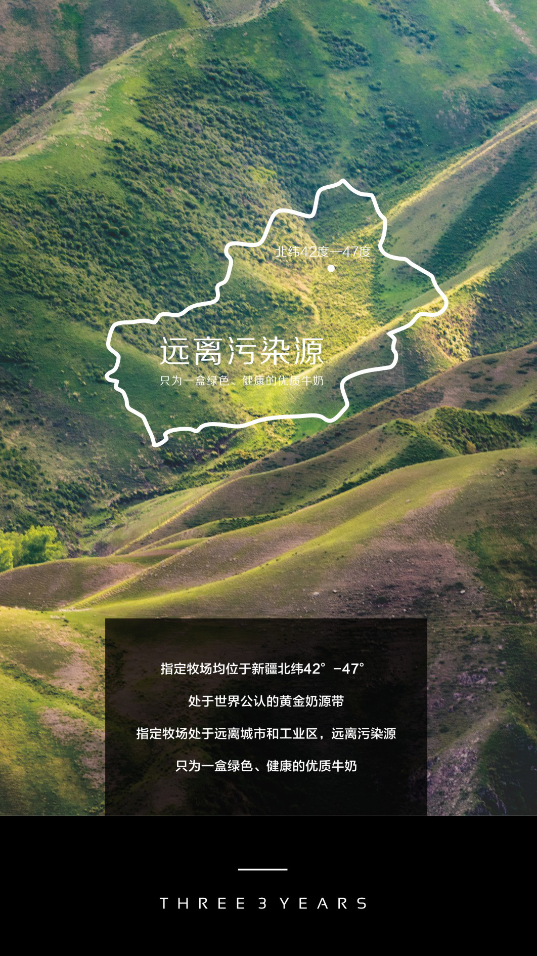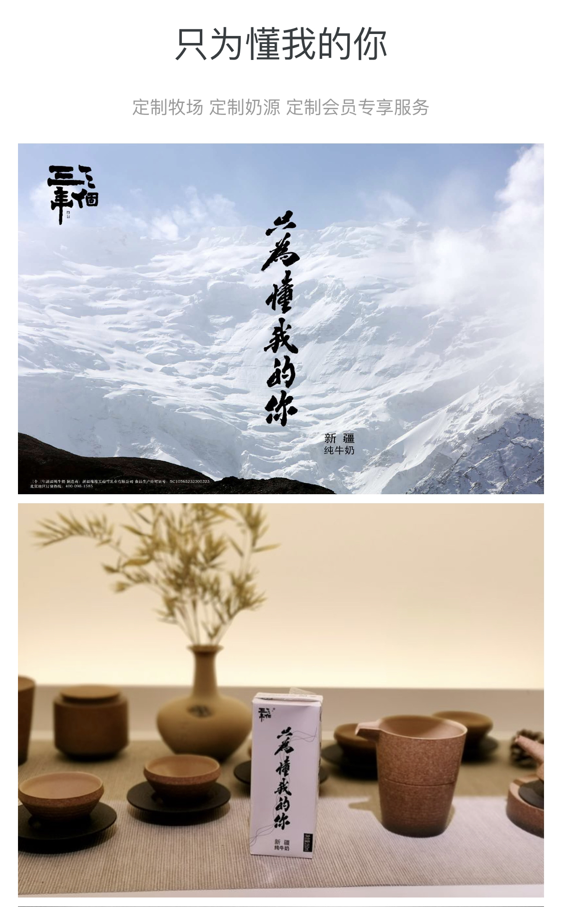 三年选人、三年选草、三年选牛是我们做牛奶的态度。"只为懂我的你"代表着我们的胸怀。三个三年的独具匠心,造就了一款新疆好牛奶。我们打造的是一款无需担心质量问题的高品质新疆纯牛奶、一款能唤醒儿时记忆的新疆纯牛奶、一款能够养成消费者每天喝牛奶习惯的纯牛奶。为了还原牛奶最初的本味,我们通过研发在保证产品质量和食品安全的前提下,将繁杂的生产工艺简单化,无数次的失败更加坚定了我们的信心,把更新鲜、更绿色的新疆"小美好"带给消费者将是我们不变的初心。