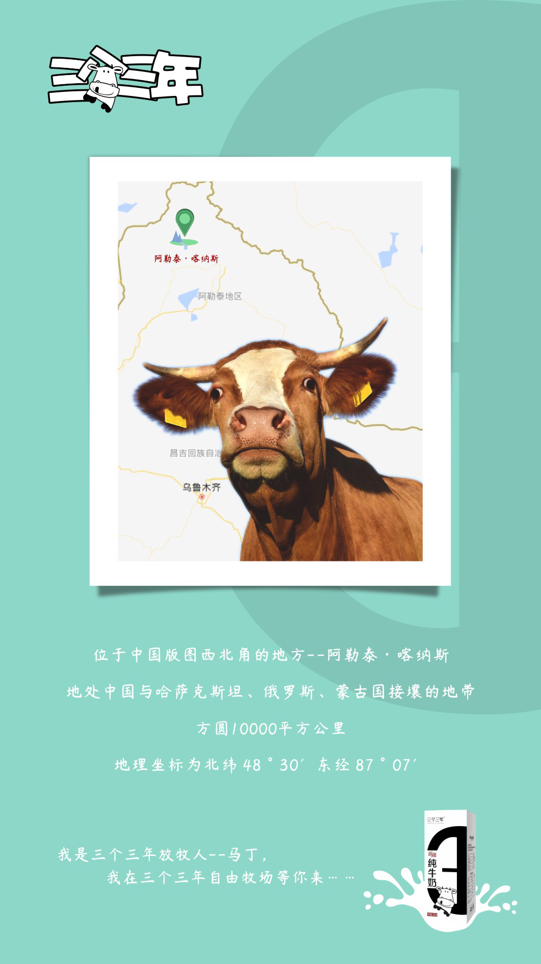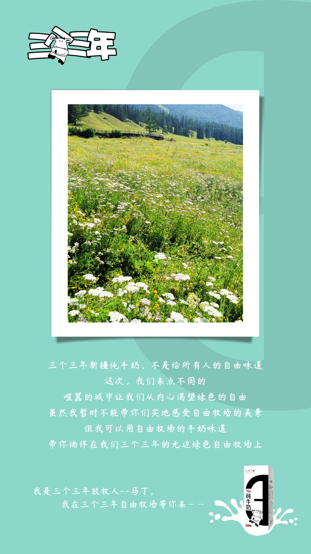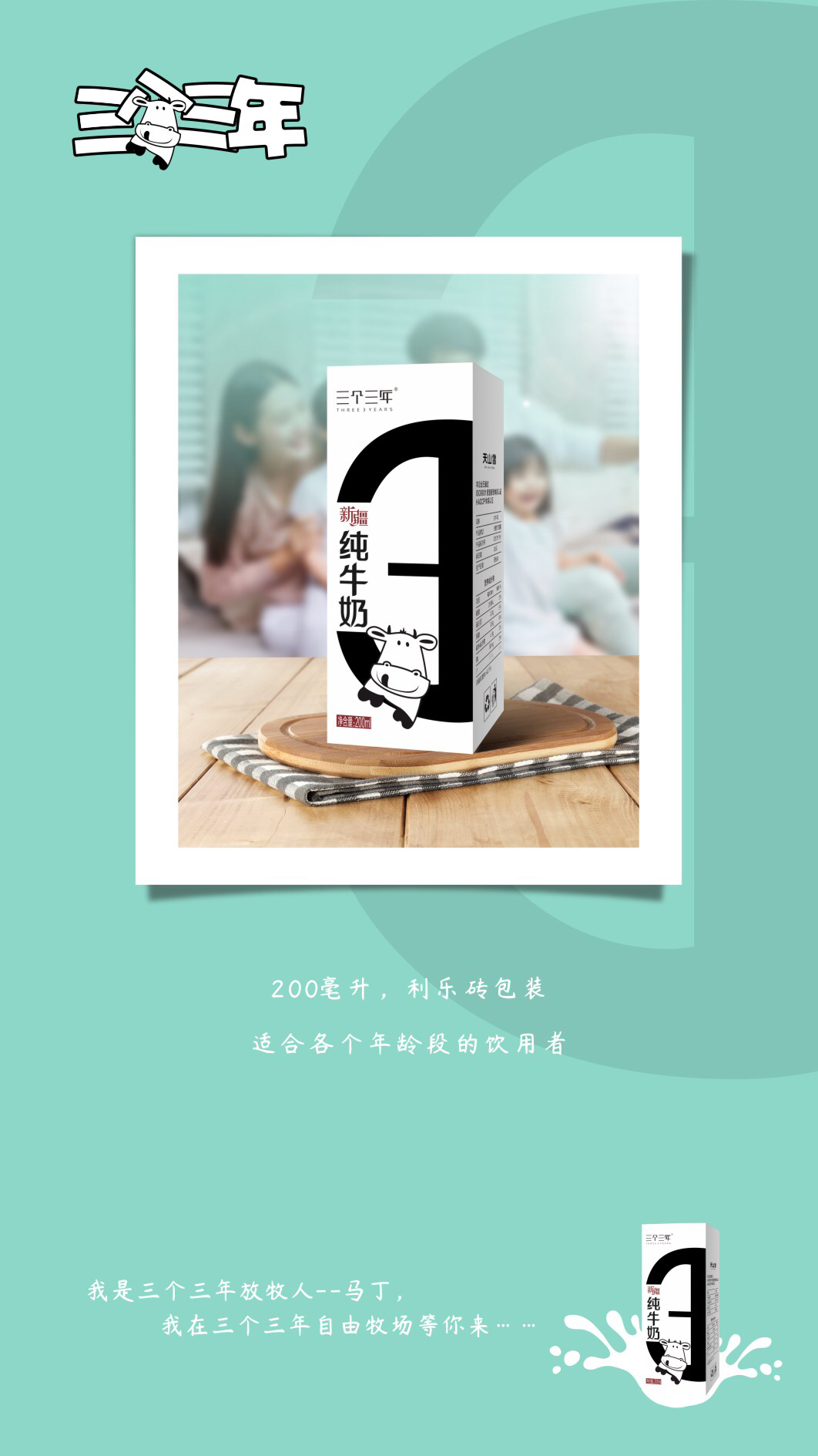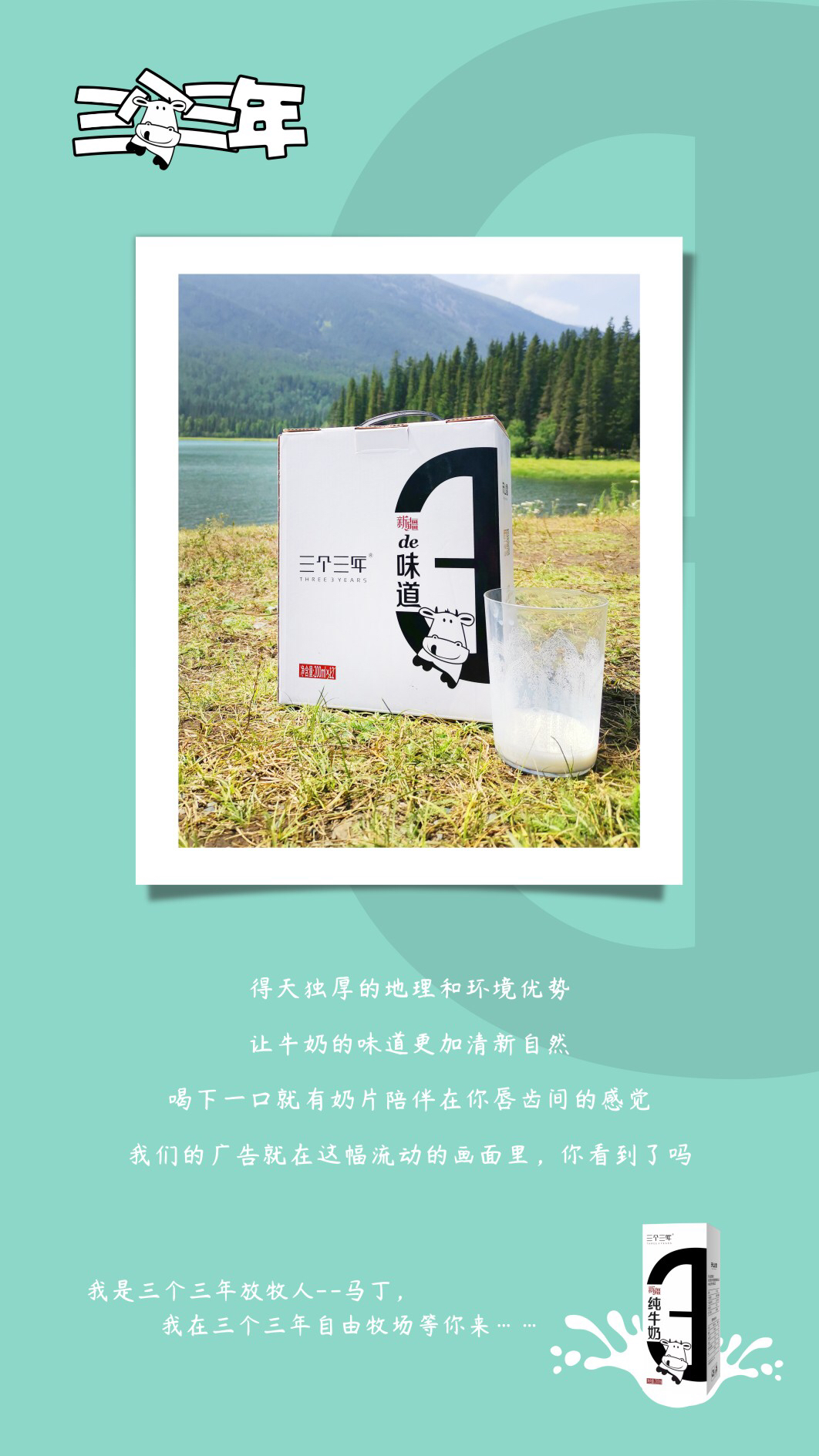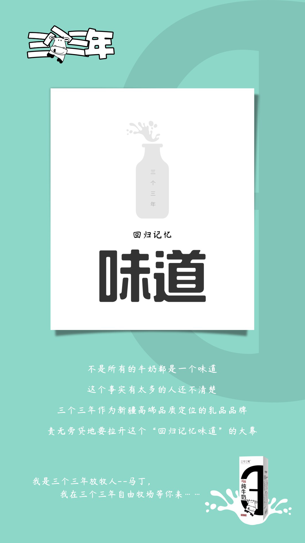 三年选人、三年选草、三年选牛是我们做牛奶的态度。"只为懂我的你"代表着我们的胸怀。三个三年的独具匠心,造就了一款新疆好牛奶。我们打造的是一款无需担心质量问题的高品质新疆纯牛奶、一款能唤醒儿时记忆的新疆纯牛奶、一款能够养成消费者每天喝牛奶习惯的纯牛奶。为了还原牛奶最初的本味,我们通过研发在保证产品质量和食品安全的前提下,将繁杂的生产工艺简单化,无数次的失败更加坚定了我们的信心,把更新鲜、更绿色的新疆"小美好"带给消费者将是我们不变的初心。