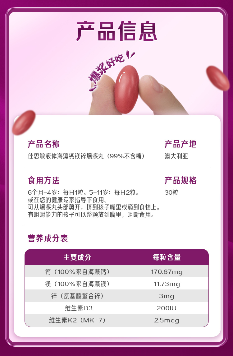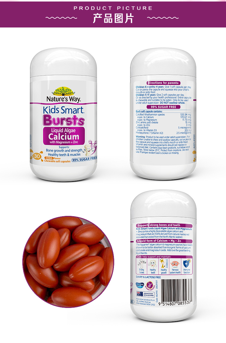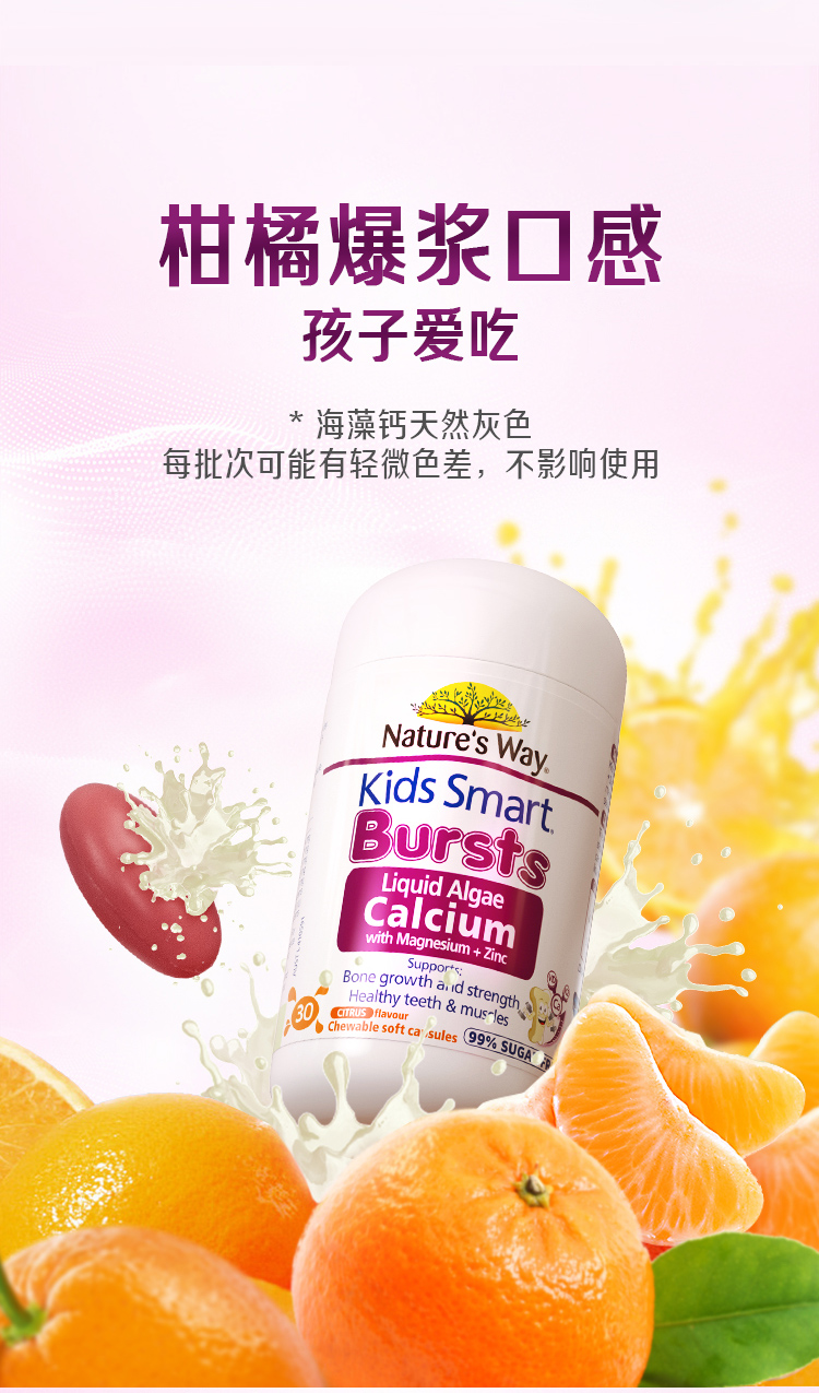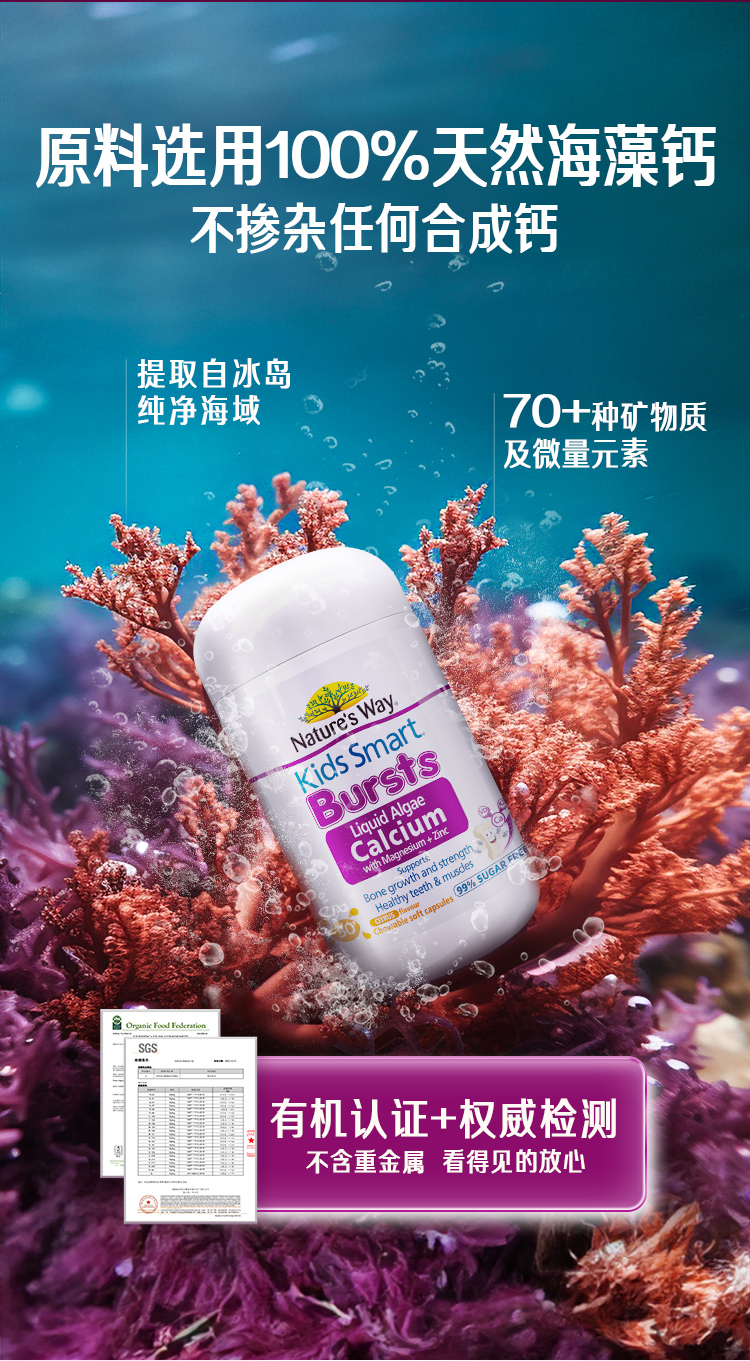 6个月-11岁 液体钙镁锌K2D3爆浆丸30粒 | Nature's Way 佳思敏 海藻钙儿童5大成长因子 1粒补全 科学含量 精准补钙(26年12月)