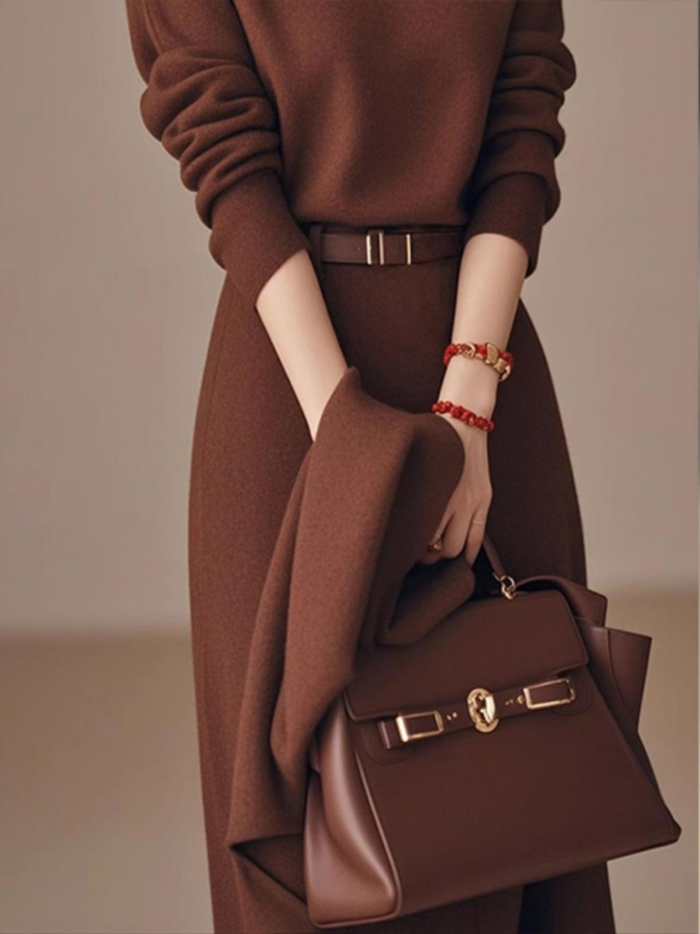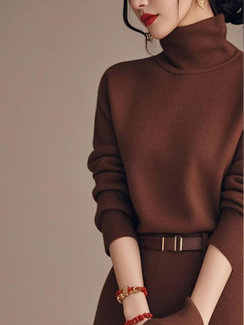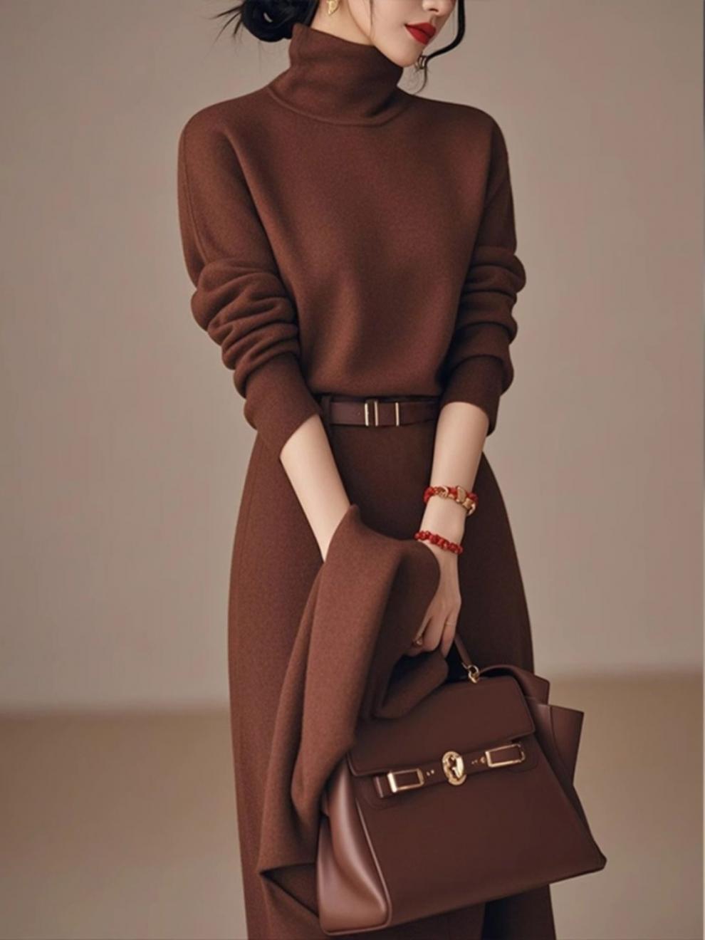 【预售3天】咖色短袖高领裙子秋冬大衣气质2025新款中长款漂亮针织连衣裙WJj76PbB