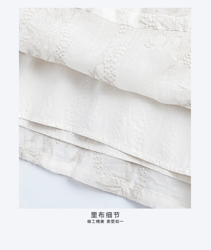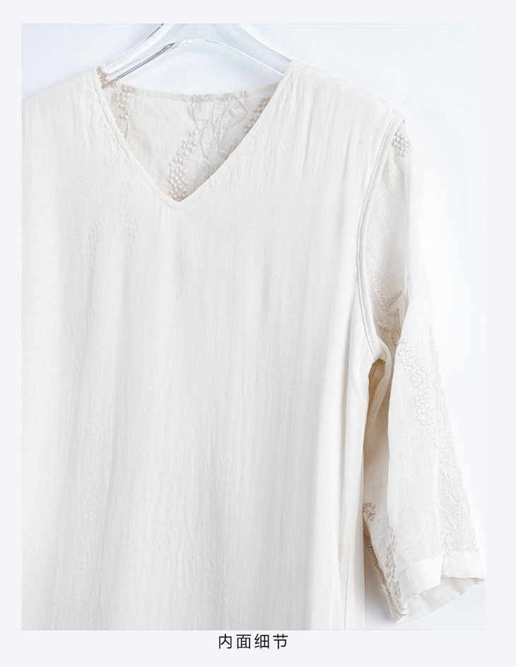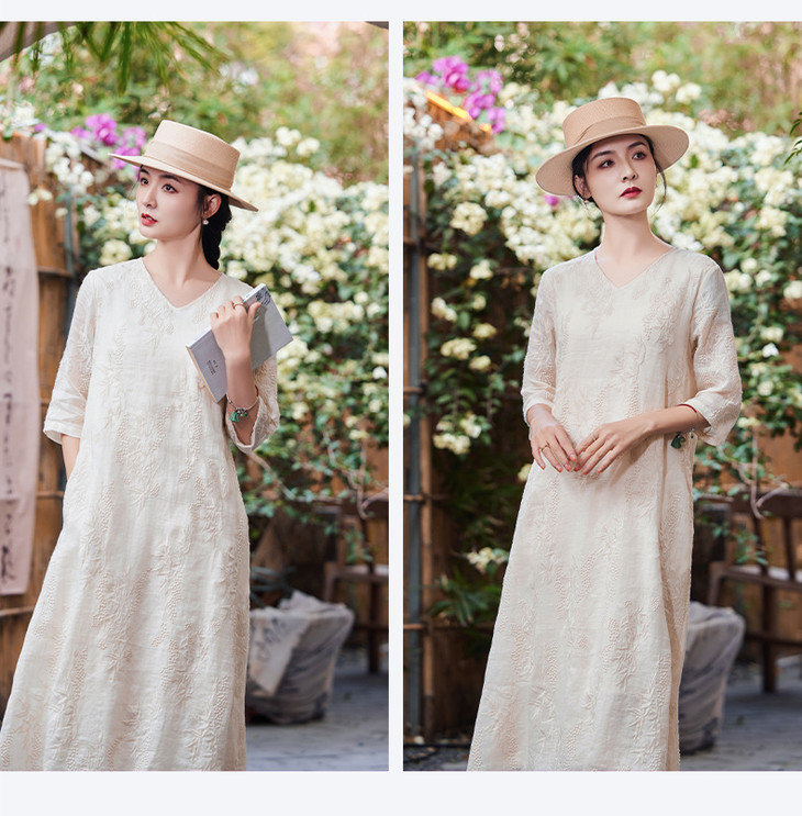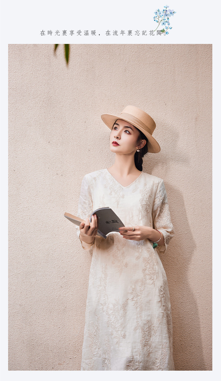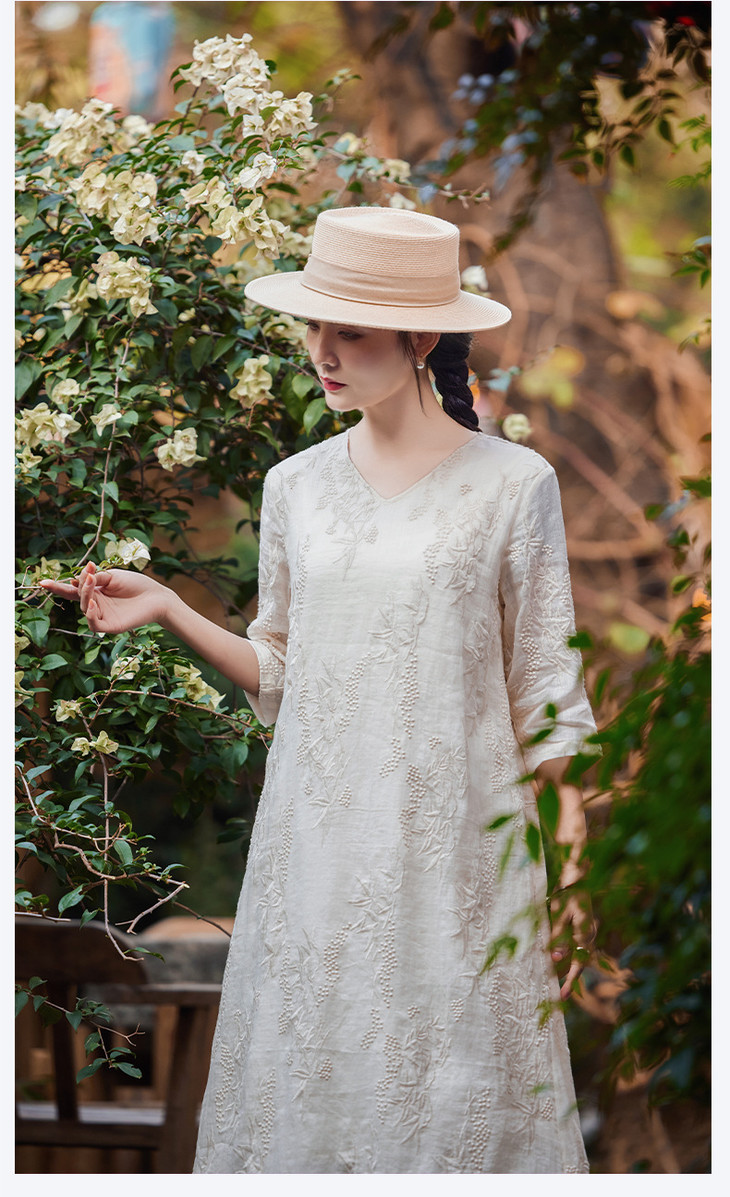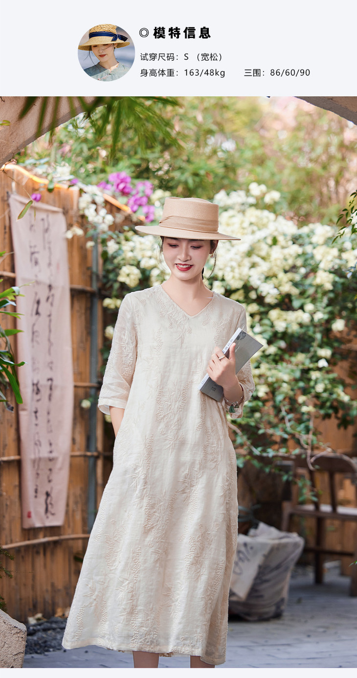 中式简约苎麻重工刺绣,V领文艺七分袖淑女仙气A字连衣裙YM-S505