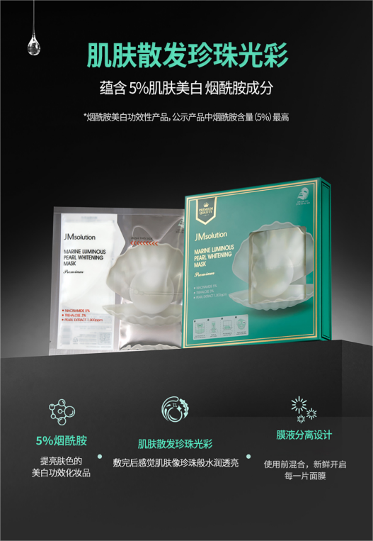 👑JM solution珍珠两步曲面膜-5片 👍含有5%烟酰胺成分+珍珠提取物,提亮肤色,丰盈保湿 💦啫喱精华,弹润质地,持续维持肌肤水分 💎膜液分离设计,更好发挥精华和面膜的协同效果 ✅有效:保湿补水,亮白透光,维稳肌肤 🙋♀️适合暗沉粗糙的肌肤