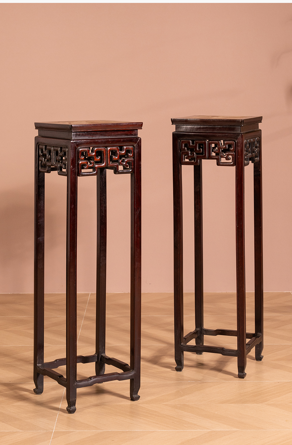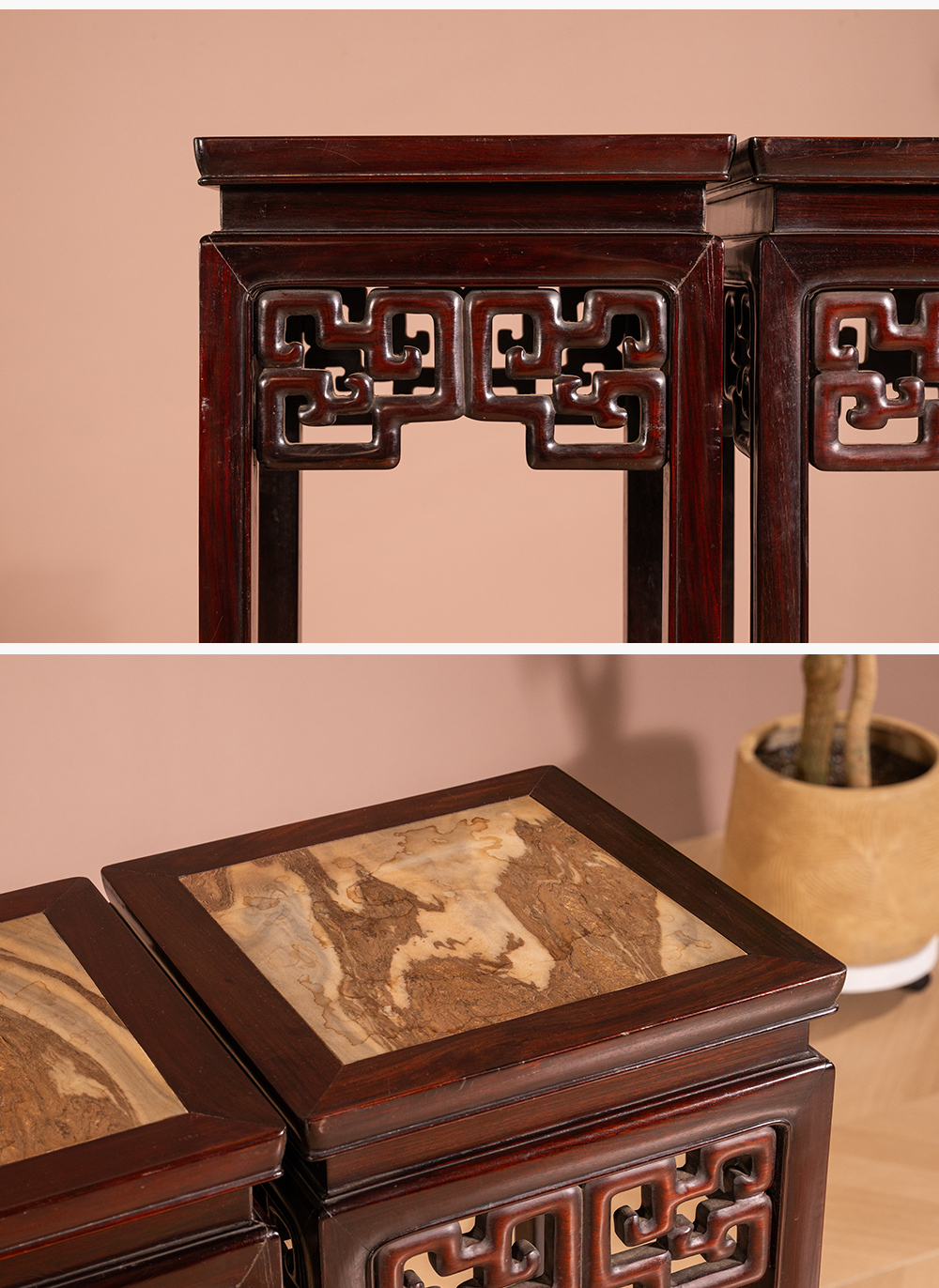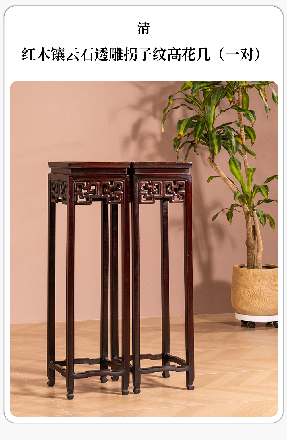 清 红木镶云石透雕拐子纹高花几(一对)