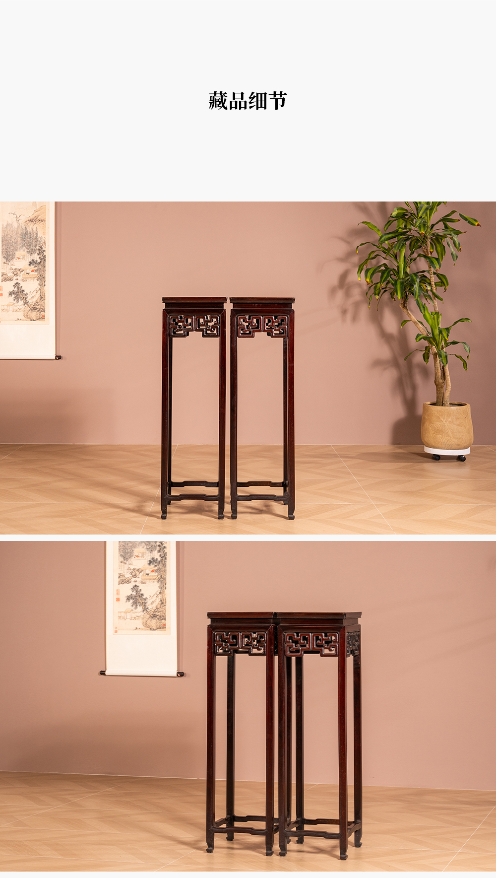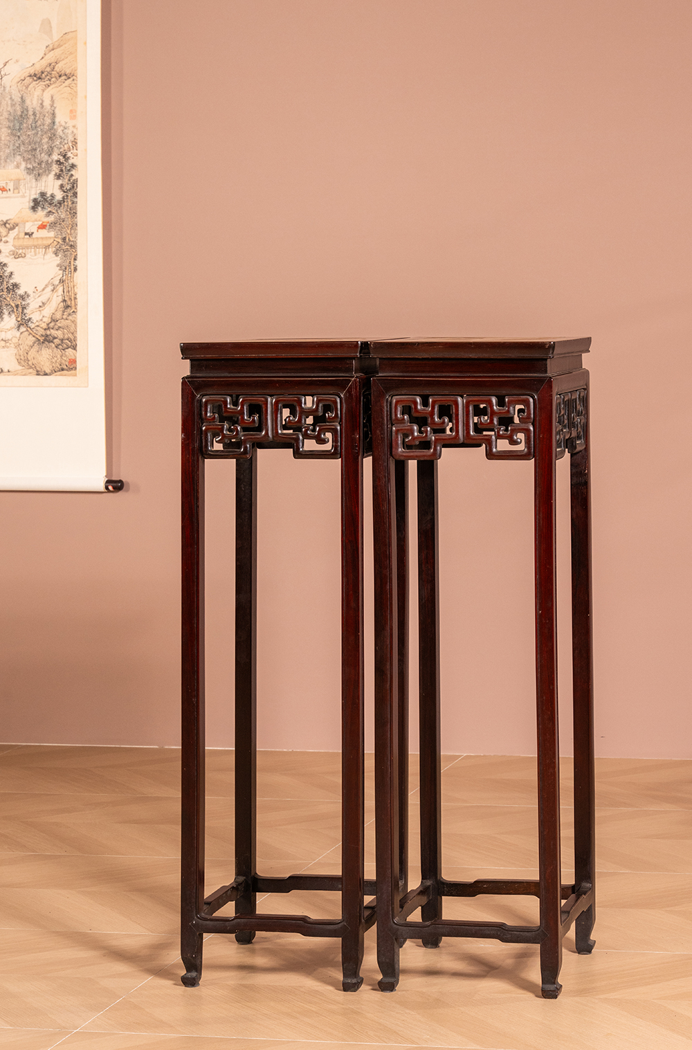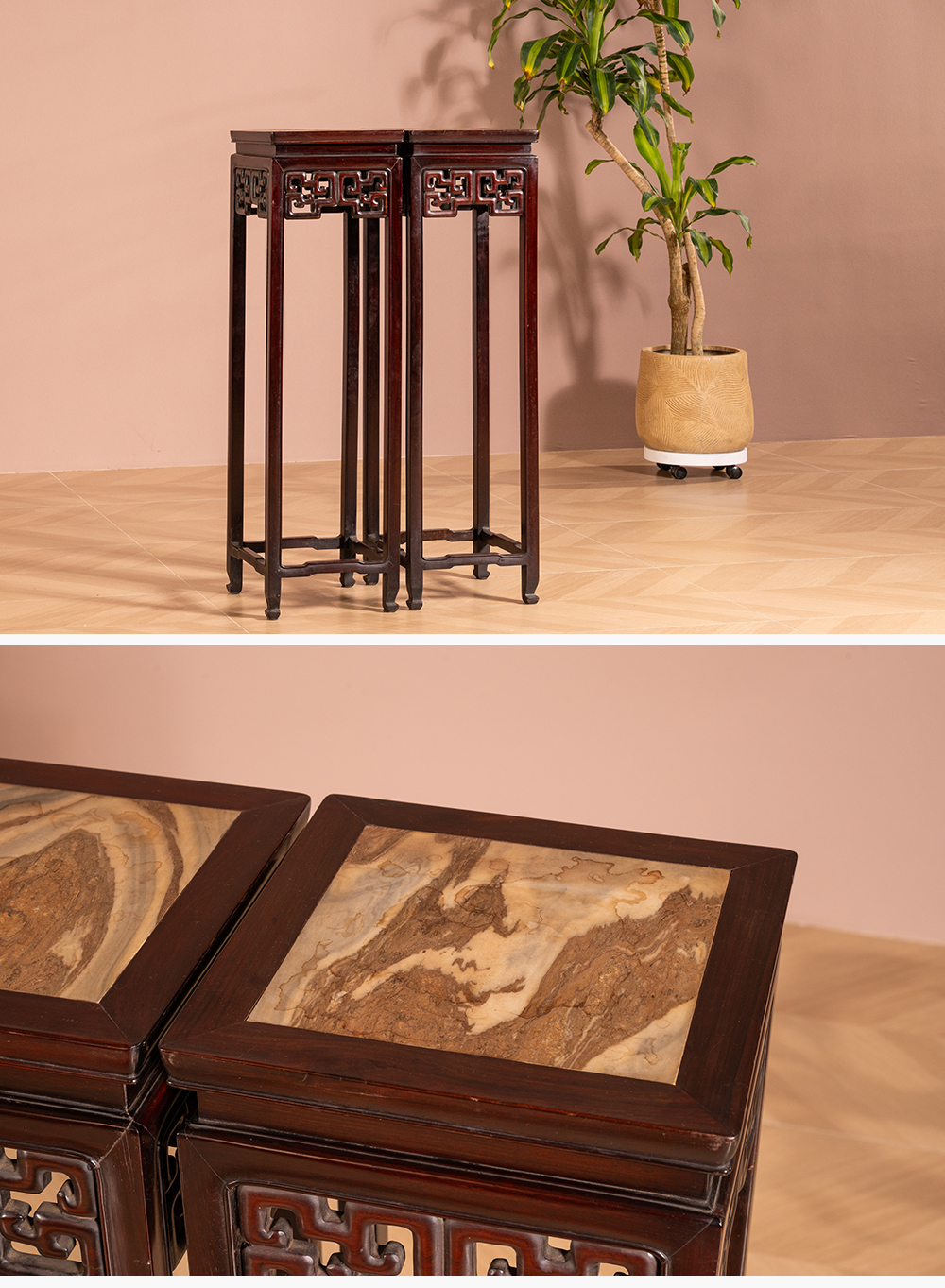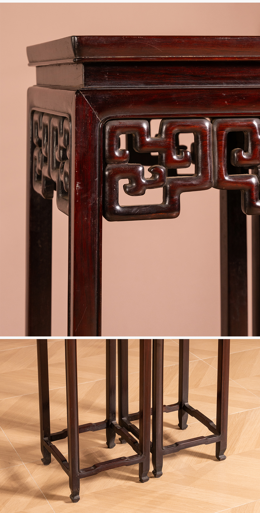 清 红木镶云石透雕拐子纹高花几(一对)