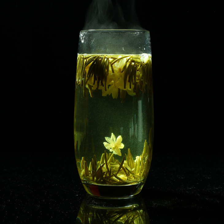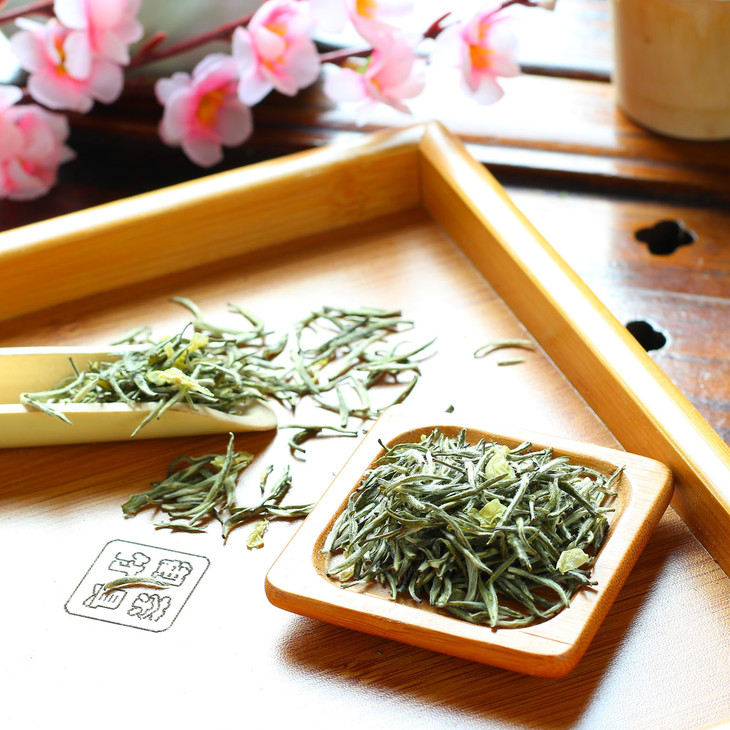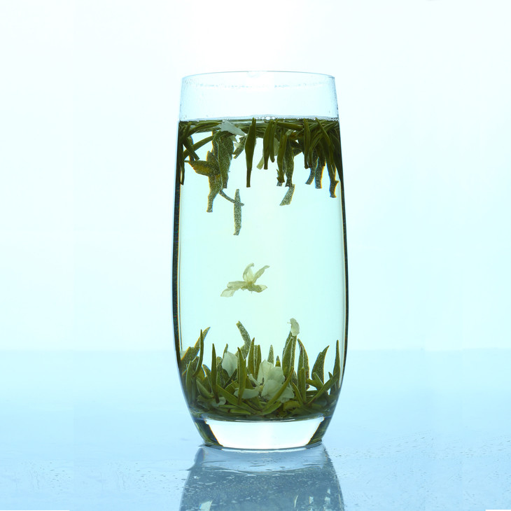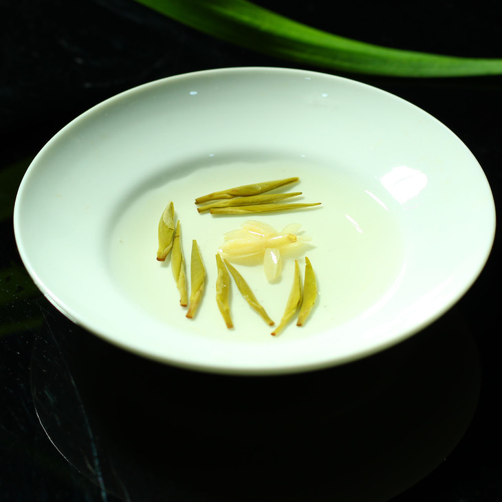 本款茉莉花茶的茶胚是在春季采摘的早期明前独芽,全是独芽嫩芽,本款茉莉花茶的鲜花是采用四川犍为,茉莉花之乡鲜花,采用五次窨花一次体香精制而成,直接用开水冲泡就行。