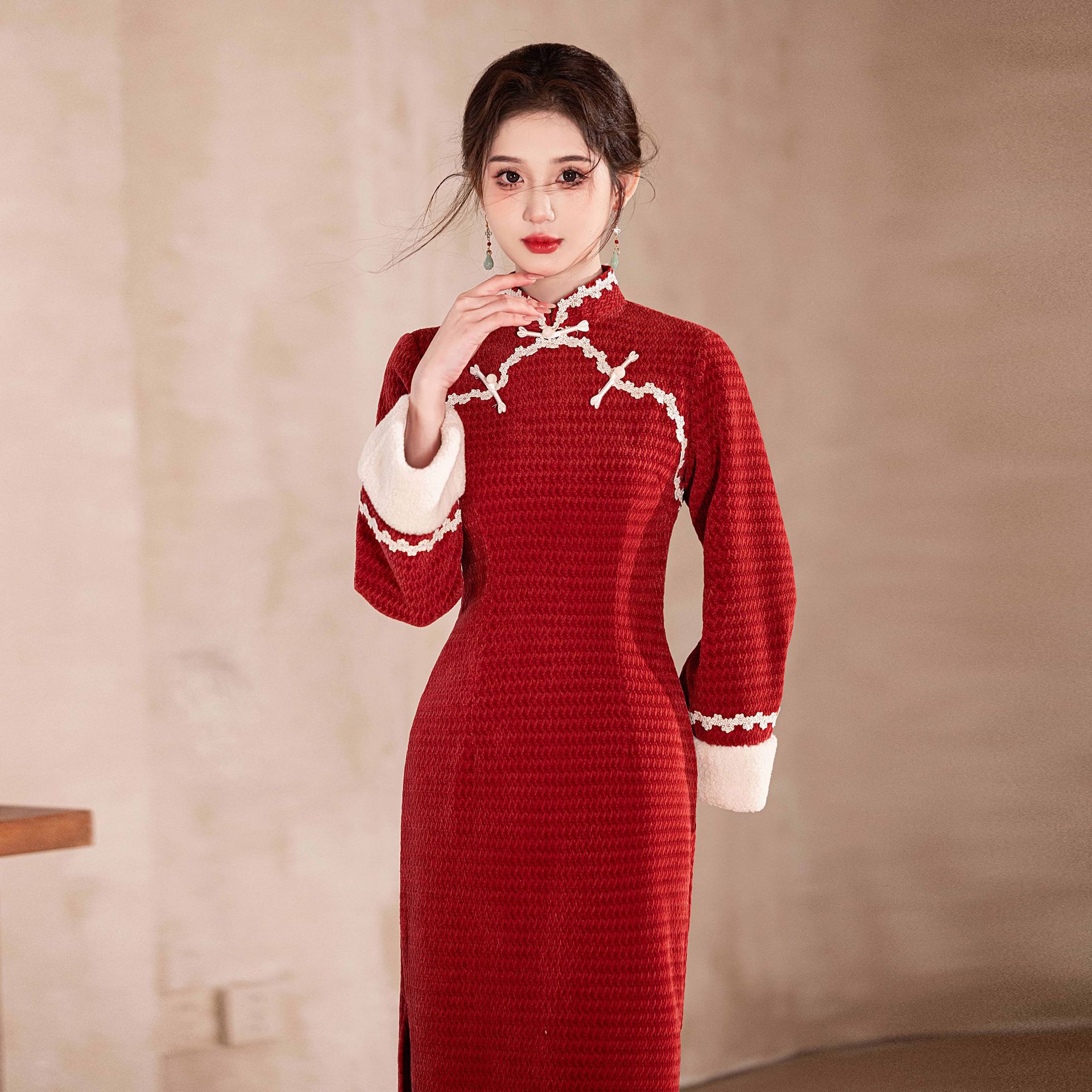 雪尼尔加密加厚,新中式红色拜年服改良旗袍CM-578