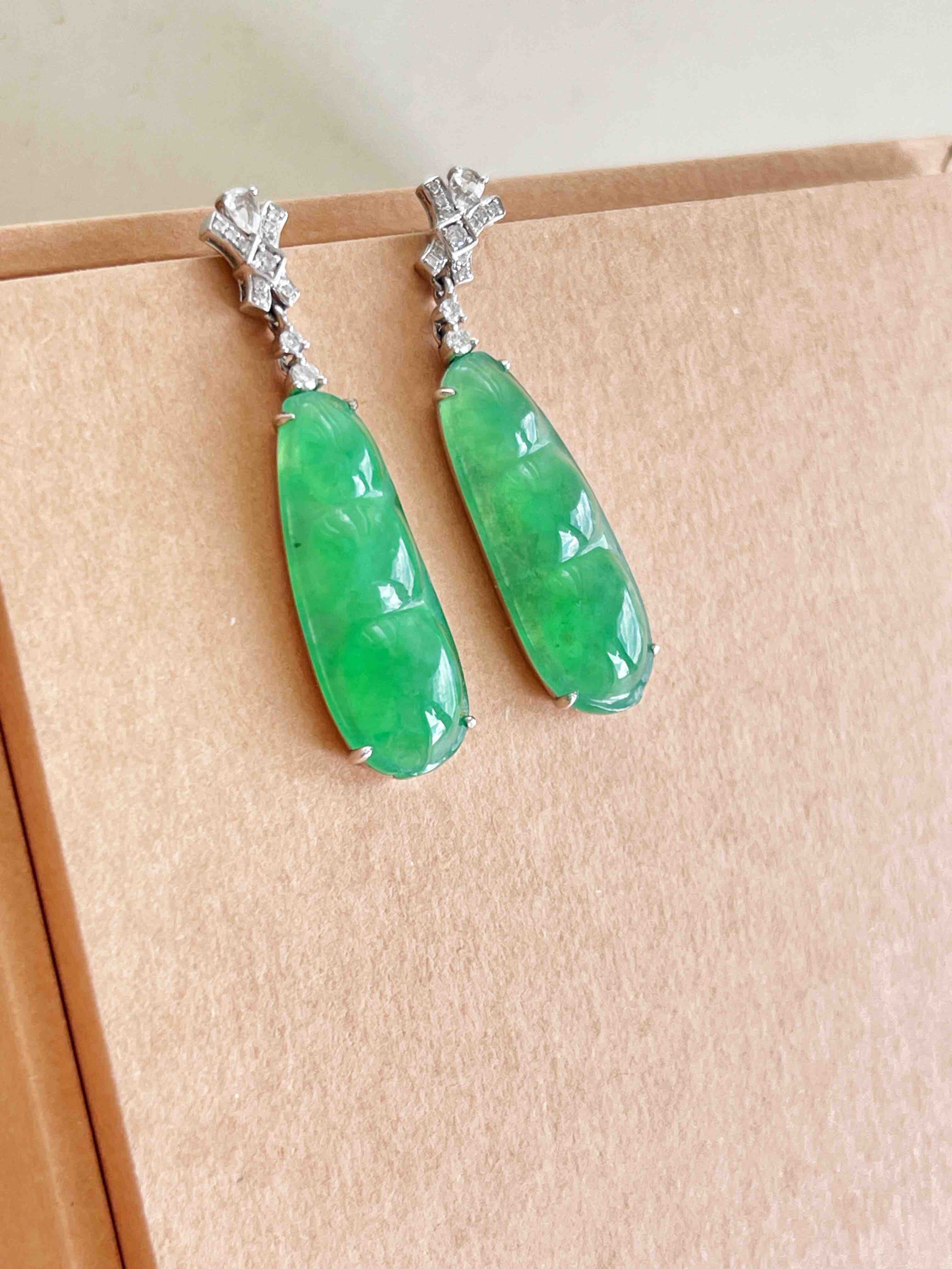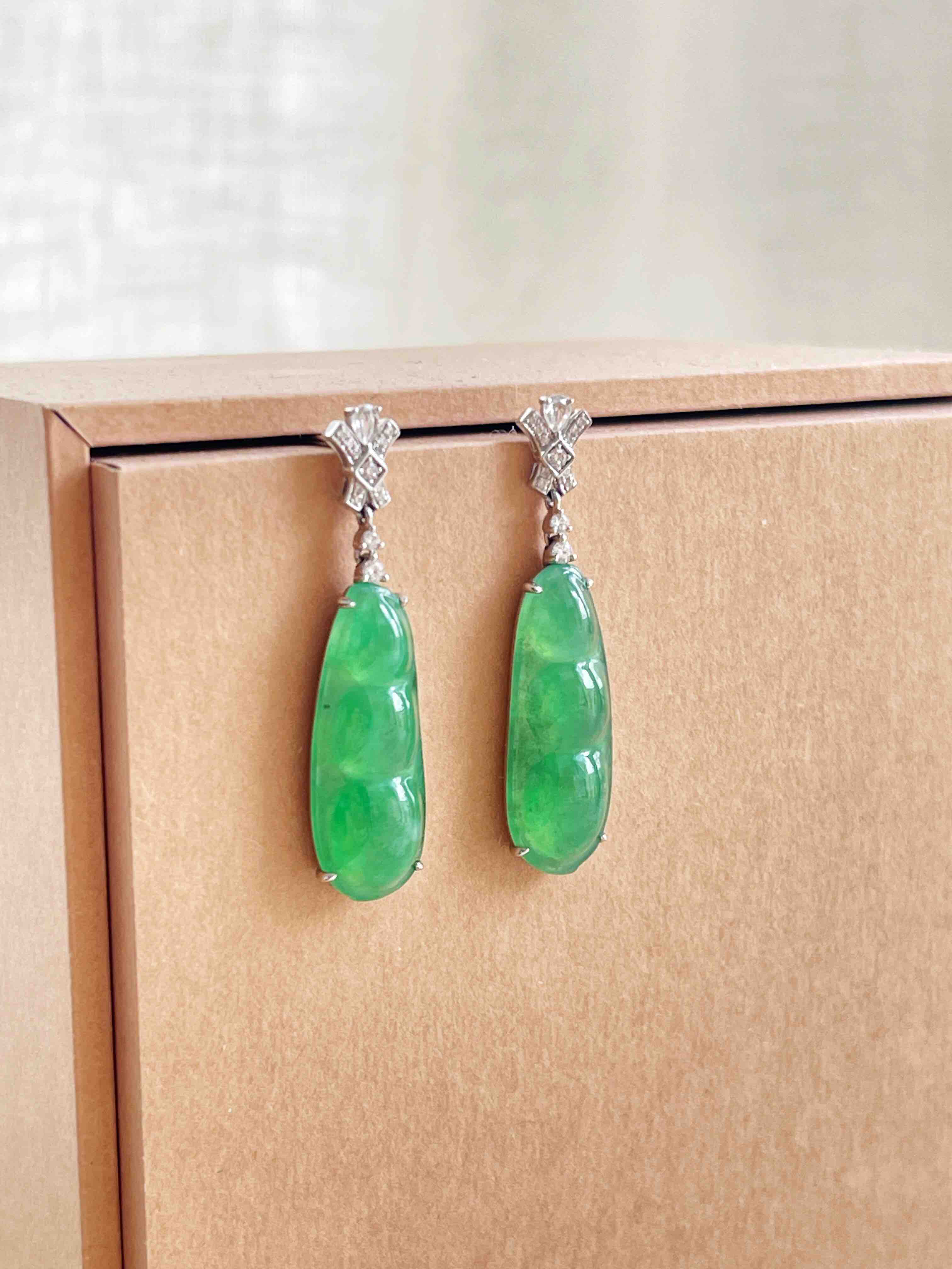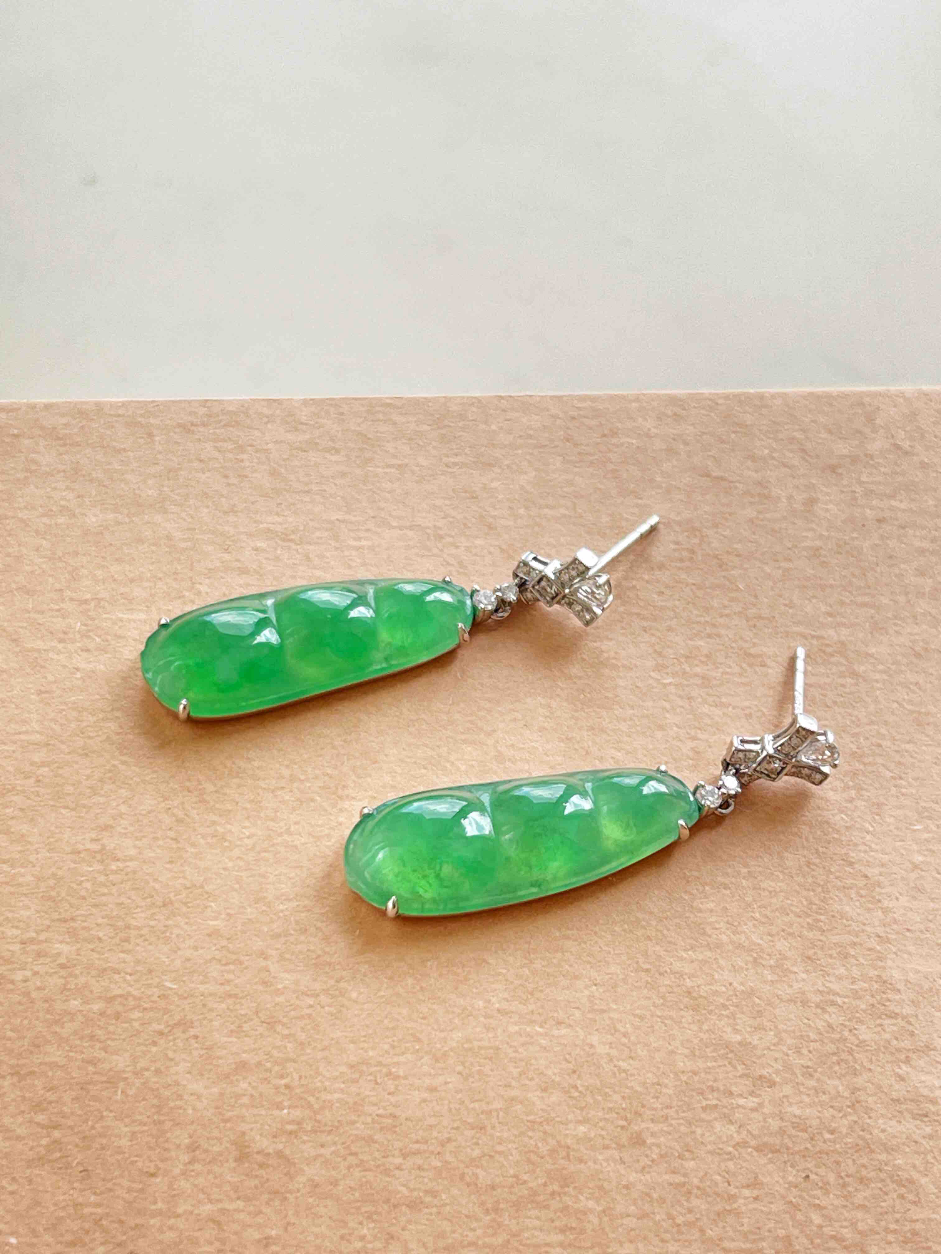 甜绿色小豆子一对,色彩比较甜美,尺寸在耳坠里比较适中。品相正气,对称性好。冰绿底带有荧光,微棉。时尚钻石耳针,佩戴灵动可爱。