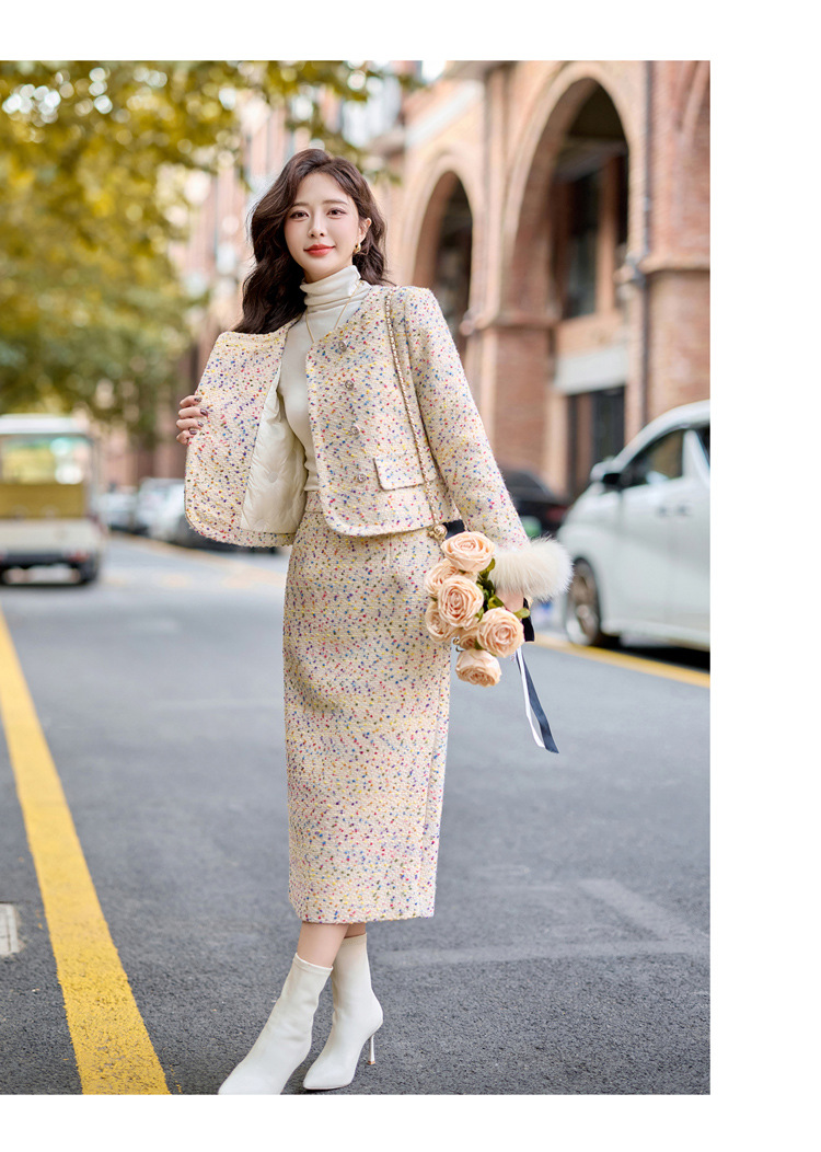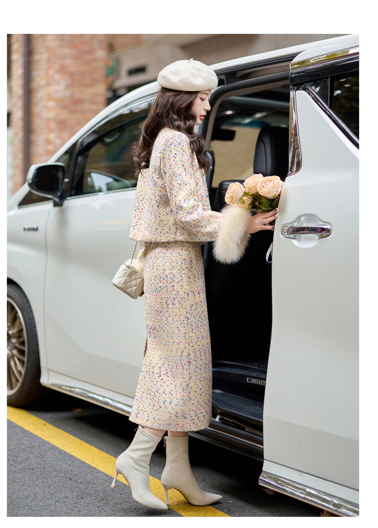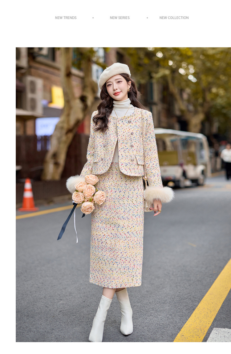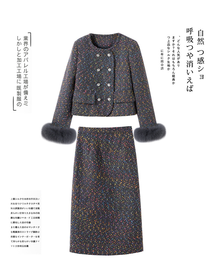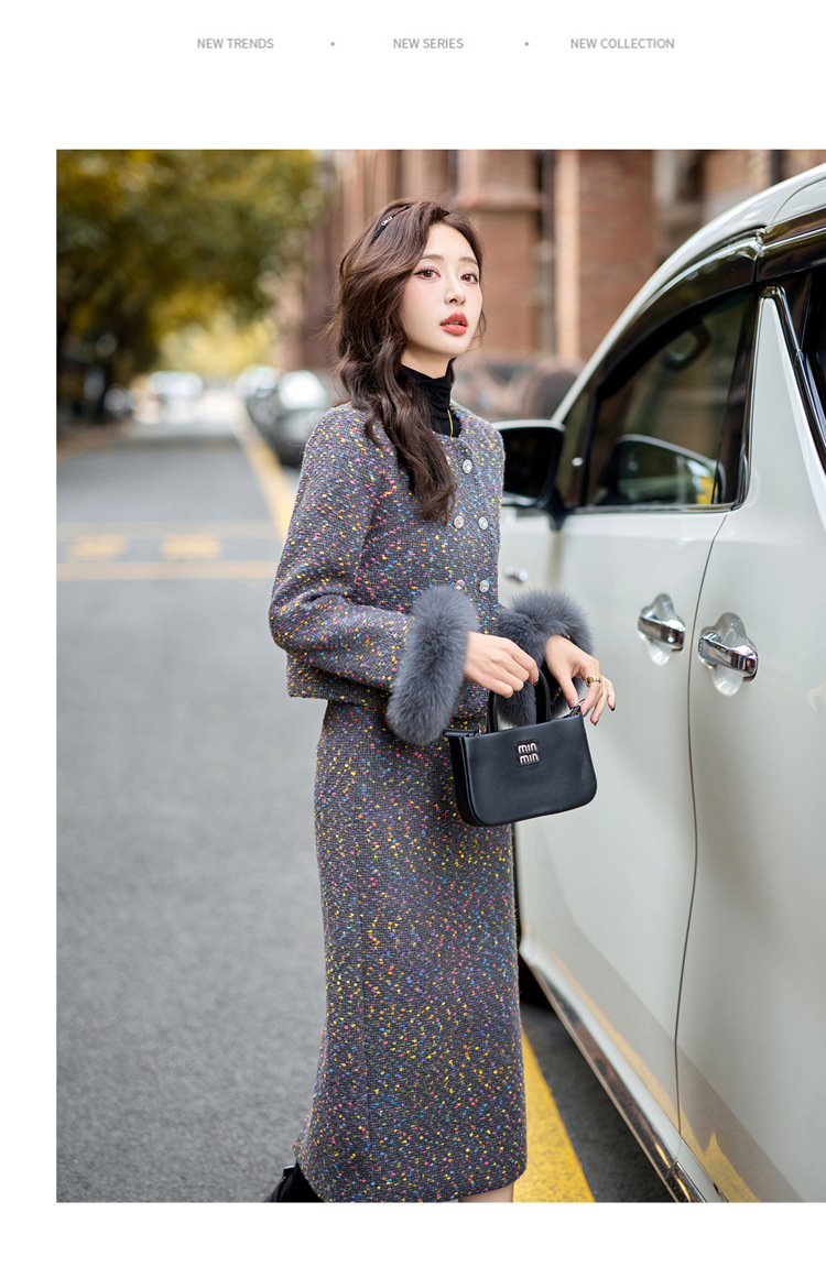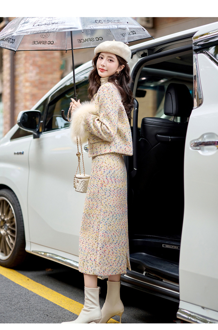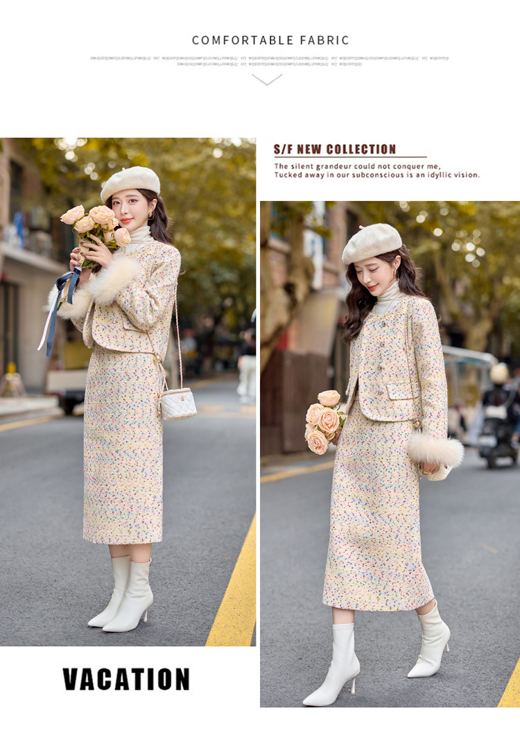 小香风羽绒内胆外套气质名媛狐狸毛半身裙套装YJLY1399