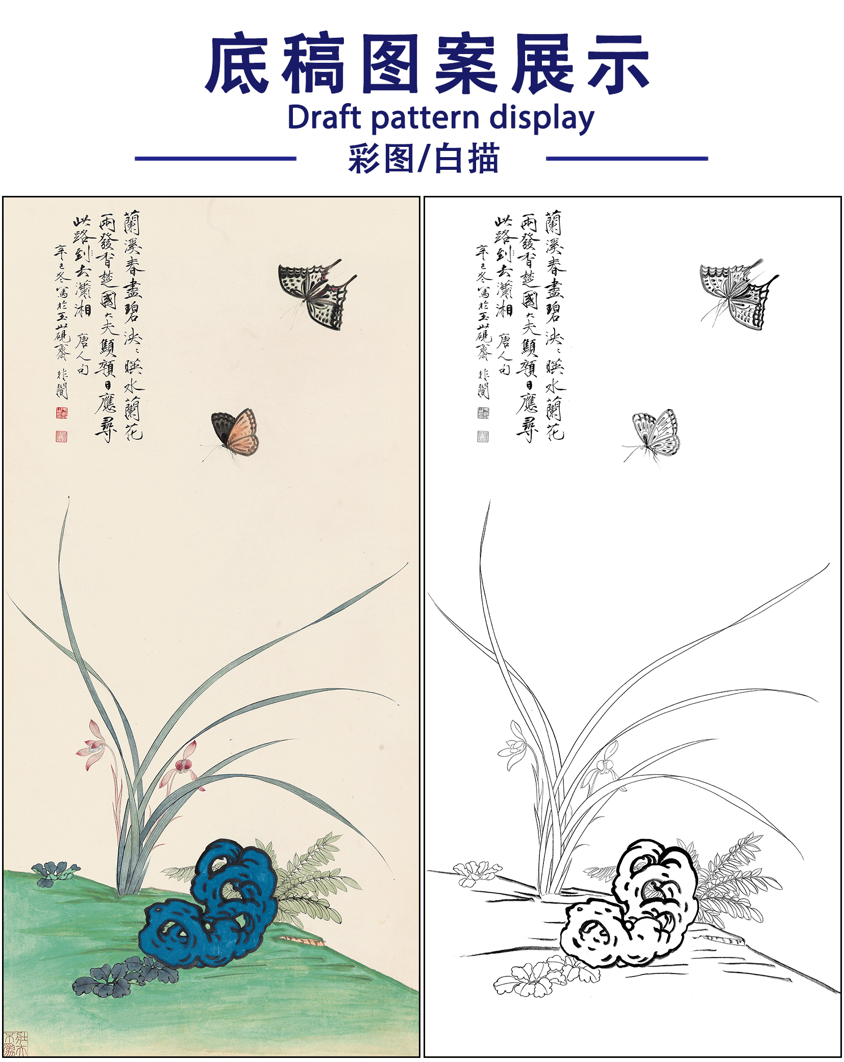 工笔画白描底稿于非闇花鸟《兰石双蝶》临摹勾线高清打印稿FA67
