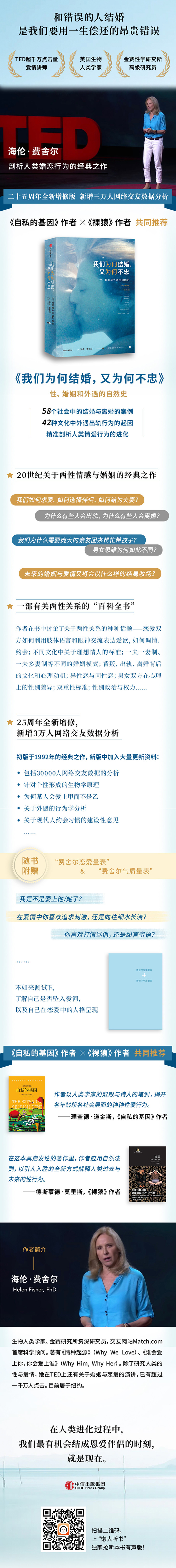 本书是20世纪关于两性情感与婚姻的经典之作,25年后根据当下的社会趋势,进行增修再版。作者是美国生物人类学家、金赛研究所资深研究员、交友网站Match.com首席科学顾问海伦·费舍尔博士。