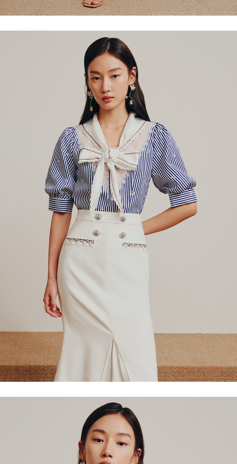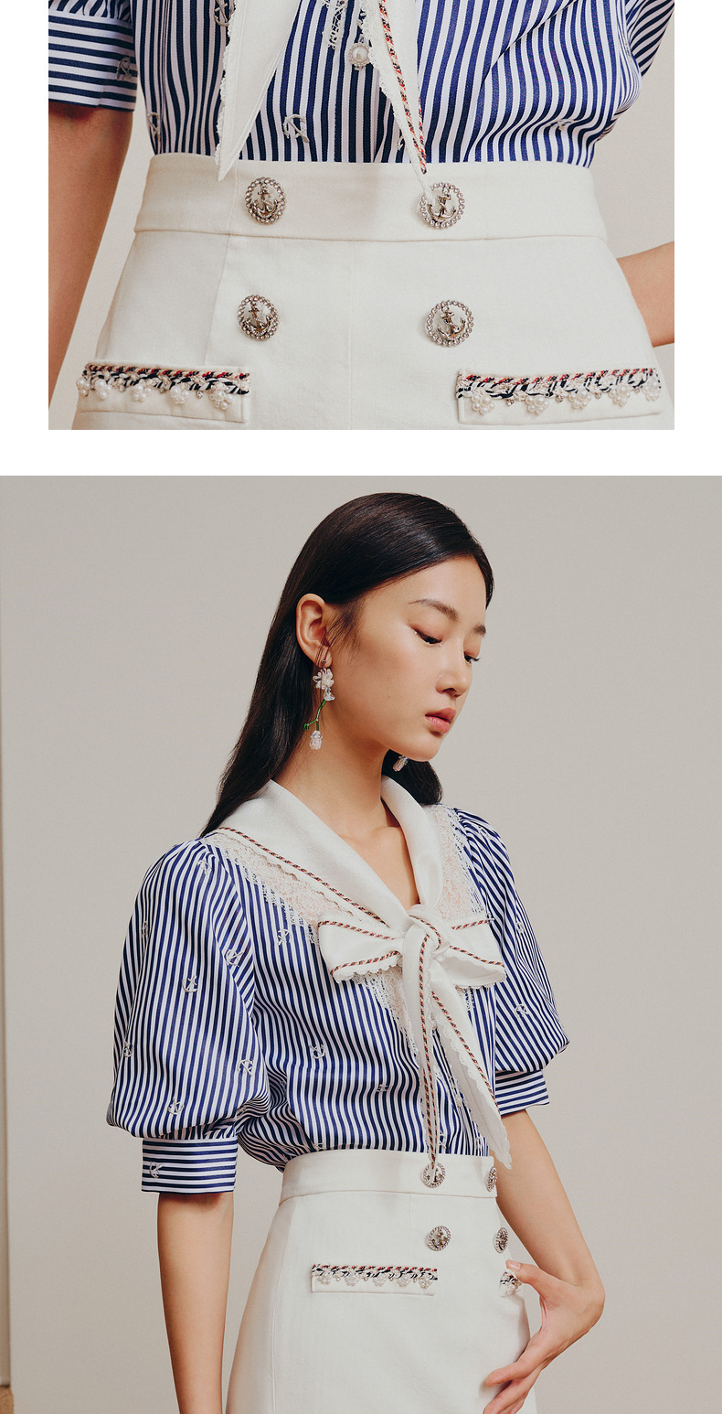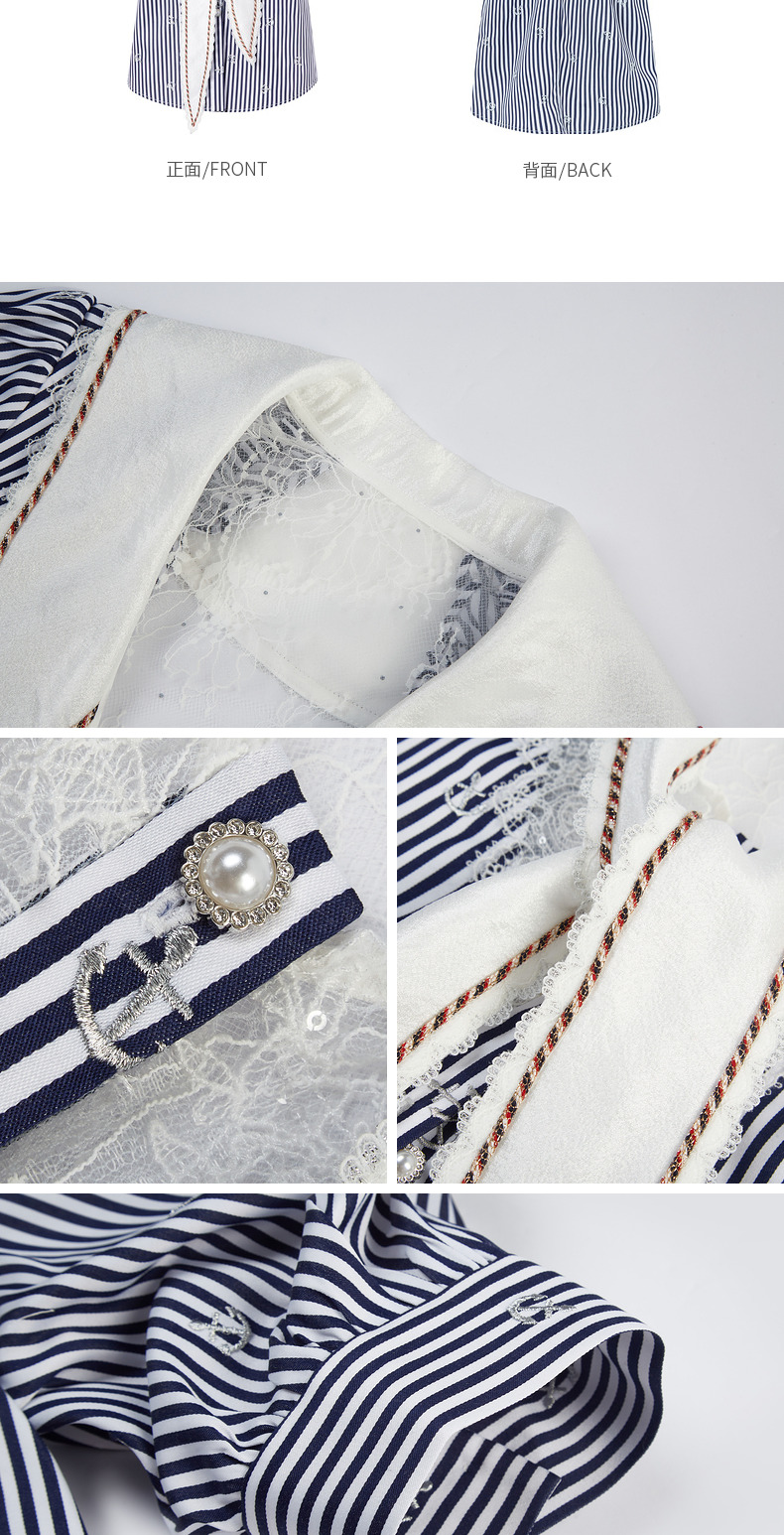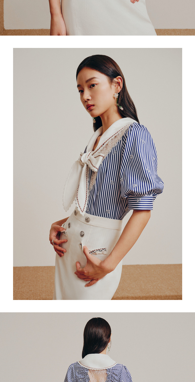 MAXRIENY海军风蓝白条纹复古撞色领衬衫上衣(货号:MC88TP362)