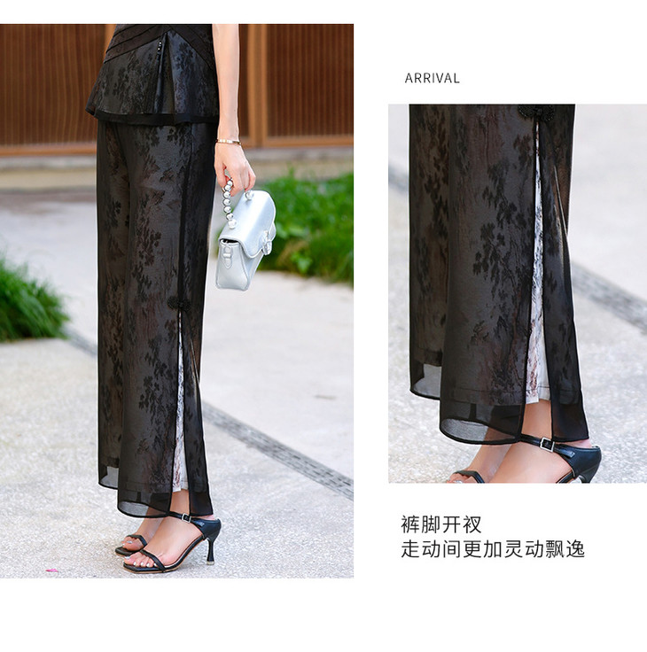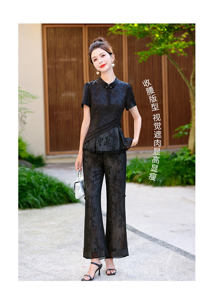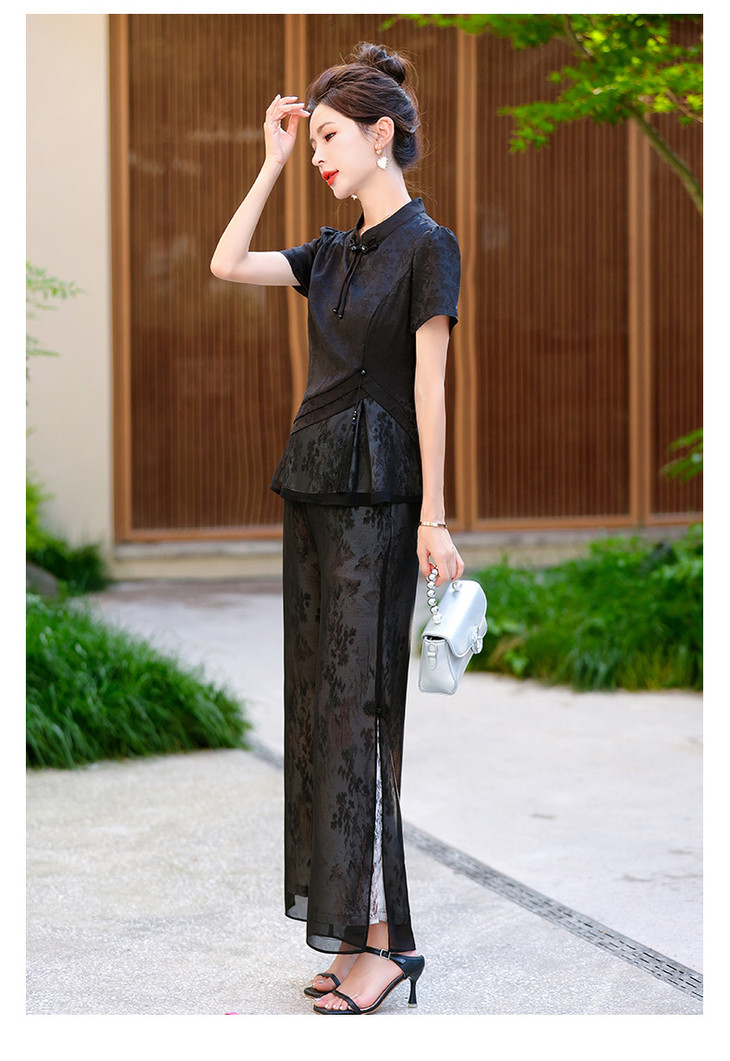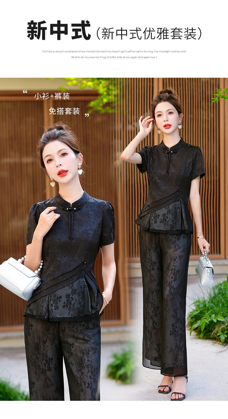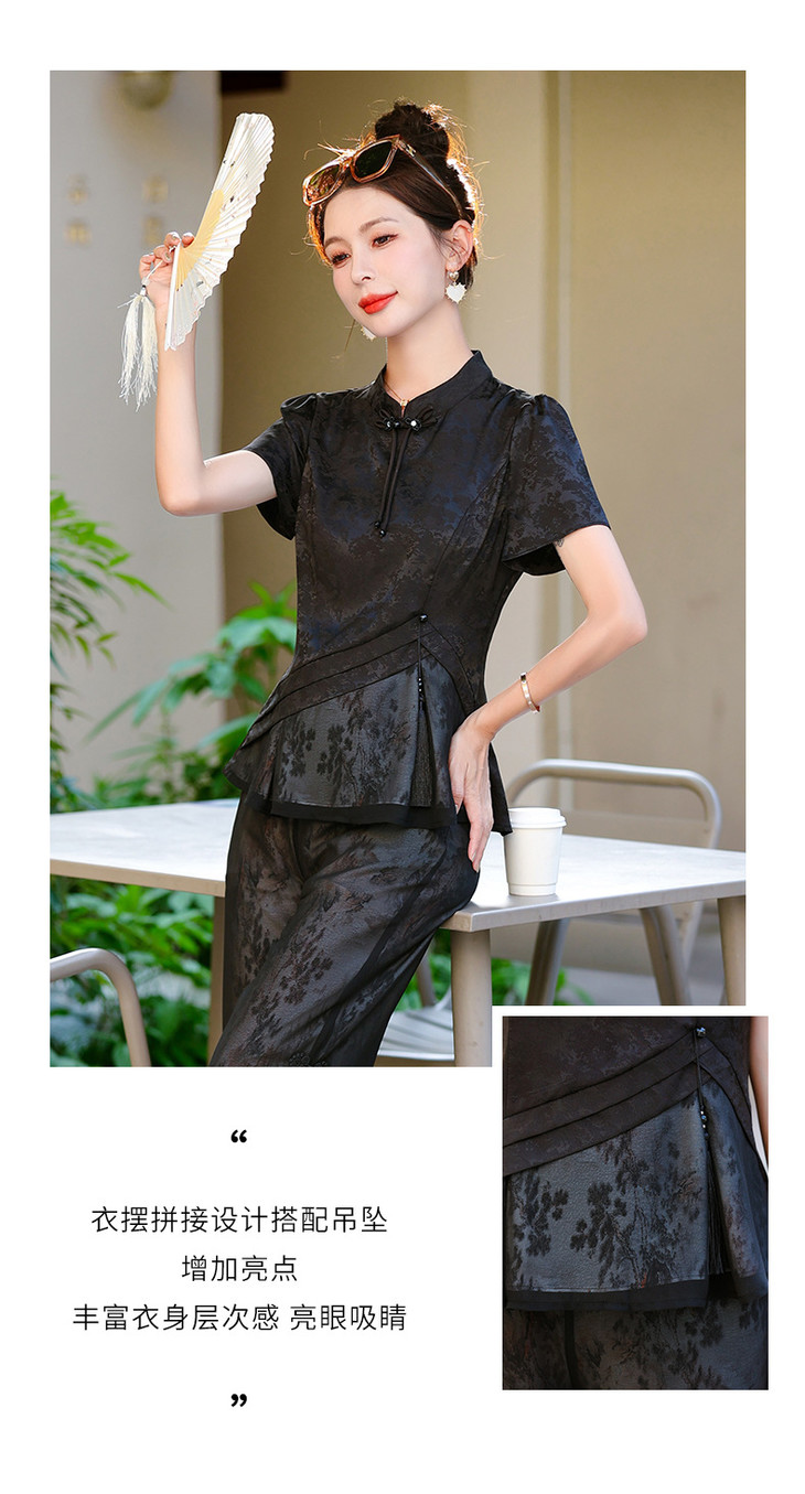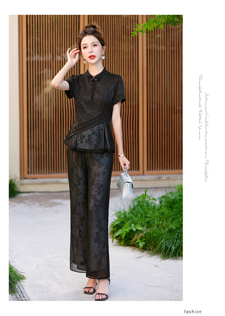国风套装夏季收腰褶皱小衫直筒开衩阔腿裤两件套 QYM-TB-FD1195-Y