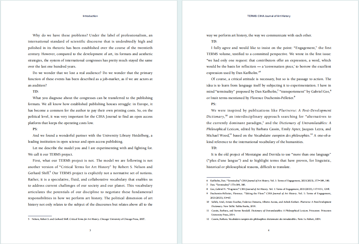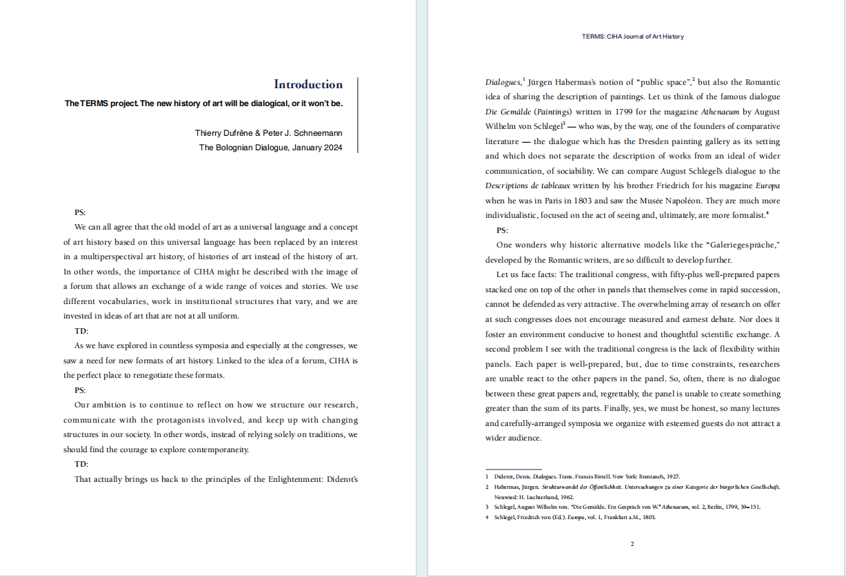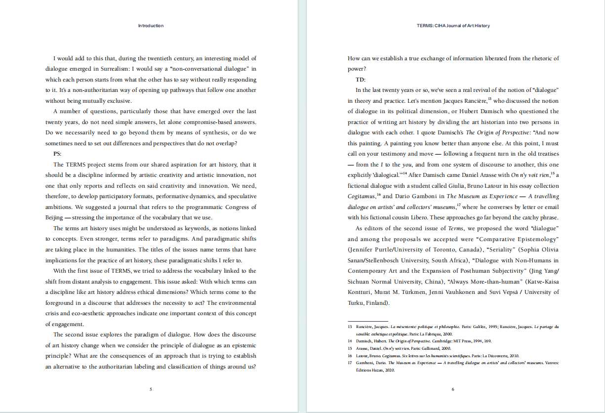 CIHA Journal of Art History (国际艺术史学会学刊)旨在为世界各地艺术史研究学者创造一个展示自己学术成果的平台,以此促进国际艺术史研究与艺术史教育的交流与发展。本期主编彼得•施内曼(Peter J. Schneemann)和蒂里•迪弗勒内(Thierry Dufrêne)选取由中国、加拿大、芬兰、南非等国家的学者完成的多篇论文,展示不同文化背景的学者如何理解、阐释“对话”这一概念。来自不同文化背景的作者们,从中西传统艺术到现代艺术等多个主题,展示“对话”原则赋予艺术与艺术史研究的创造力与生命力。