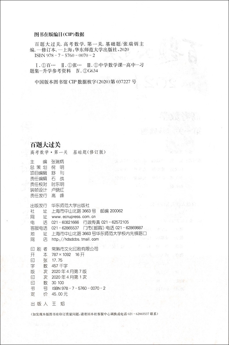 2021版百题大过关 高考数学 第一关基础题 文科版 修订版 华东师范大学出版社 高一高二高三适用精选全国真题详解高考复习辅导用书