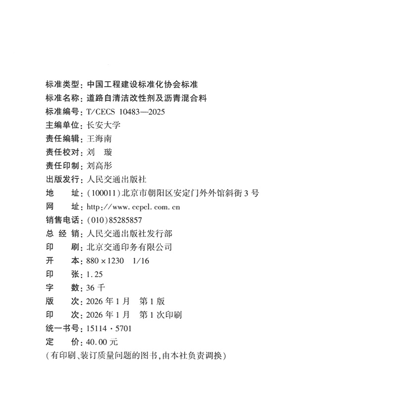 书名:道路自清洁改性剂及沥青混合料(T/CECS 10483—2025)