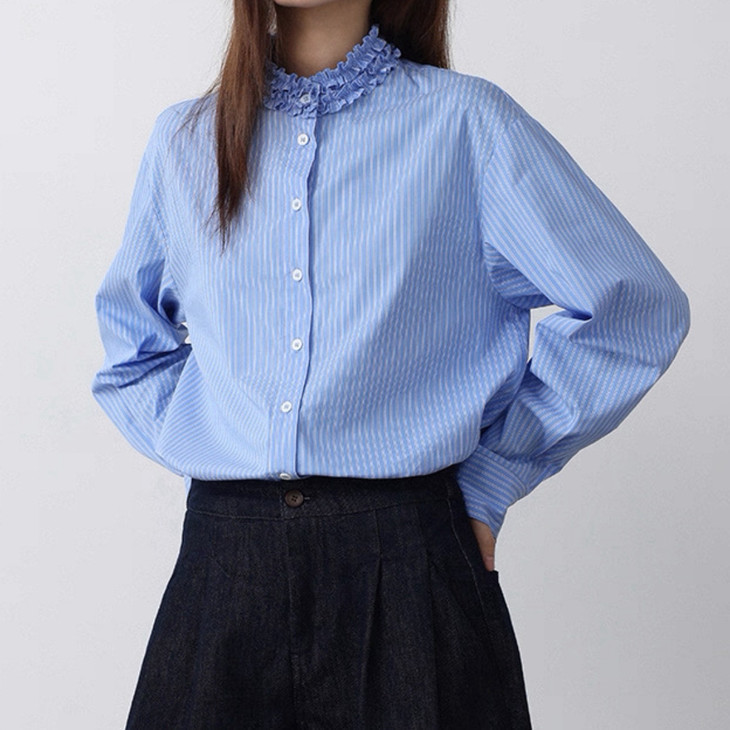 【品名】风琴褶长袖花边领法式气质上衣3281