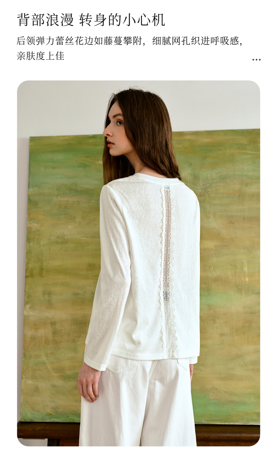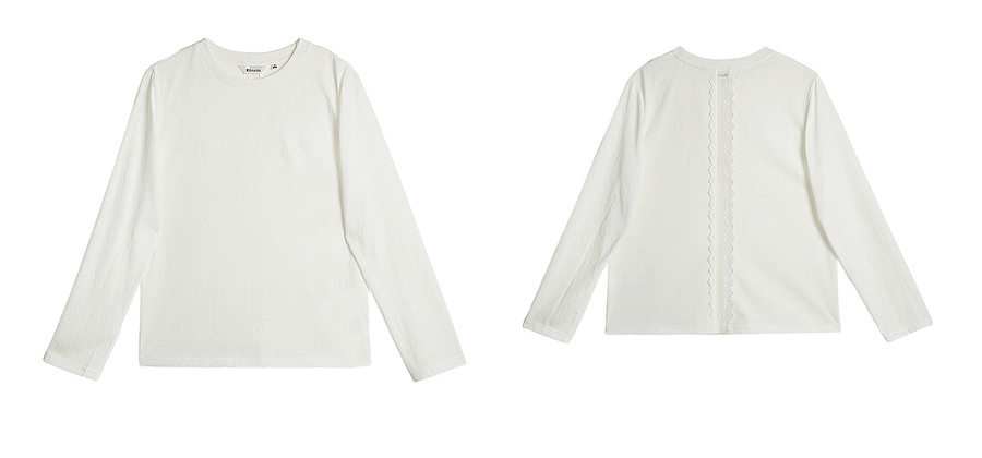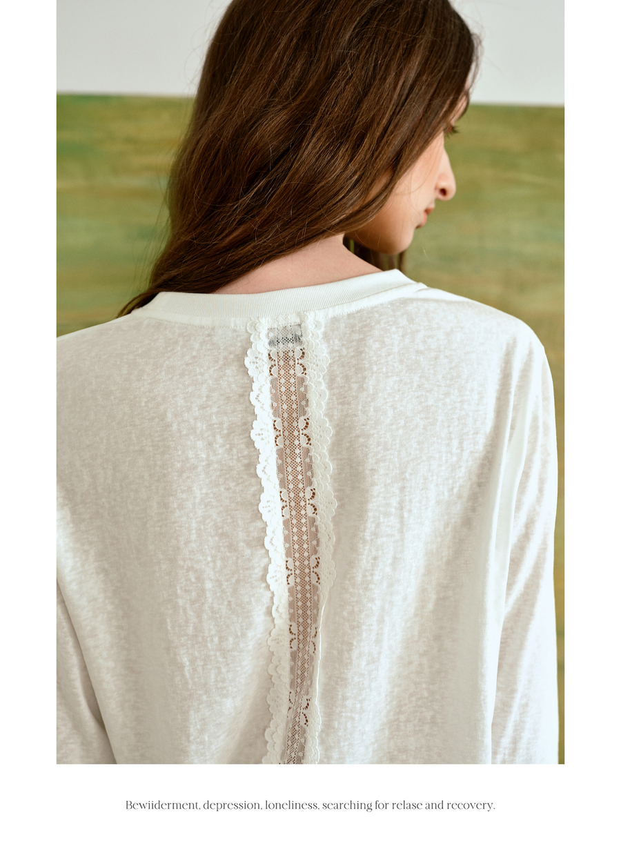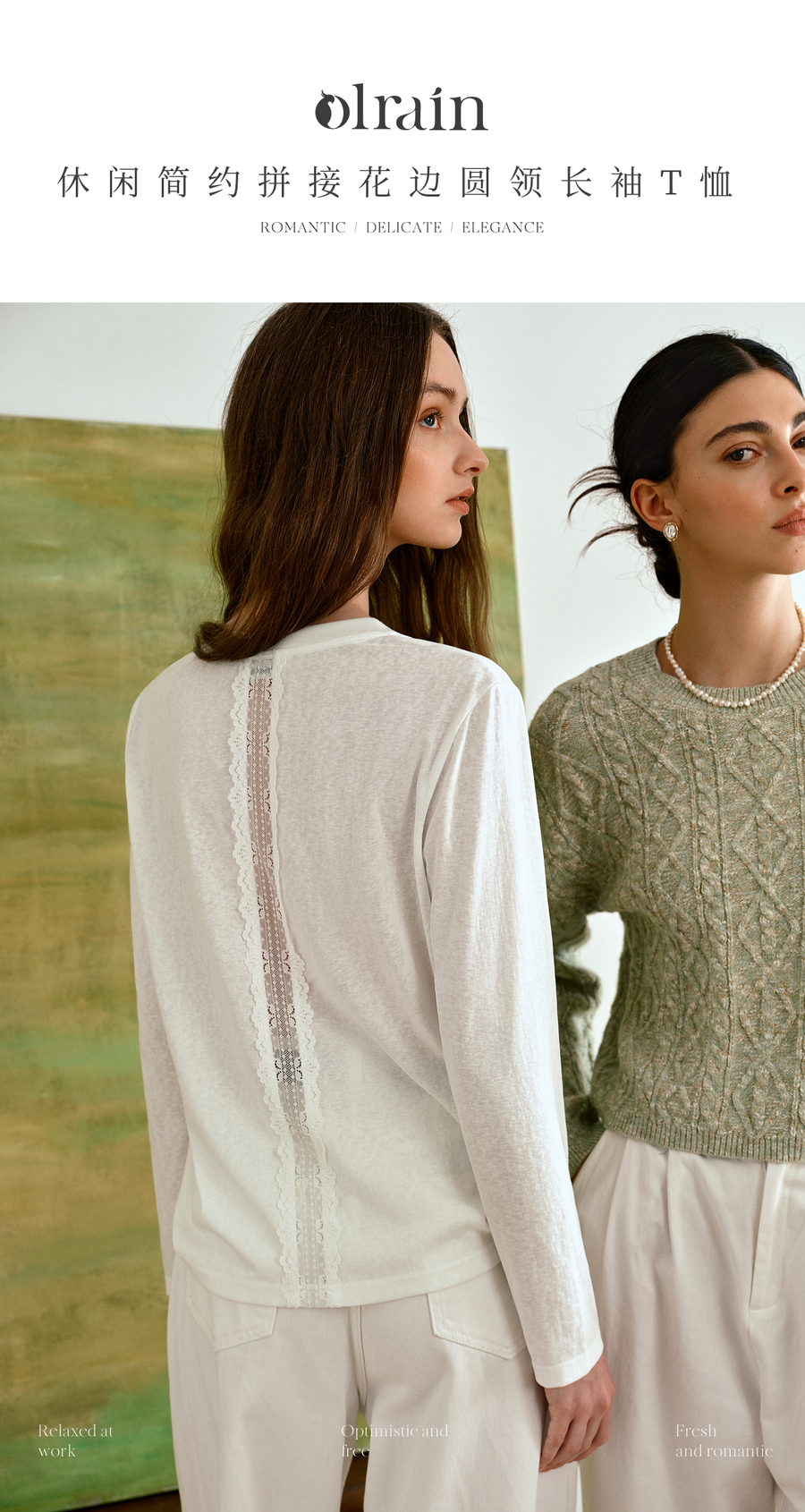 OLrain欧芮儿通勤拼接花边圆领长袖百搭T恤2025秋季新款法式上衣