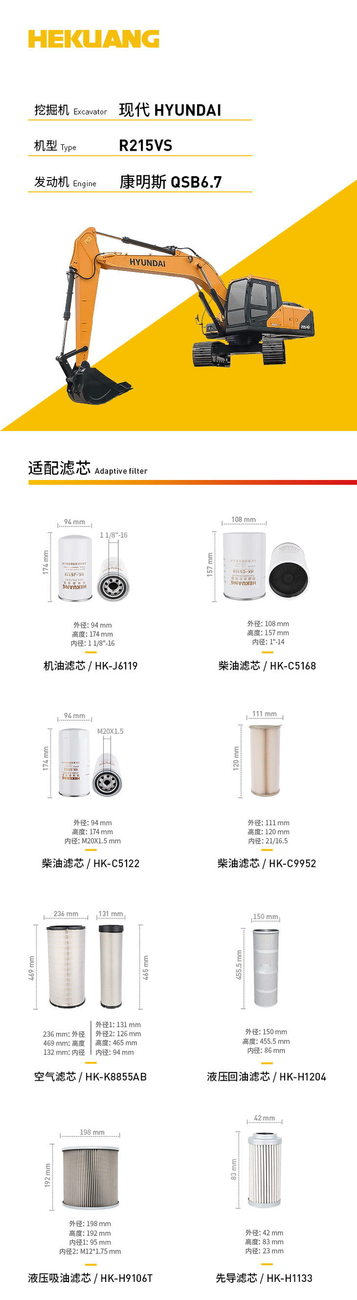 现代R215VS(康明斯QSB6.7)挖掘机滤芯 机油柴油空气滤芯 液压油先导滤芯