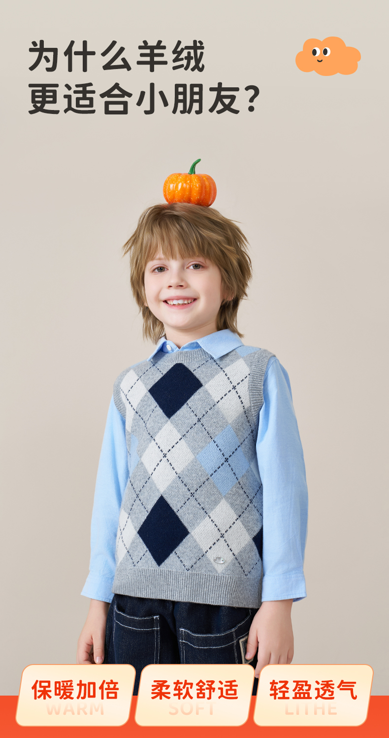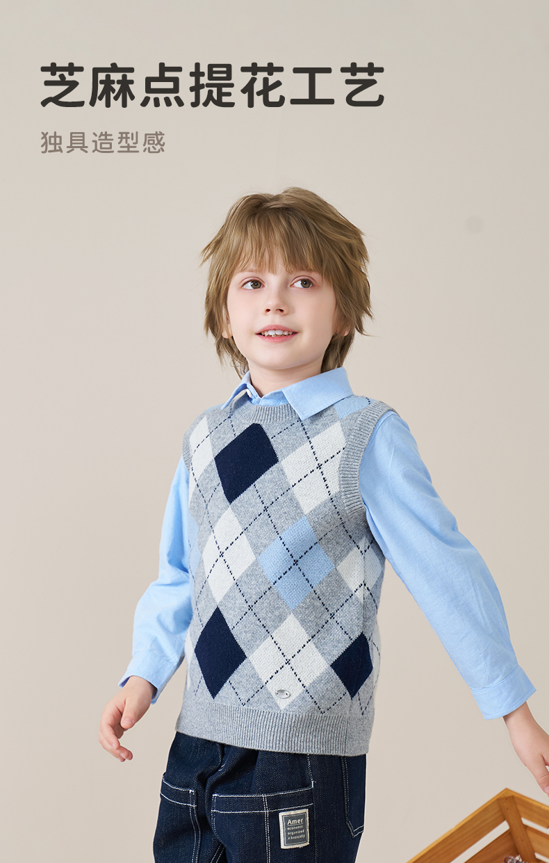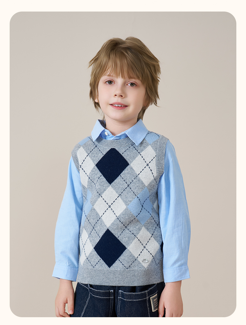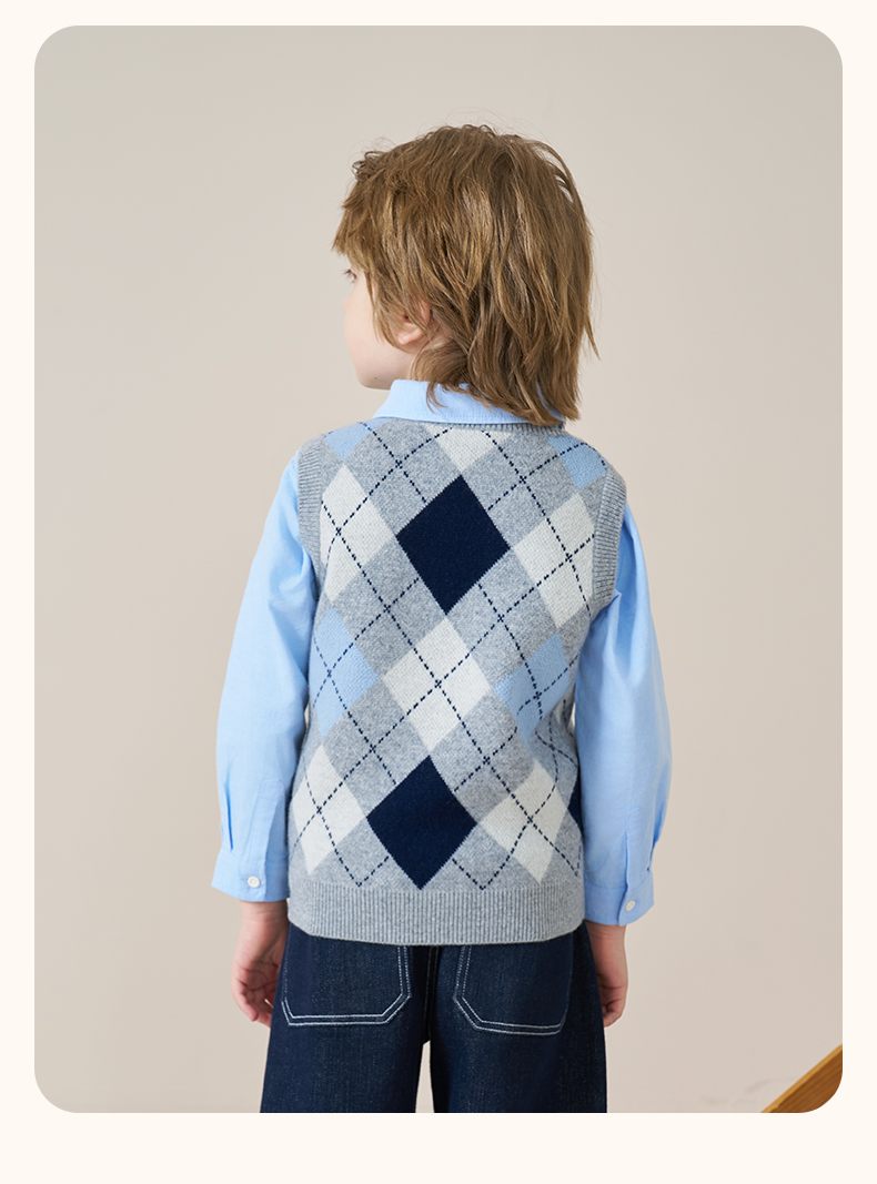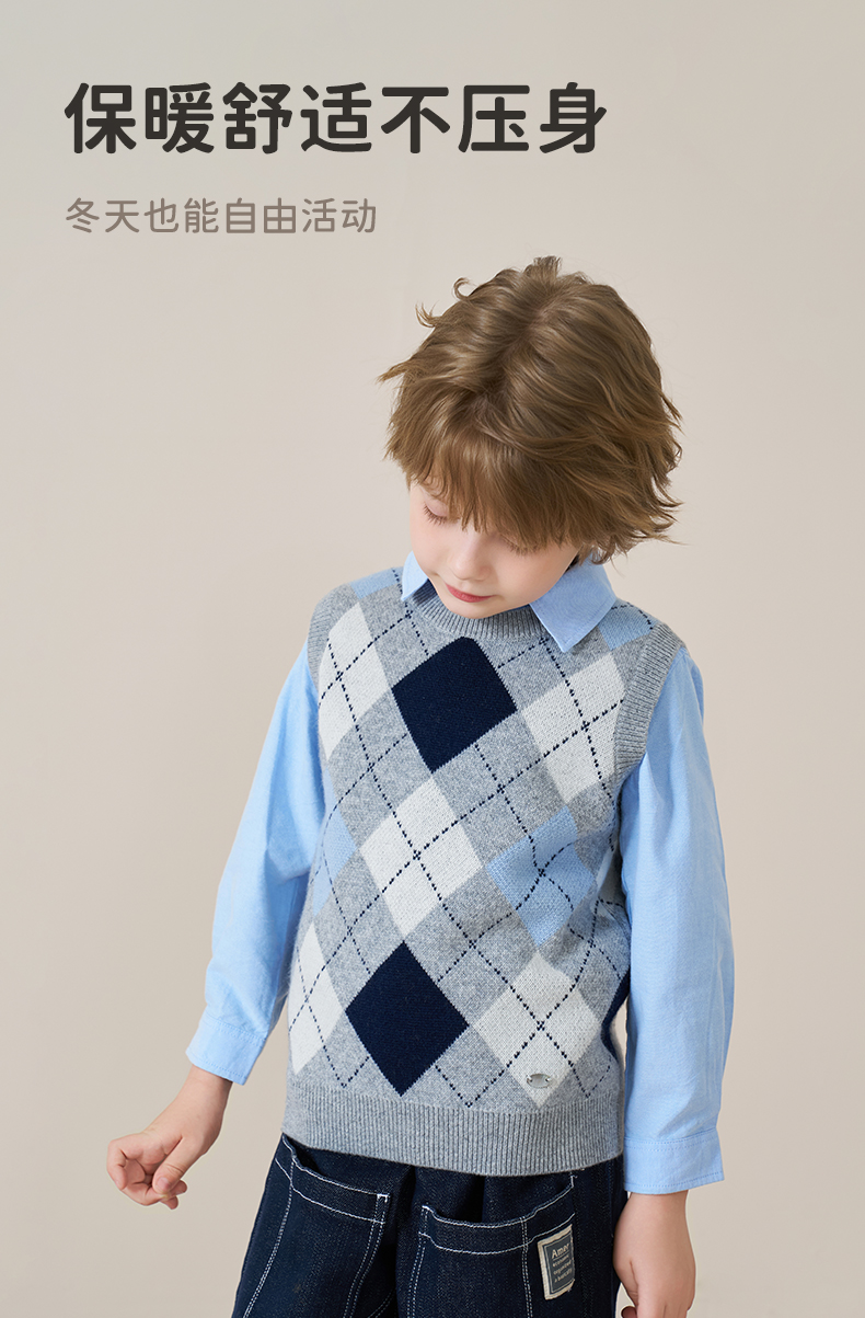 mettekids儿童100%羊绒衫2025秋冬款格纹毛衣马甲学院风男童背心