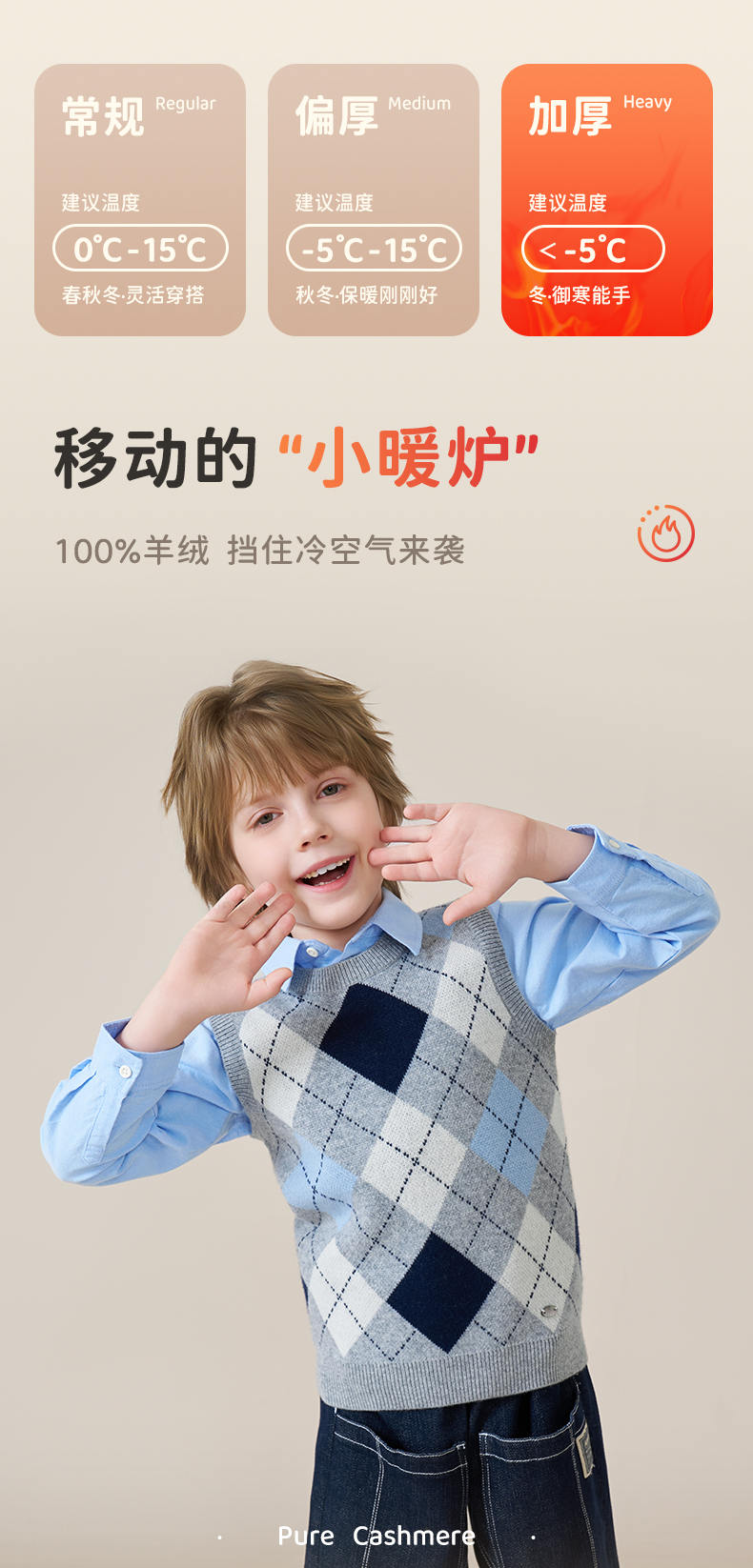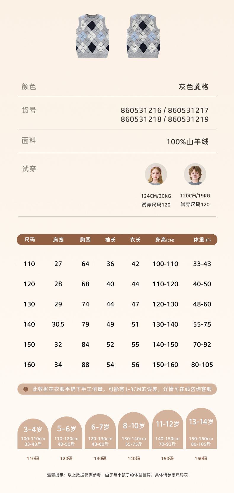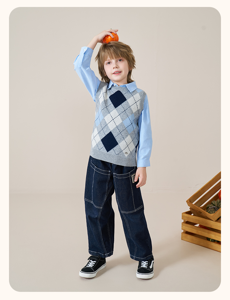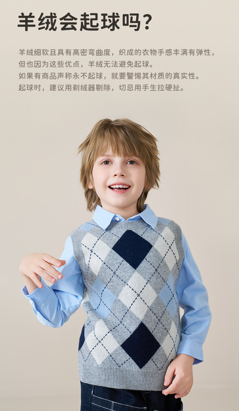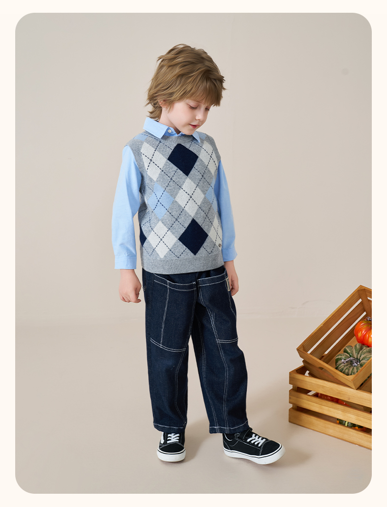 mettekids儿童100%羊绒衫2025秋冬款格纹毛衣马甲学院风男童背心