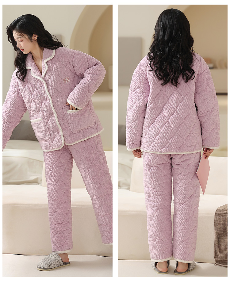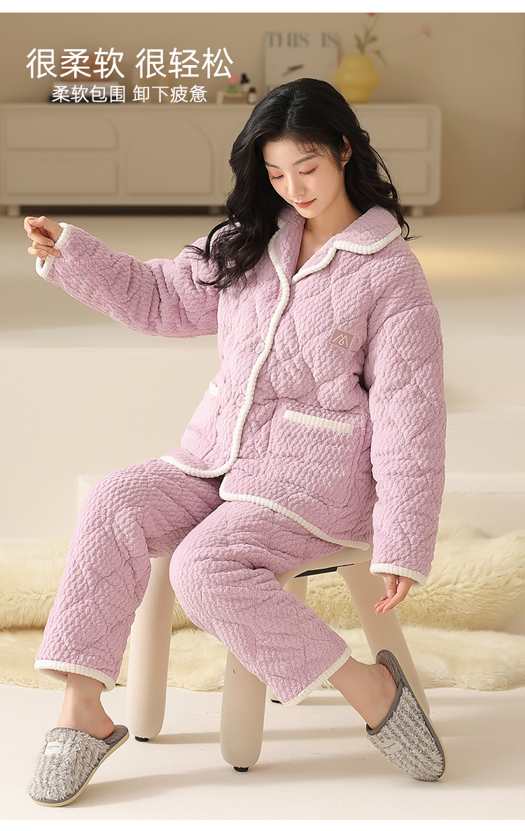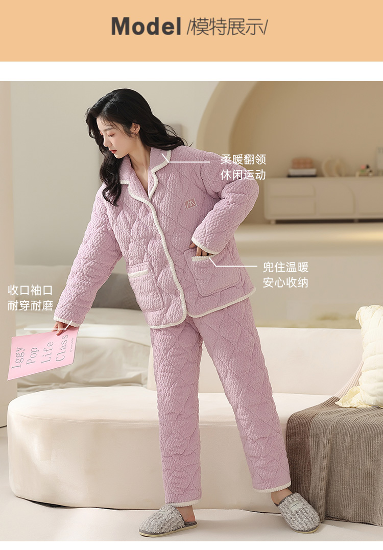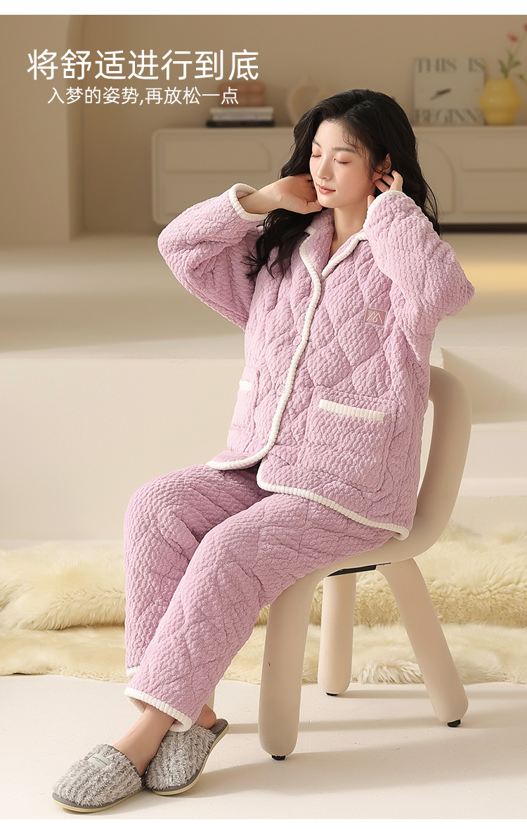洁丽雅正品保暖加绒夹棉珊瑚绒女士睡衣女大码三层冬款加厚家居服套装