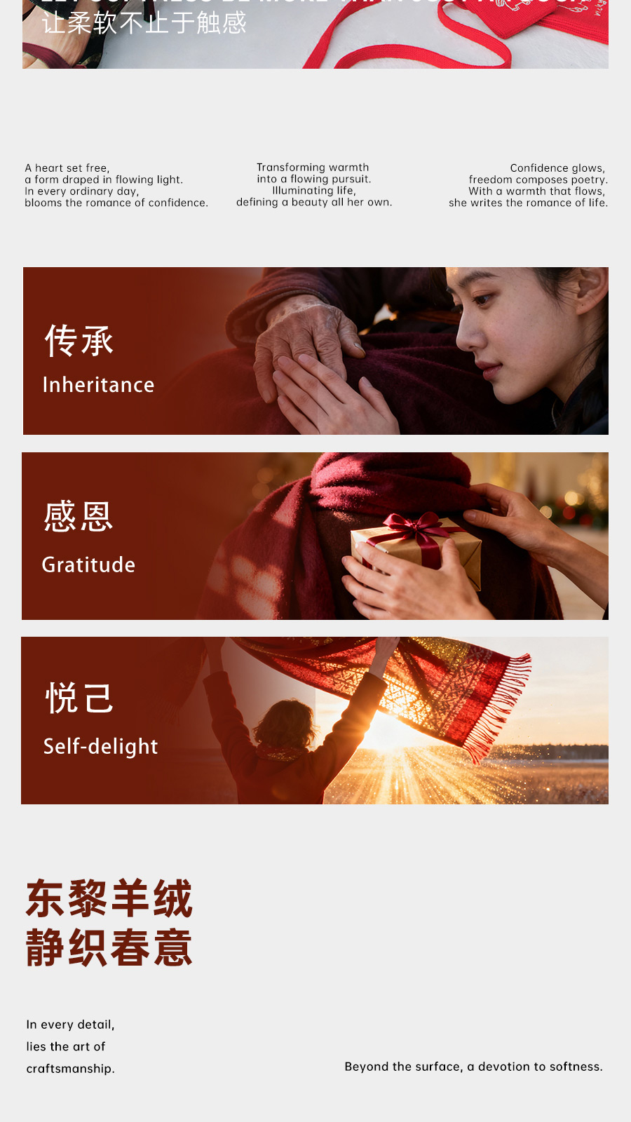 东黎羊绒是赤峰东荣集团自主品牌,自有牧场/羊绒制品全产业链优势,实现了羊绒从“牧场”到“商场”的华丽转变。