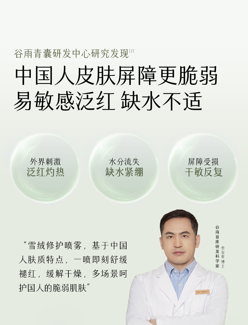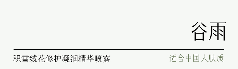 - 谷雨,更适合中国人肤质的植萃美白。专研中华珍稀美白植萃光甘草定,深入研究中国人肤质特点,打造中国女性独有的仙气白。