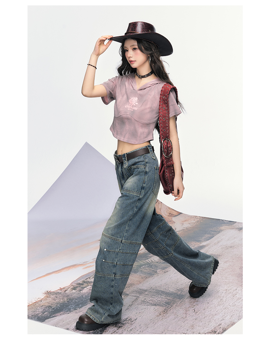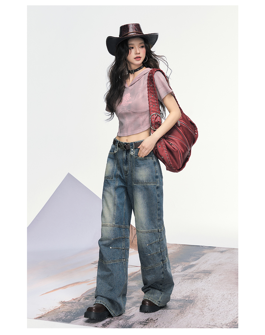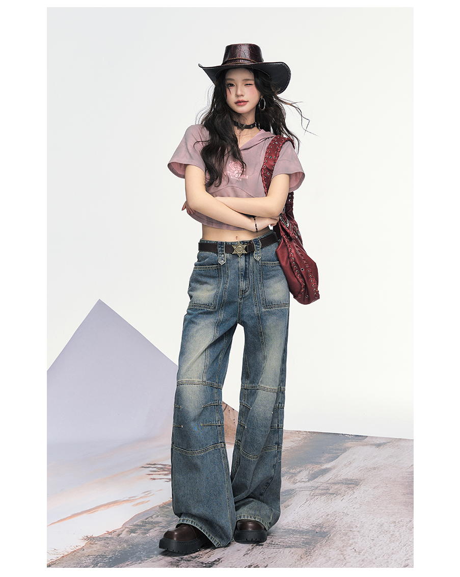 P&X设计师女装 美式高街复古阔腿宽松牛仔长裤女 825210193 蓝色