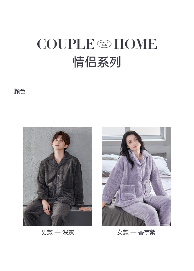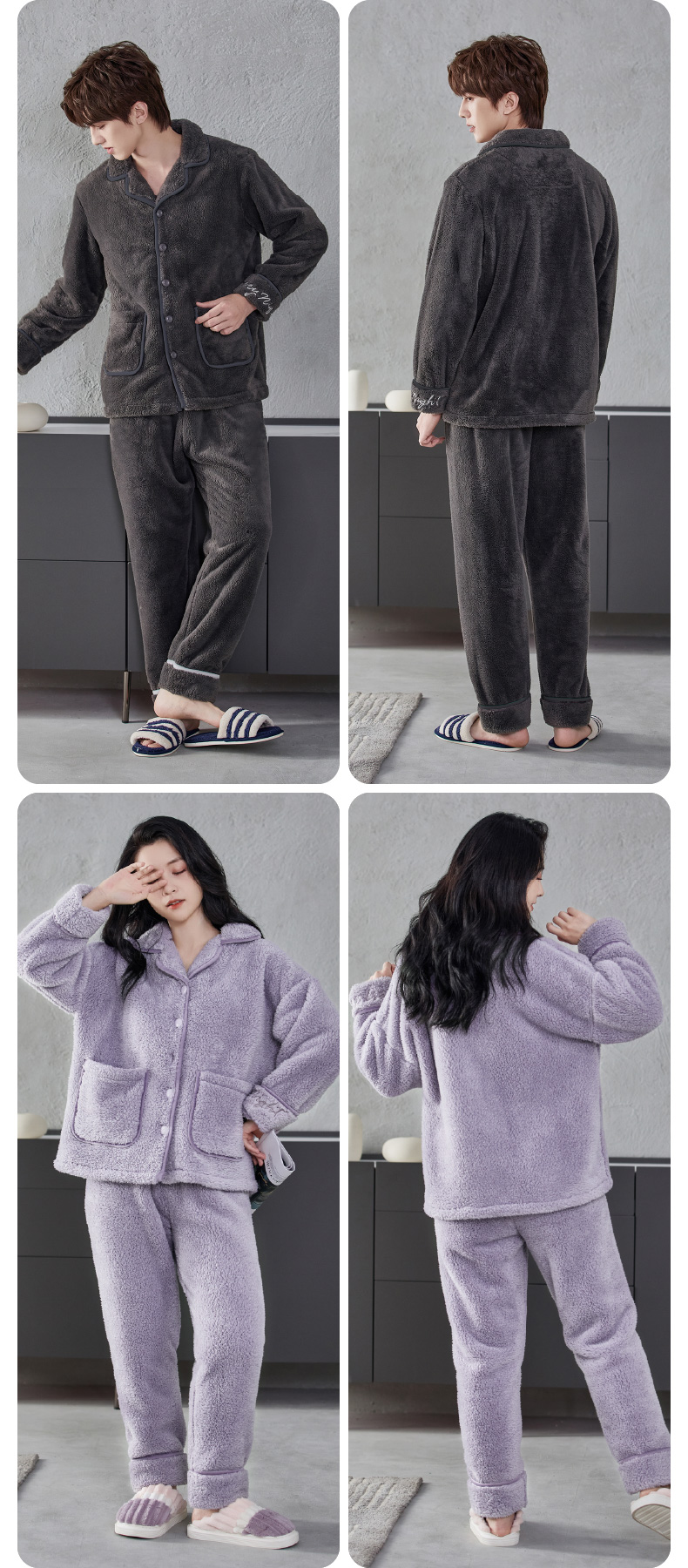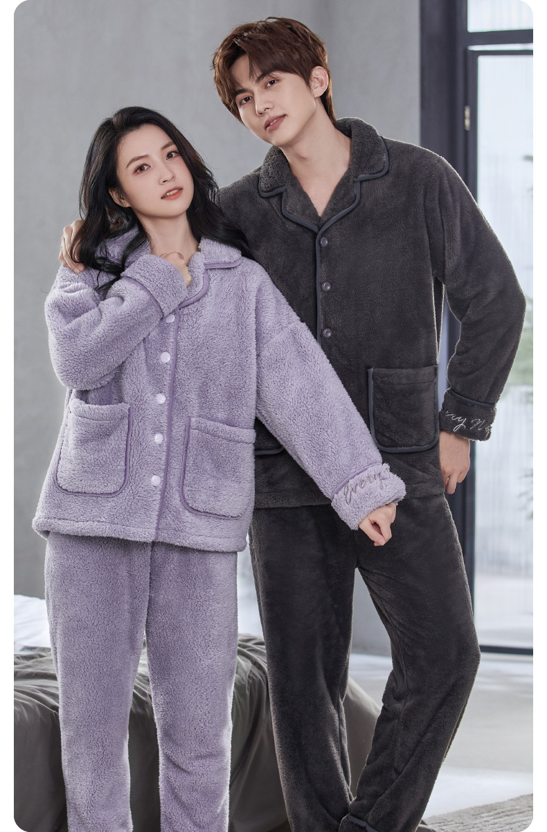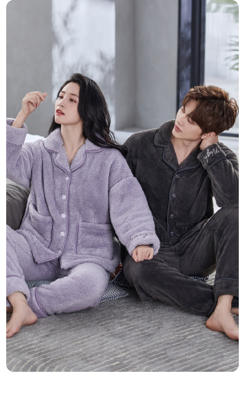 芬腾睡衣秋冬情侣男女士珊瑚绒纯色加绒加厚法兰绒保暖家居服套装