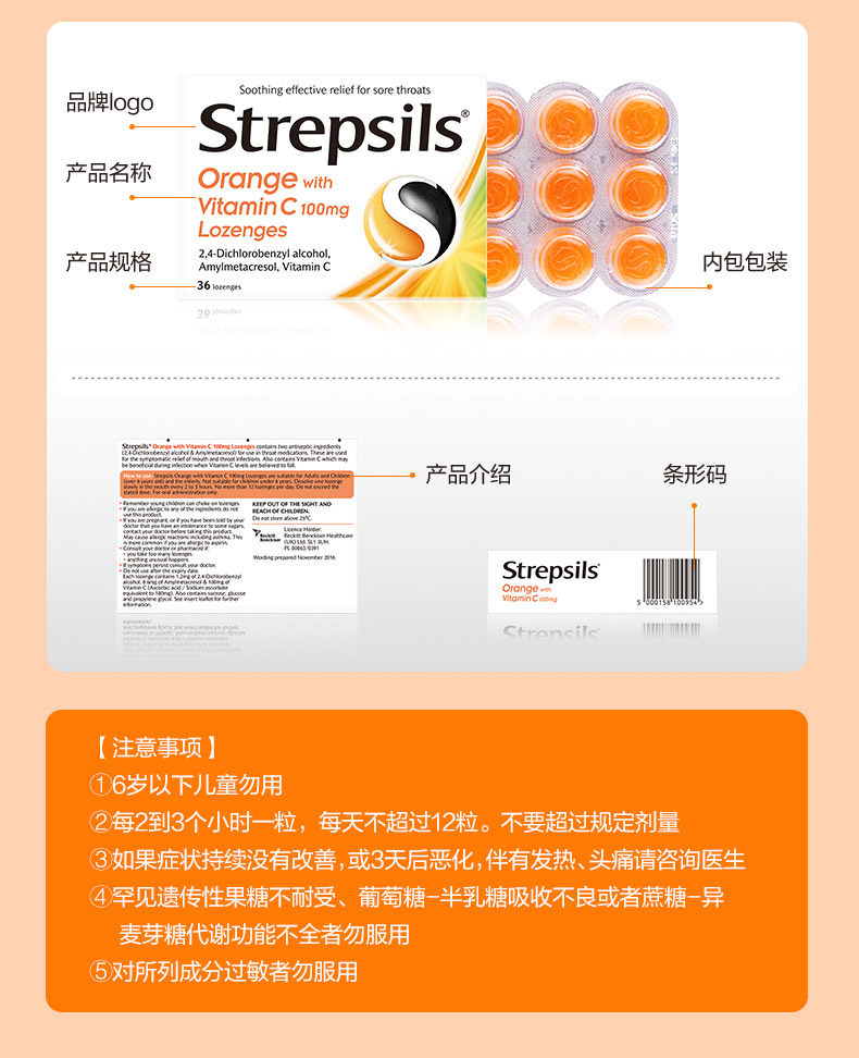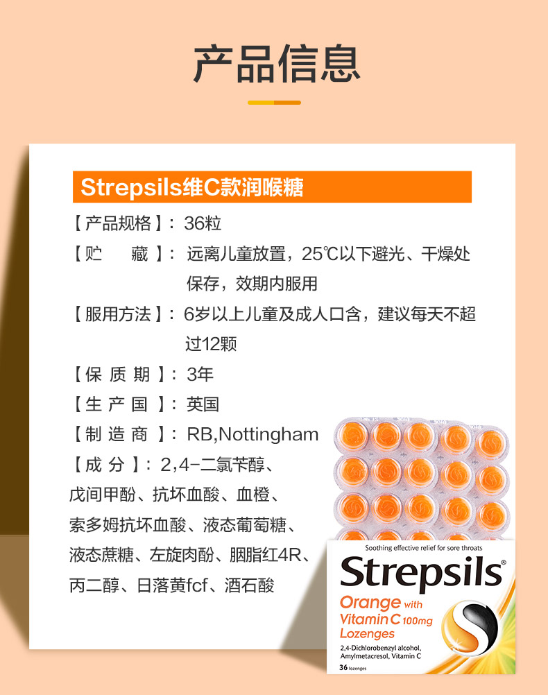 【香港直邮】Strepsils使力消 润喉糖维C款36粒