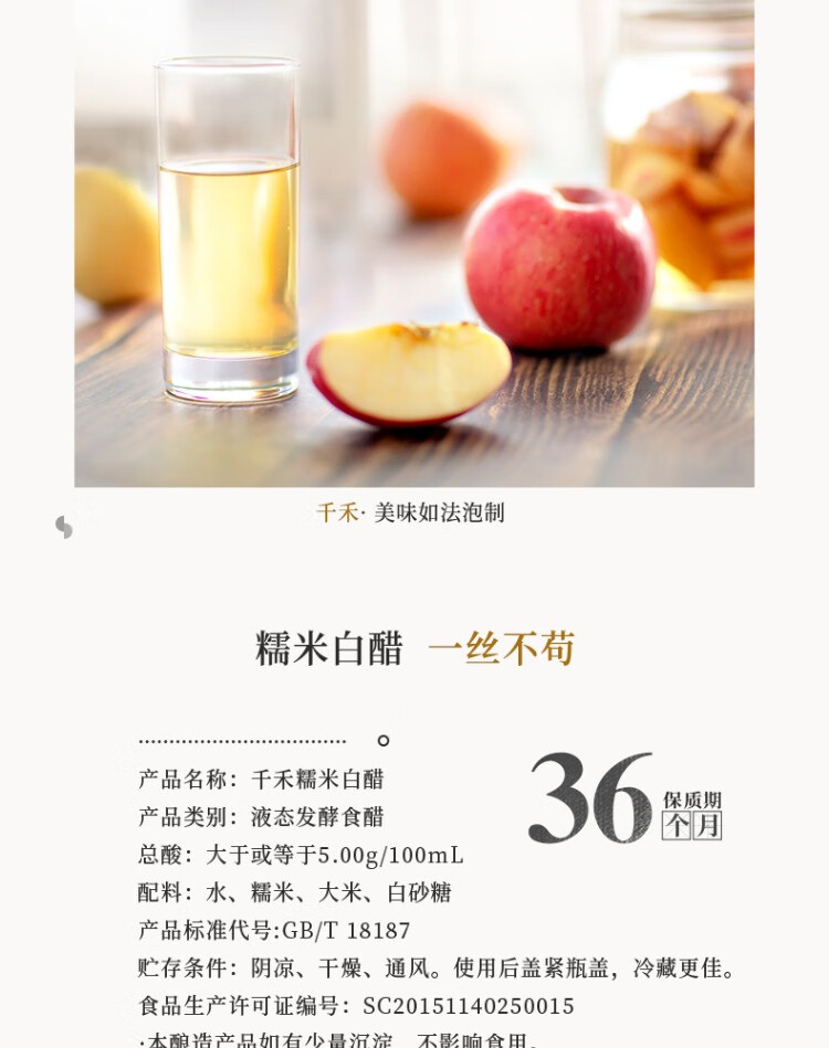 千禾 零添加白醋(糯米白醋)500ml/瓶
