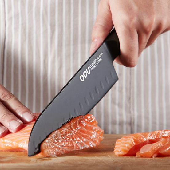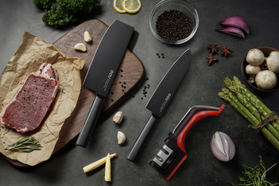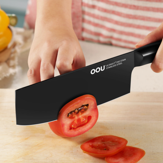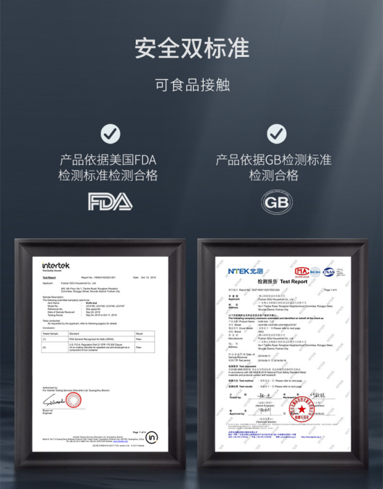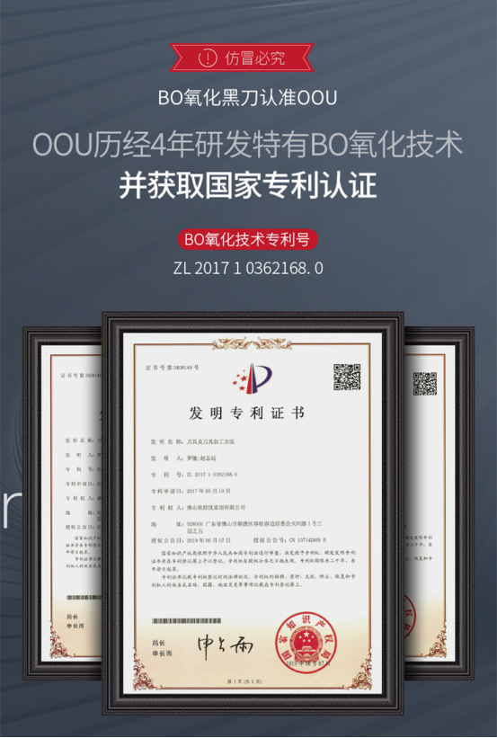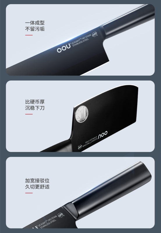 ①国标马氏体不锈钢;②BO氧化防锈专利;③轻量化处理;④人体工学受力设计;⑤现代简约流线刀型;⑥通过中美食品安全标准检测;⑦荷叶光面原理