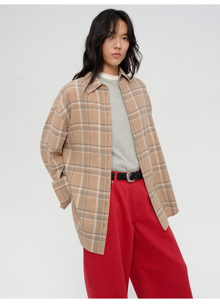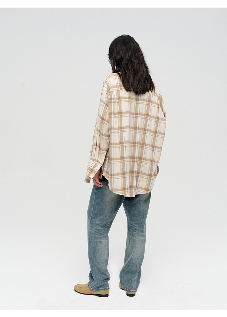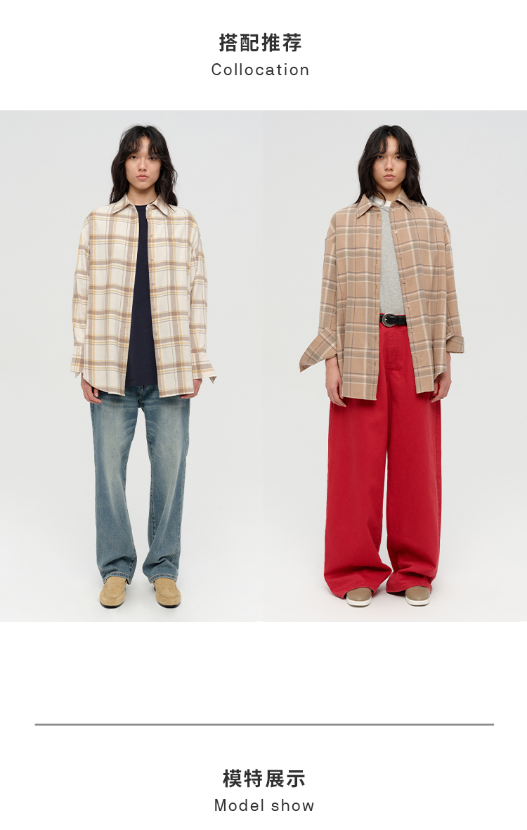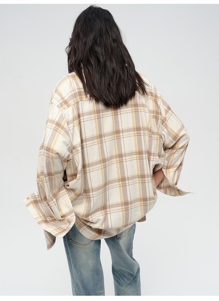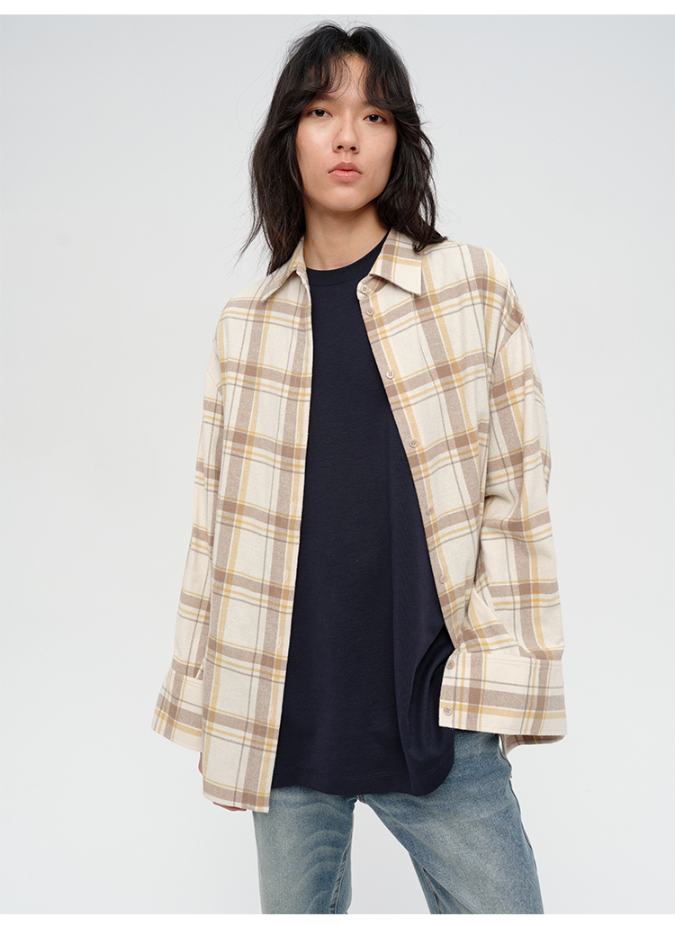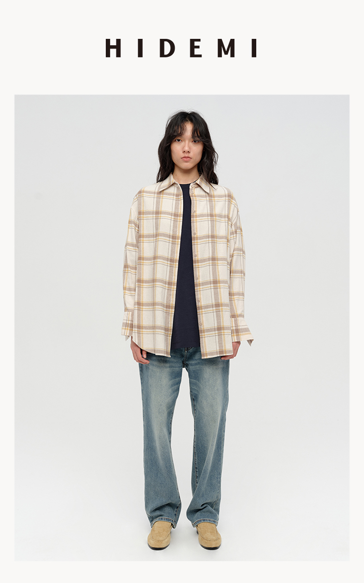 HIDEMI 【吴谨言同款】复古色织格纹长绒感磨毛高品质极简廓形纽扣衬衫 卡其米格/奶白格
