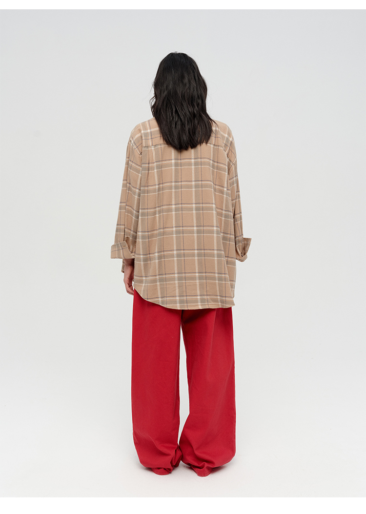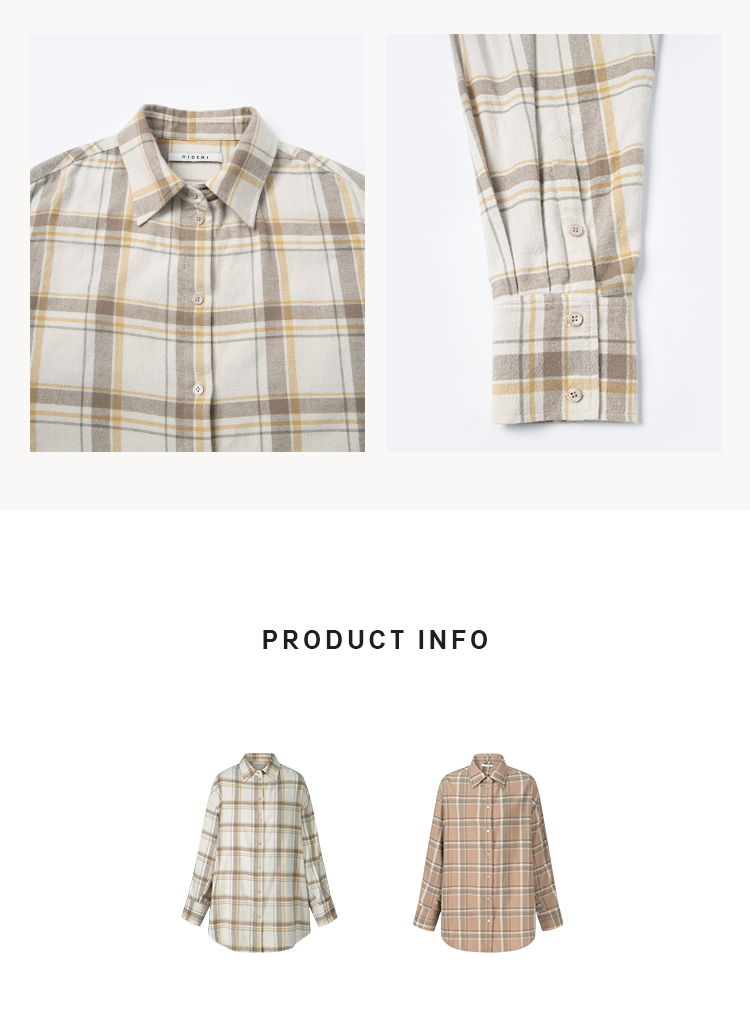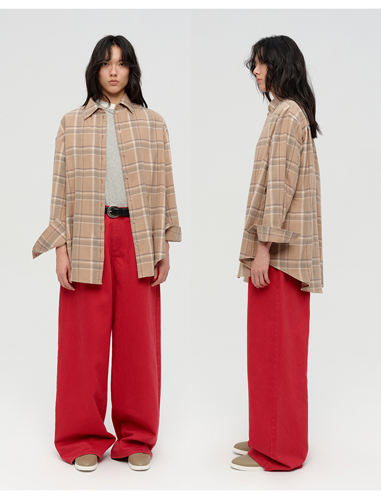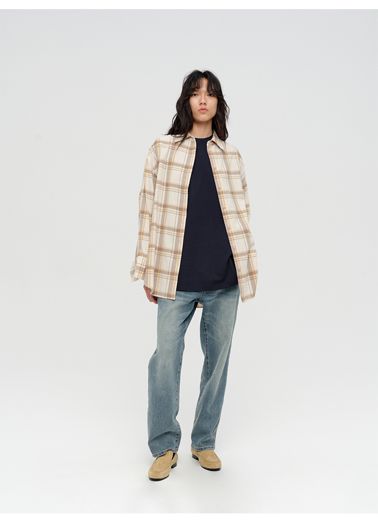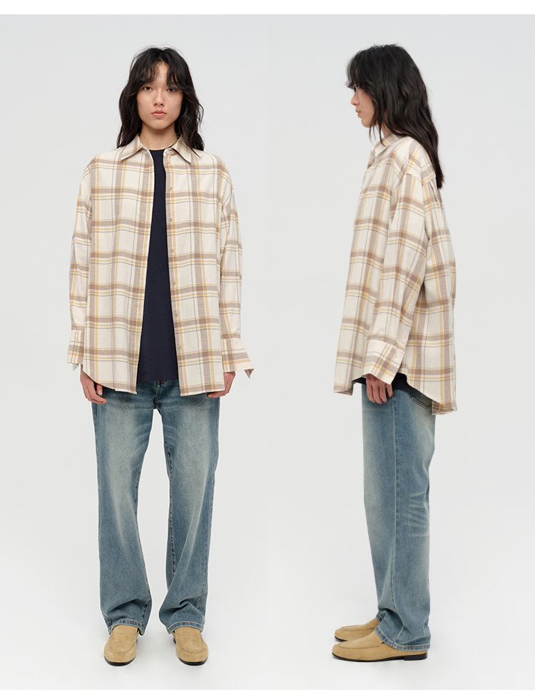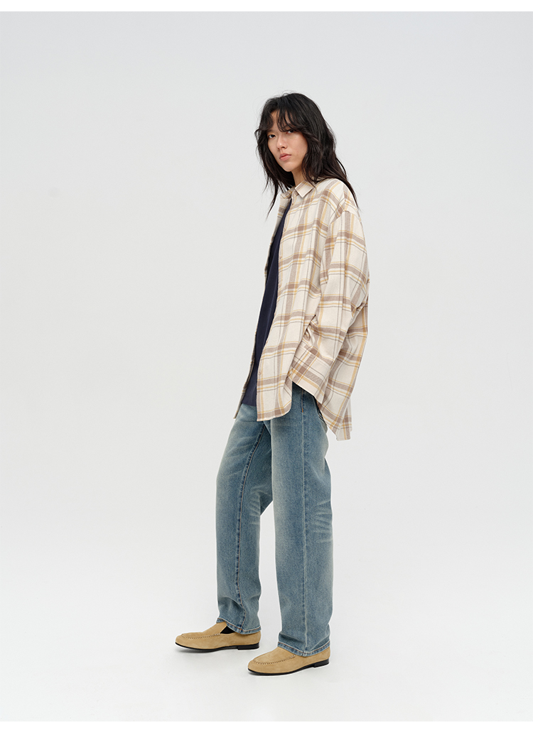 HIDEMI 【吴谨言同款】复古色织格纹长绒感磨毛高品质极简廓形纽扣衬衫 卡其米格/奶白格