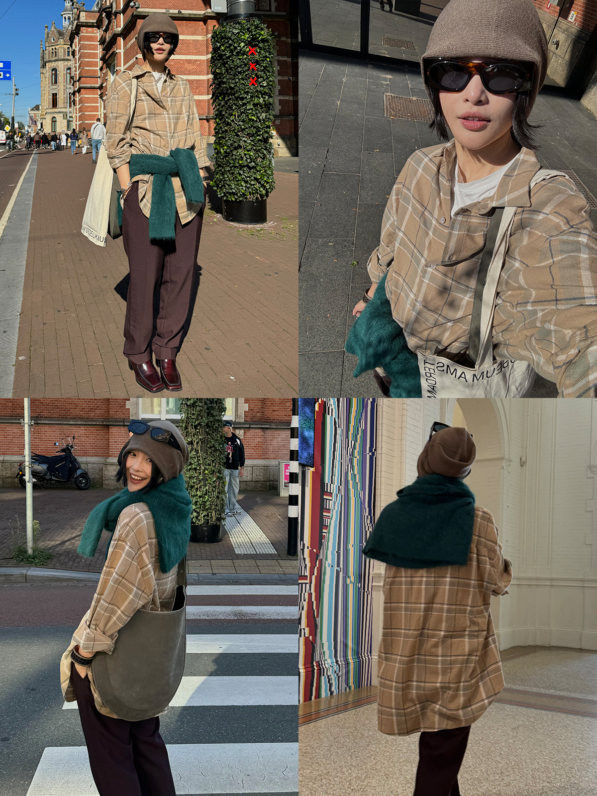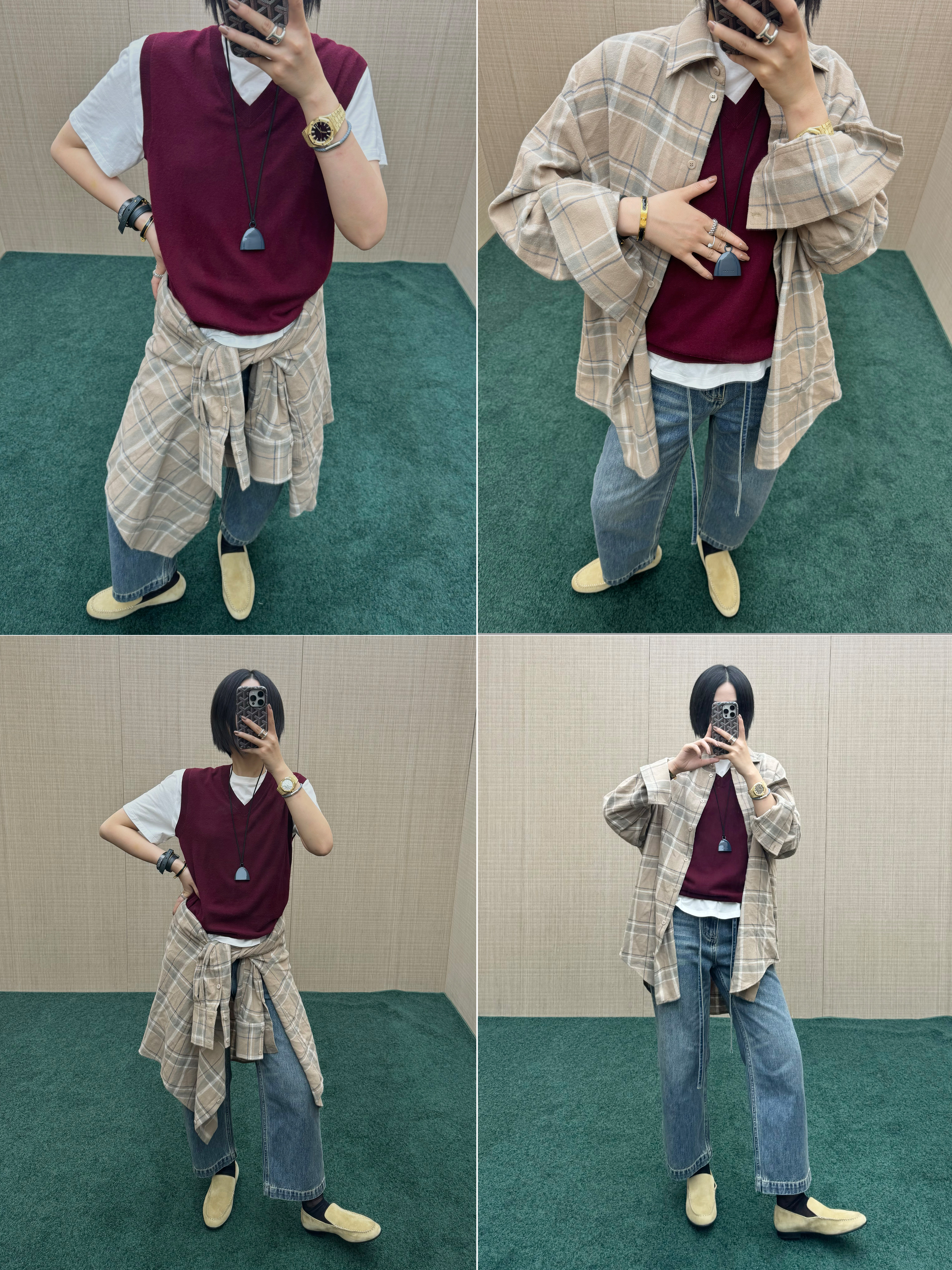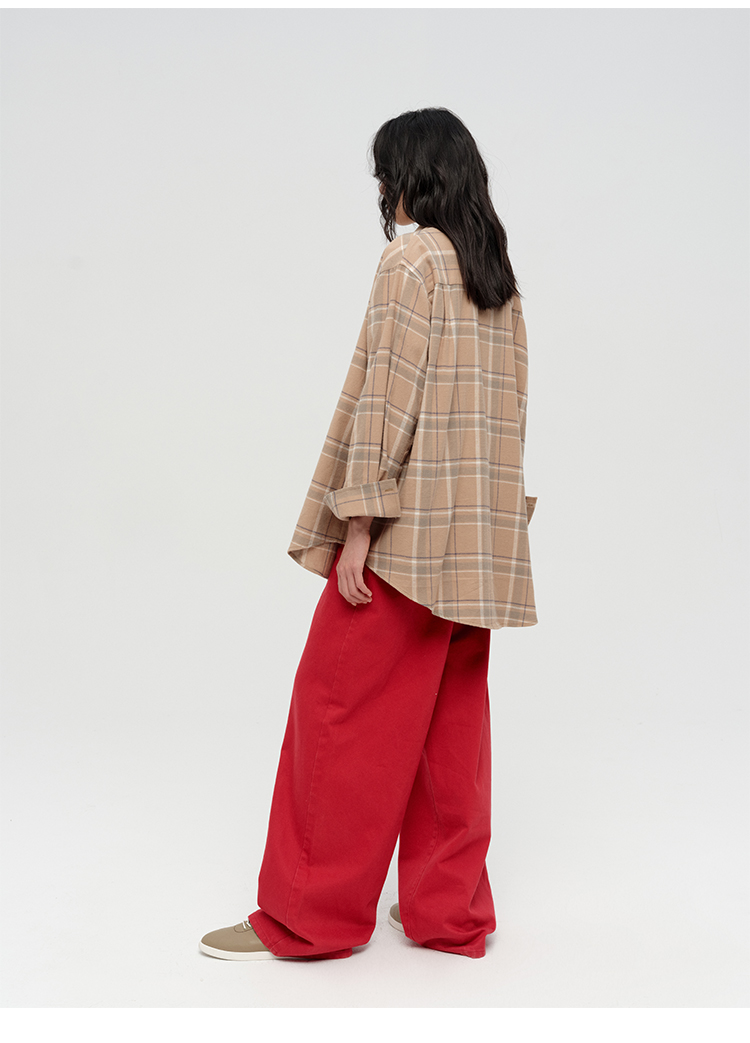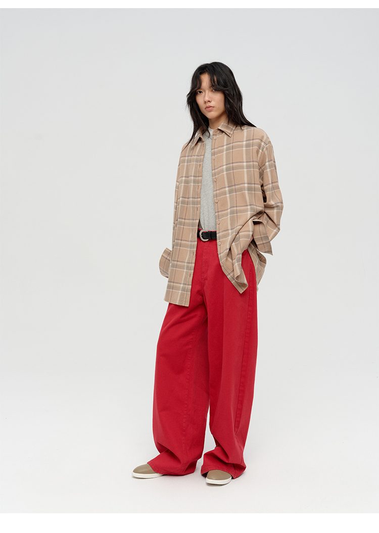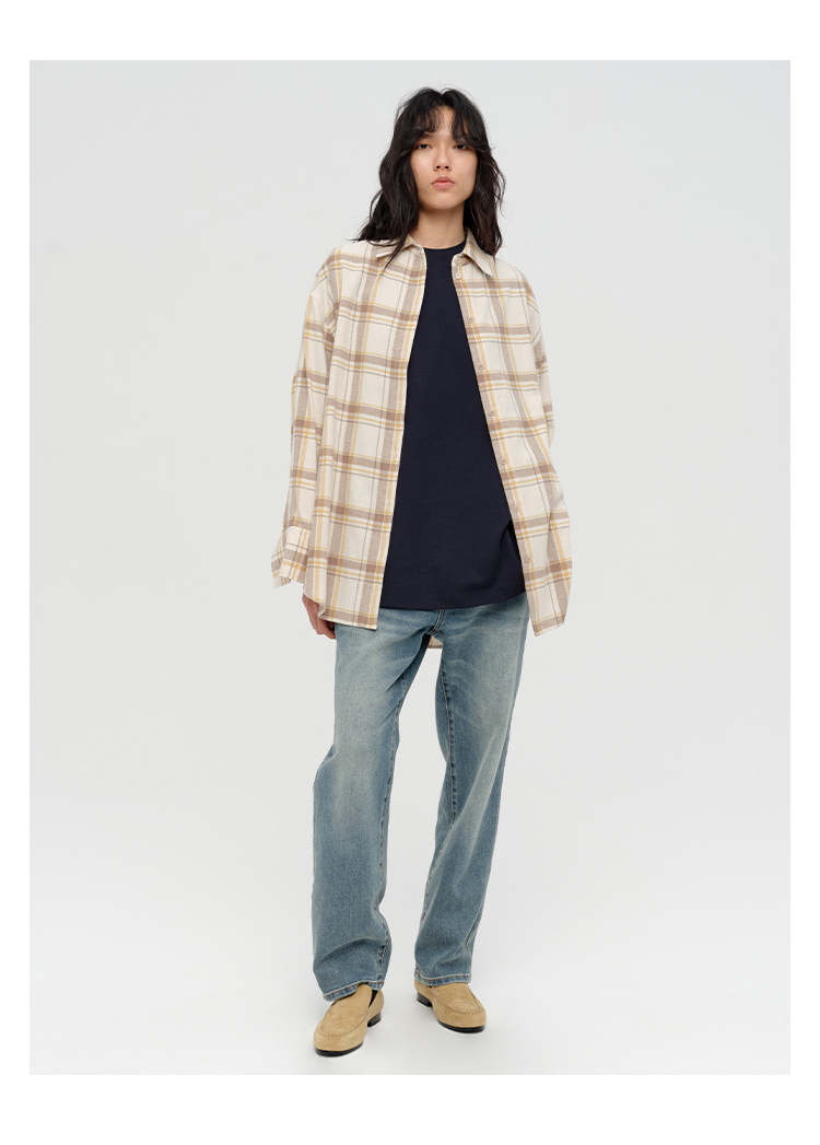 HIDEMI 【吴谨言同款】复古色织格纹长绒感磨毛高品质极简廓形纽扣衬衫 卡其米格/奶白格