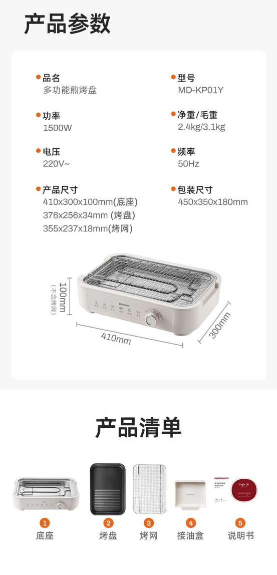 【产品尺寸】:400x290x125mm(底座)382x261x34mm(烤盘)347.5x227.5x25mm(烤网)