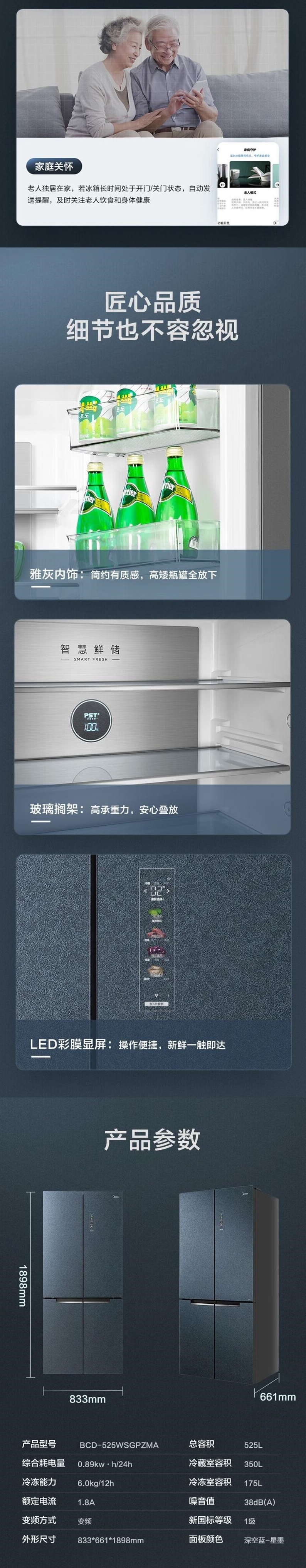 美的(Midea)(202651)525升十字对开门四门微晶一周鲜风冷无霜一级双变频大容量冰箱 BCD-525WSGPZMA深空蓝星墨