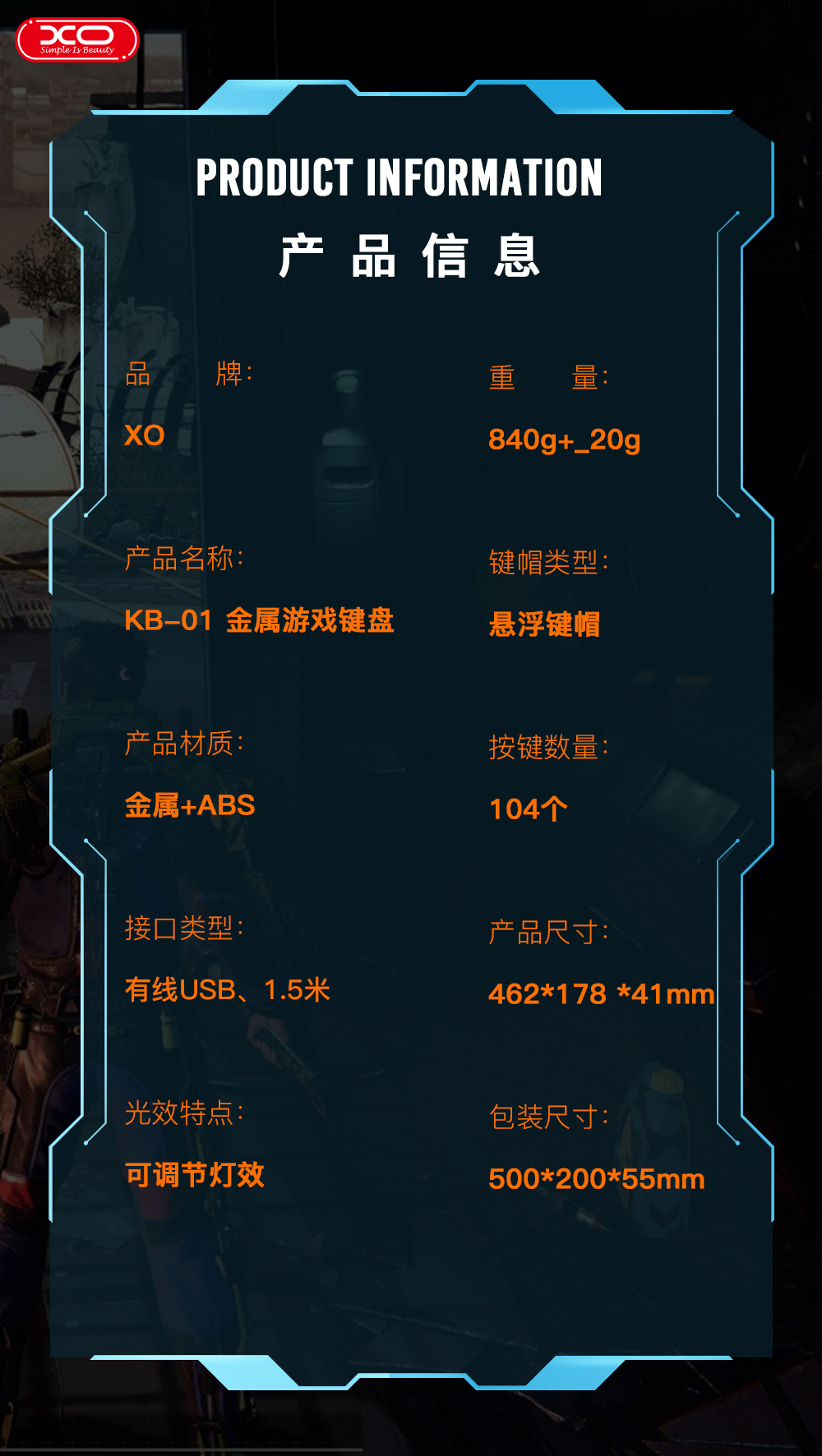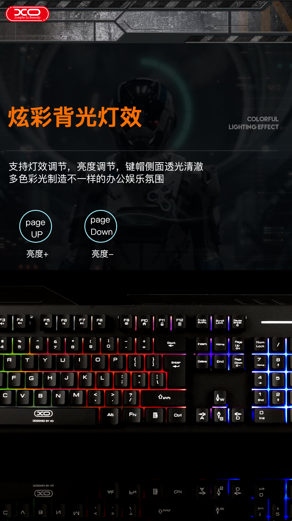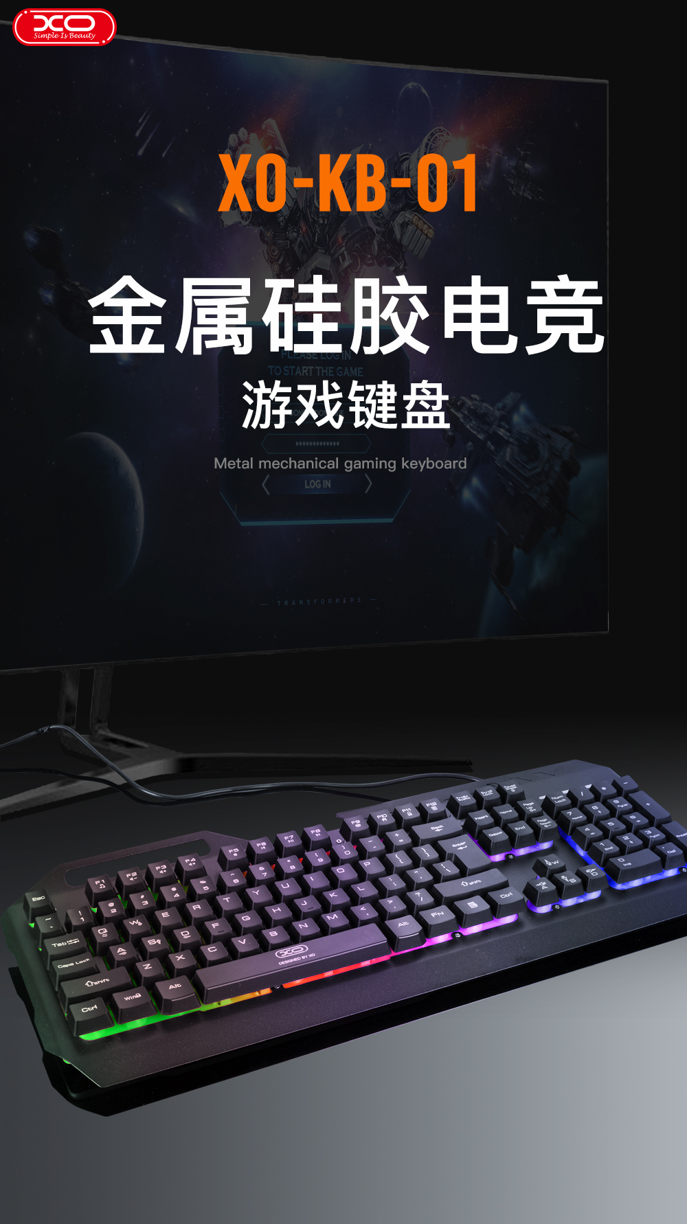 七彩灯光金属面板背光游戏键盘XO-KB-01 灰黑色