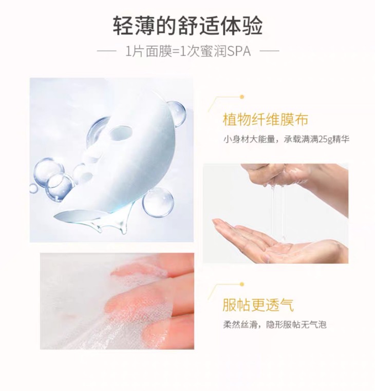 3、功效:孕妇、儿童、敏感肌都可以用,可以让你干涸的肌肤如遇春雨般滋润,一款安全的补水面膜,100%零添加,不含防腐剂以及任何对人体有害的化学物质,面膜精华中87%都是蜂蜜原液,适合任何类型的肤质。孕妇和小朋友都可以放心使用,尤其是敏感型肌肤哟~