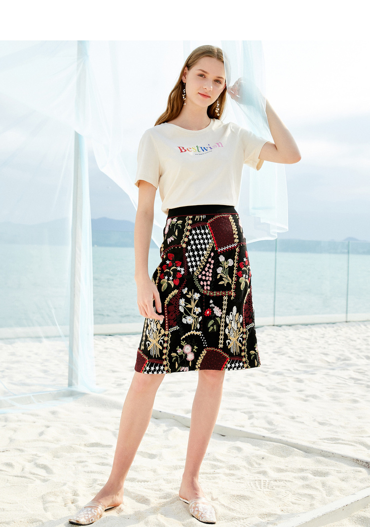 欧芮儿2019夏装新款黑色刺绣半身裙女显瘦中长裙包臀复古A字裙