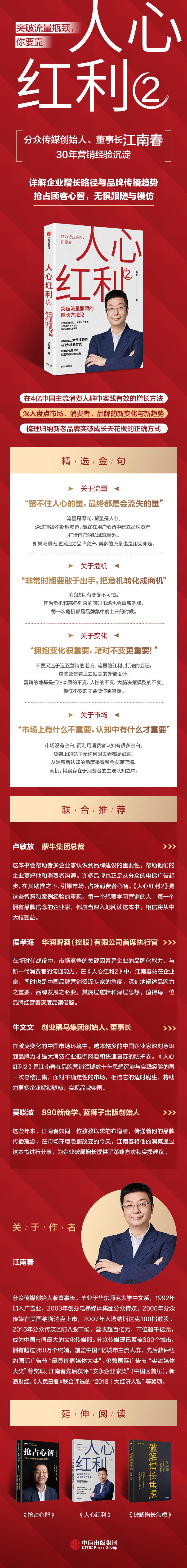 继《人心红利》《破解增长焦虑》之后,分众传媒创始人、董事长江南春再度执笔,将30年品牌营销经验沉淀而成的分众方法论完整分享,详解品牌传播的三大趋势,提出产品破圈、开拓场景、全域提升、区域攻坚四大品牌增长路径,帮助企业用确定性打赢不确定性,乘势而上,成为行业头部。