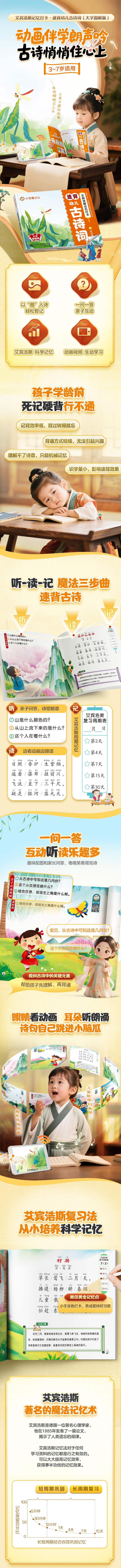 本书为幼儿古诗词类产品,专为3~7岁学龄前儿童设计,这一年龄段是孩子语言发展的黄金期,背诵古诗有助于培养国学启蒙,同时锻炼记忆力、提高表达力。本书全部采用四色印刷,插画活泼、生动,激发孩子记忆古诗的兴趣。本书特点:①学前儿童对译文的理解能力弱,先以图片引入,以读图的形式来理解古诗里的重点元素,不靠死记硬背,更符合这个阶段的儿童特点。②引入艾宾浩斯打卡的概念:遵循艾宾浩斯遗忘曲线所揭示的记忆规律,对所学知识及时进行复习,这种记忆方法即为艾宾浩斯记忆法。这种方法在儿童记忆单词、古诗等需要重复背诵的内容中应用较多,帮助孩子提高记忆效率,轻松背诗,同时养成复习的好习惯。③每一首古诗都配有相应的二维码,扫码后可听古诗朗诵音频,另外附赠实用书写视频,每日学习一个笔画或一个简单汉字,帮助幼儿奠定写字基础,顺利过渡一年级。