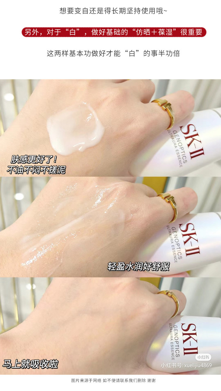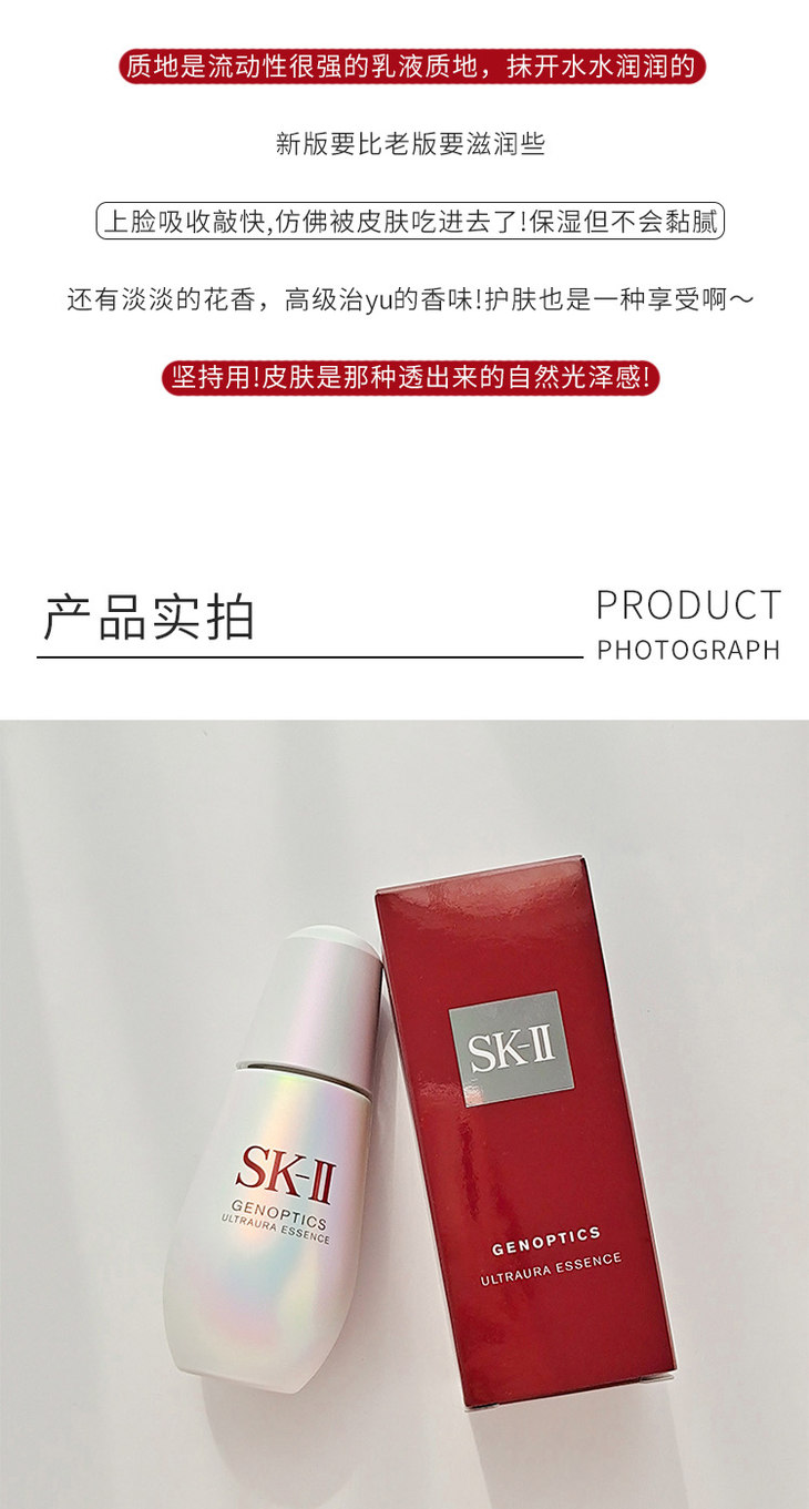 这次我们上的是升级后的荃新版本,经过七年精研革新技术打破四大链路镁白之路,抑黑+减黄+亢氧化,晶透光蕴开启肌肤光蕴力,白到“自发光”,焕白上市,让你GET闪闪发光“灯泡肌”。在外观上光晕镭射感更强,从旧版光面的瓶身变成了磨砂。名字也做了改变,从“AURA ESSENCE”变成了“ULTRAAURA ESSENCE”,代表了新升级不只是外观,更重要的是核心成分的升级。