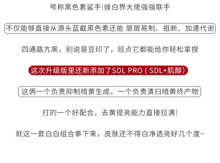 新一代的小灯泡精华相比上一代美白通路更全面,在原先改善暗沉、痘印的基础上新增了去黄配方,肌肤整体更通透、亮白效果更全面。去黄气和提亮方面,新添加了SDL Pro专研配方(SDL+肌醇),从源头抑制暗黄,对那些爱熬夜面色暗黄、没气色的肌肤有很好的改善效果,还原皮肤最真实的白净感。