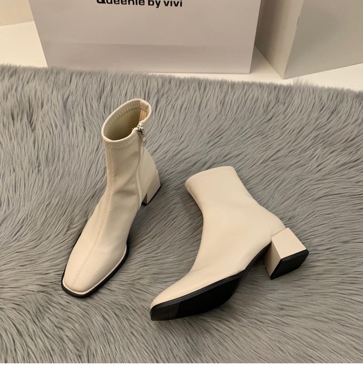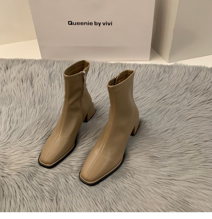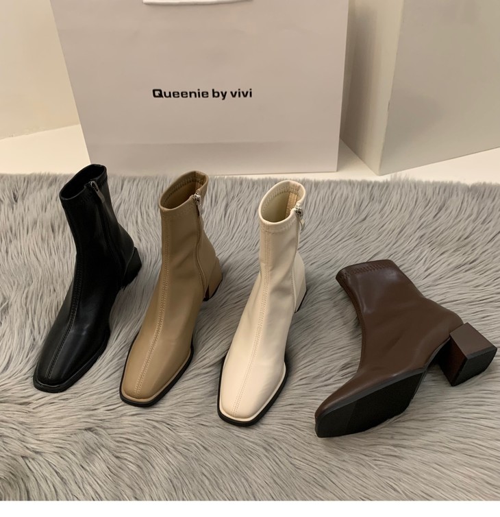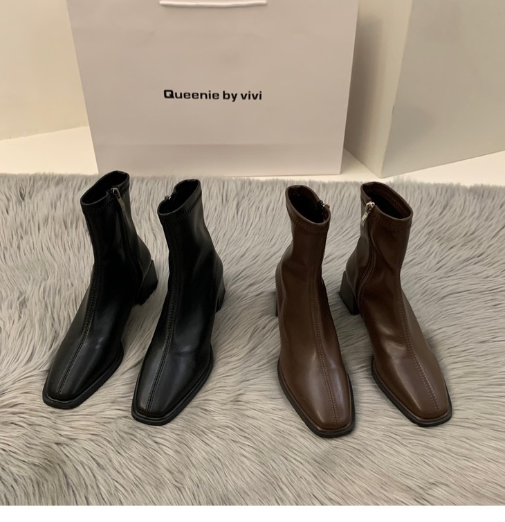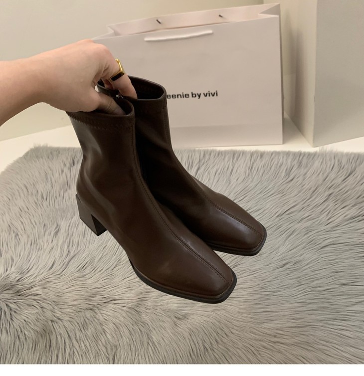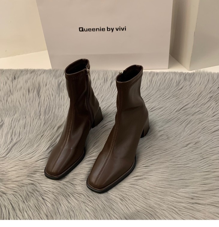 新款春秋季单靴棕色马丁靴子高跟方头瘦瘦法式小短靴女鞋