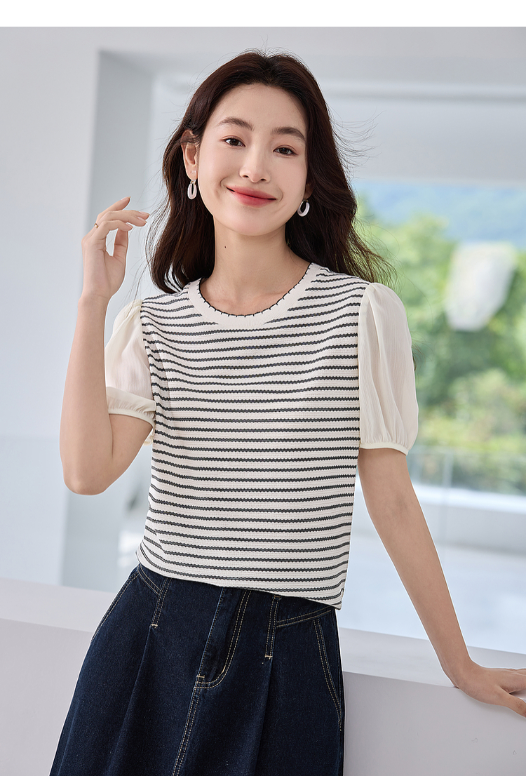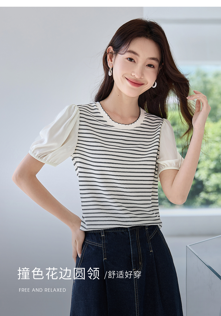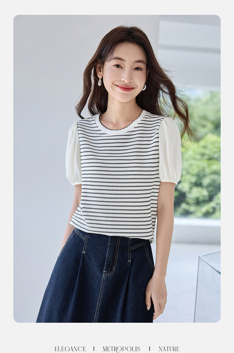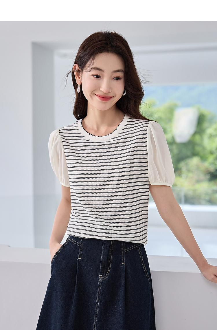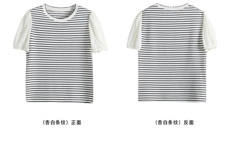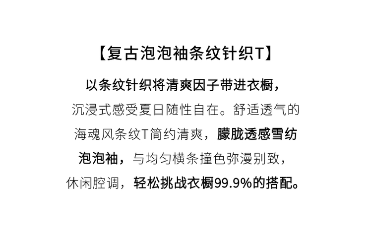 【专属特价】熙世界法式复古条纹针织T恤短袖夏新款宽松显瘦泡泡袖圆领上衣